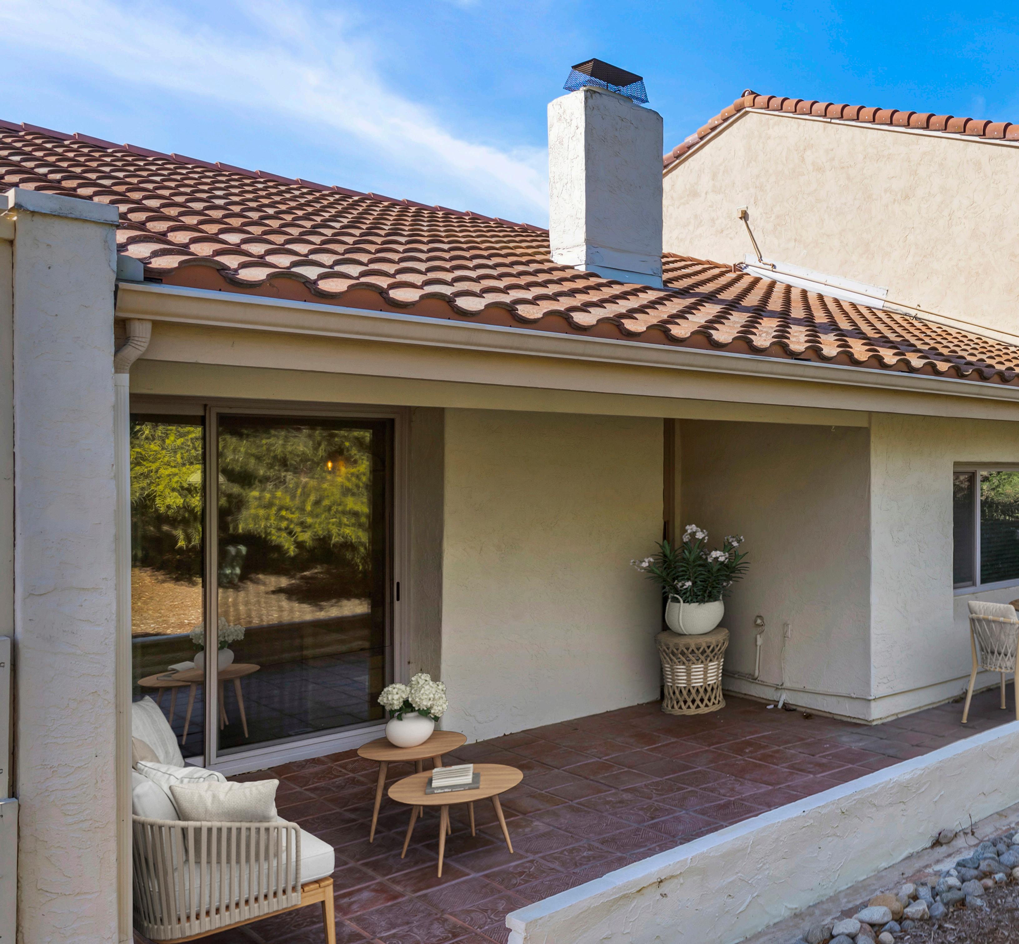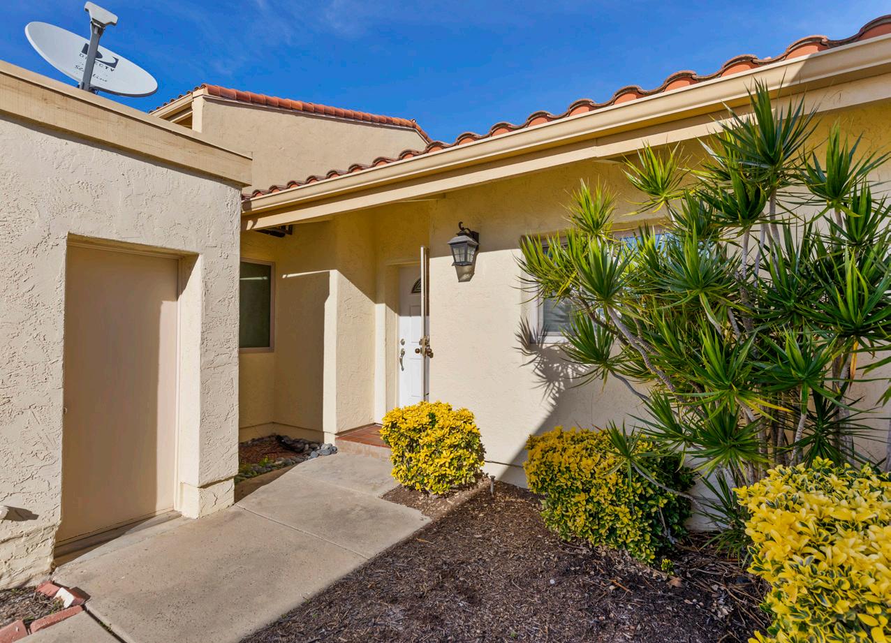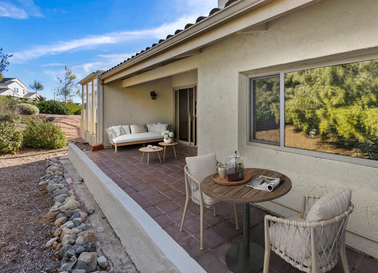 Nestled within the tranquil Stoneridge community of Poway, this beautifully updated single-story townhome offers an exceptional blend of architectural character and modern comfort. Soaring wood-planked, beamed ceilings create an immediate sense of warmth and volume, while the thoughtfully renovated kitchen showcases quartz countertops, designer cabinetry, stainless steel appliances, and generous storage. The expansive living and dining areas are filled with natural light and enhanced by luxury vinyl plank flooring, all centered around a timeless brick fireplace. Oversized dualpane sliding doors extend the living space outdoors to a private tiled patio overlooking a serene desertscape hillside—perfect for relaxing or entertaining in peaceful surroundings. Inside, two generously sized bedrooms provide ideal separation and comfort, each featuring walk-in closets. The primary suite impresses with cathedral beamed ceilings, dual-sink vanity, extensive cabinetry, and a custom-organized walk-in closet. Additional highlights include recessed lighting, skylight, central air conditioning and heat, dual-pane windows, ceiling fans, and an attached direct-access garage with washer and dryer hookups. Residents enjoy access to a sparkling pool and spa, ample guest parking, and an HOA that covers water, trash, sewer, roof and exterior maintenance, and common area care. Ideally located within the highly regarded Poway Unified School District, this home offers close proximity to shopping, golf courses, Bernardo Winery, Lake Poway, and an abundance of scenic hiking and biking trails.