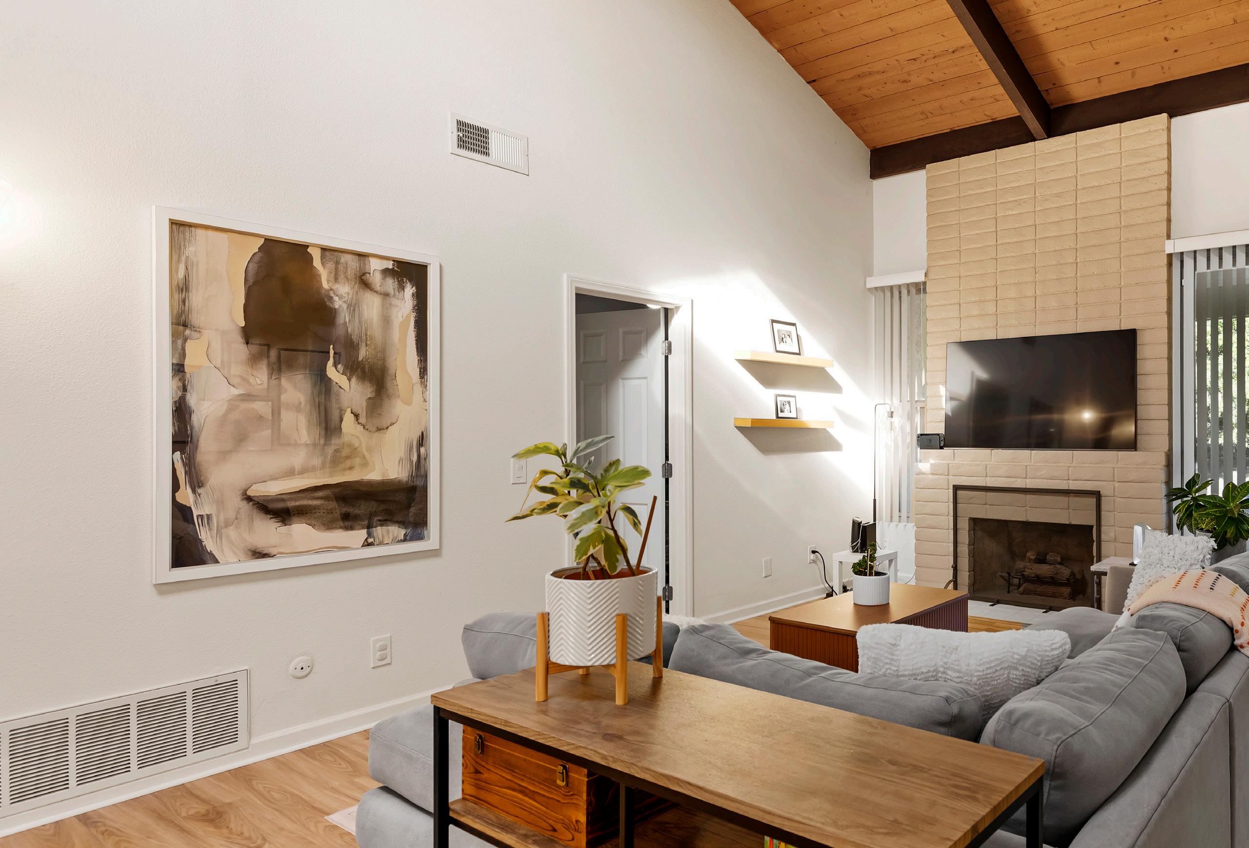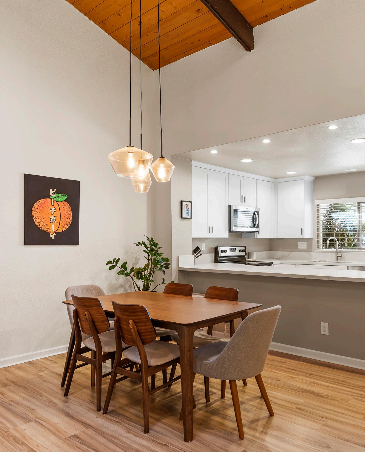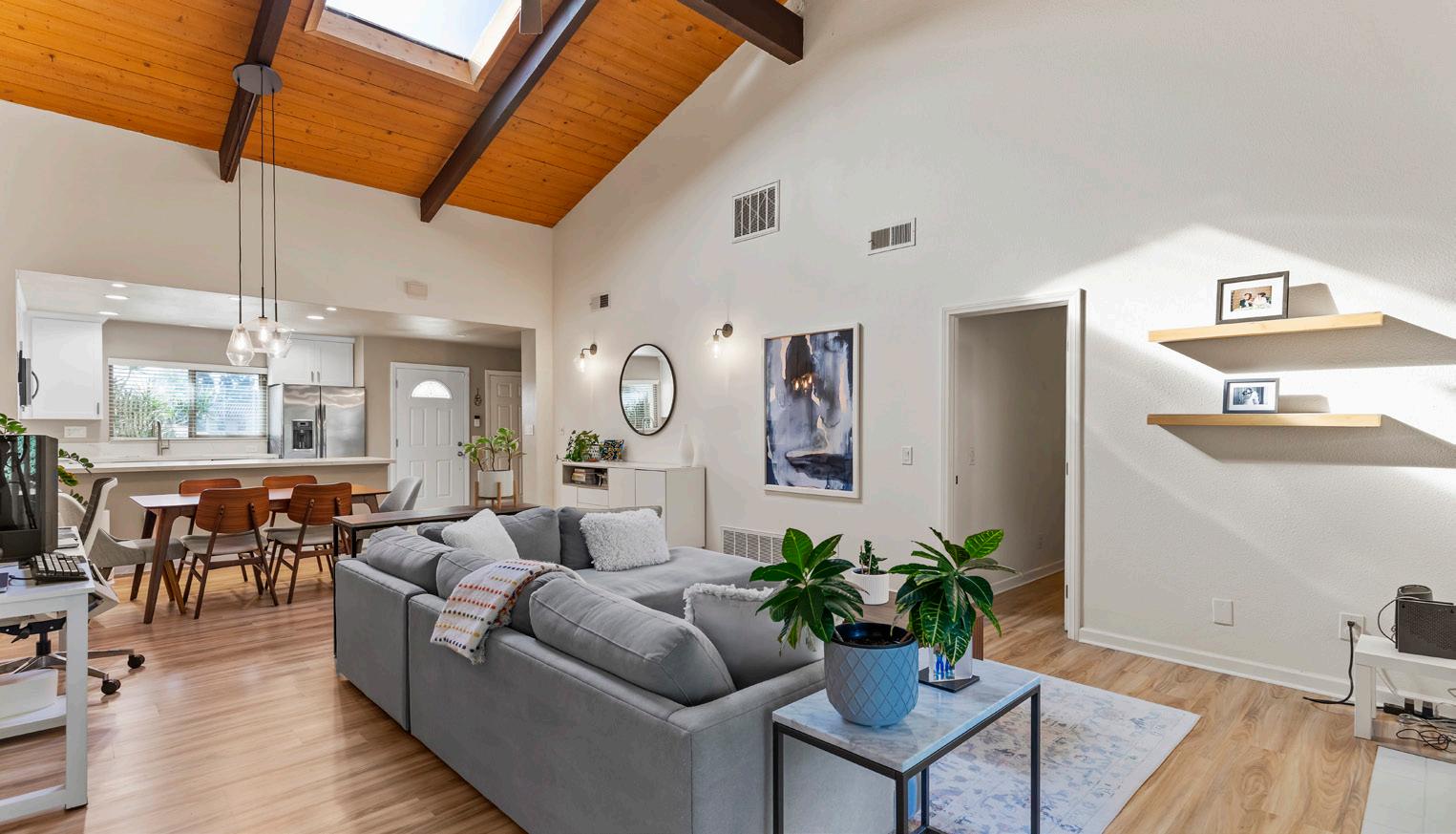 Nestled within the tranquil Stoneridge community of Poway, this beautifully updated single-story townhome offers an exceptional blend of architectural character and modern comfort. Soaring wood-planked, beamed ceilings create an immediate sense of warmth and volume, while the thoughtfully renovated kitchen showcases quartz countertops, designer cabinetry, stainless steel appliances, and generous storage. The expansive living and dining areas are filled with natural light and enhanced by luxury vinyl plank flooring, all centered around a timeless brick fireplace. Oversized dualpane sliding doors extend the living space outdoors to a private tiled patio overlooking a serene desertscape hillside—perfect for relaxing or entertaining in peaceful surroundings. Inside, two generously sized bedrooms provide ideal separation and comfort, each featuring walk-in closets. The primary suite impresses with cathedral beamed ceilings, dual-sink vanity, extensive cabinetry, and a custom-organized walk-in closet. Additional highlights include recessed lighting, skylight, central air conditioning and heat, dual-pane windows, ceiling fans, and an attached direct-access garage with washer and dryer hookups. Residents enjoy access to a sparkling pool and spa, ample guest parking, and an HOA that covers water, trash, sewer, roof and exterior maintenance, and common area care. Ideally located within the highly regarded Poway Unified School District, this home offers close proximity to shopping, golf courses, Bernardo Winery, Lake Poway, and an abundance of scenic hiking and biking trails.