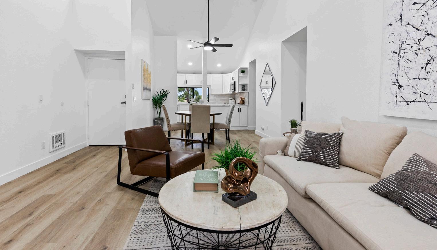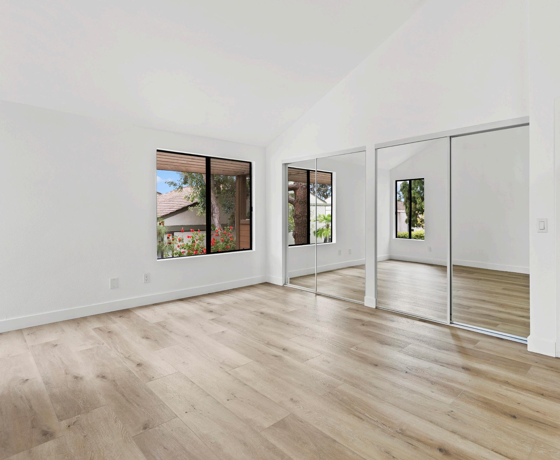 Stunning remodeled top-floor 2-bedroom unit in highly sought-after University City! This home features an open, spacious floor plan with vaulted ceilings, fresh paint, luxury vinyl plank flooring, recessed lighting, and ceiling fan. The upgraded kitchen boasts custom cabinetry, quartz countertops, tile backsplash, and stainless steel appliances. Remodeled bathrooms come with designer fixtures, and the unit offers abundant natural light, ample storage, and expansive closet space. Enjoy the convenience of a one-car epoxy garage, an additional parking space, and a sizable balcony perfect for relaxation or outdoor gatherings. Community amenities include a sparkling gated pool and guest parking. Close to UTC Mall, UCSD, pristine beaches, and easy freeway access, this is a must-see opportunity!