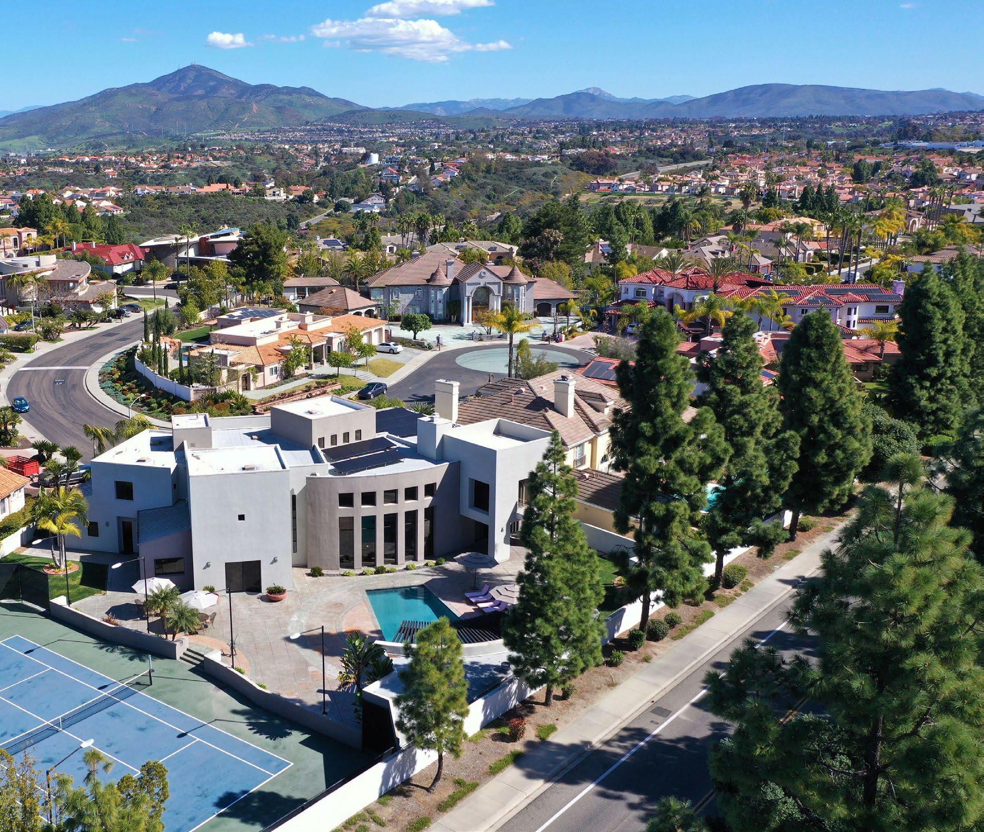 This gorgeous contemporary custom executive estate, boasting 7,724 square feet of luxurious living space, offers an unparalleled resort-style lifestyle within the prestigious gated community of Belmonte in Rancho Del Rey. Situated on a spacious half-acre lot, this extensively remodeled residence showcases exceptional indoor and outdoor amenities. The backyard oasis is an entertainer’s dream, featuring a sparkling pool and spa, a built-in BBQ area with a veranda, and an illuminated tennis court. Discover six bedrooms, six full baths, two half baths, and an additional full bath conveniently located near the pool area, along with a separate downstairs living area, a library, and maid’s quarters. Travertine and wood flooring, extensive wood built-ins, and Pella windows enhance the home’s elegant interior. A striking glass railing at the top of the stairs creates an open and bright ambiance, reflecting professional designers’ meticulous attention to detail. Enjoy yearround comfort with four zoned A/C units and benefit from energy efficiency with 30 owned solar panels. This prime location offers convenient access to diverse shopping, dining, recreational parks, and entertainment options.