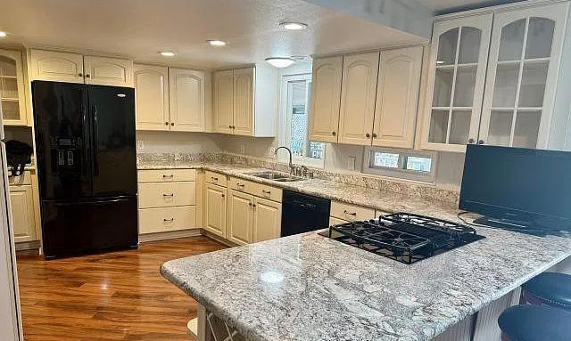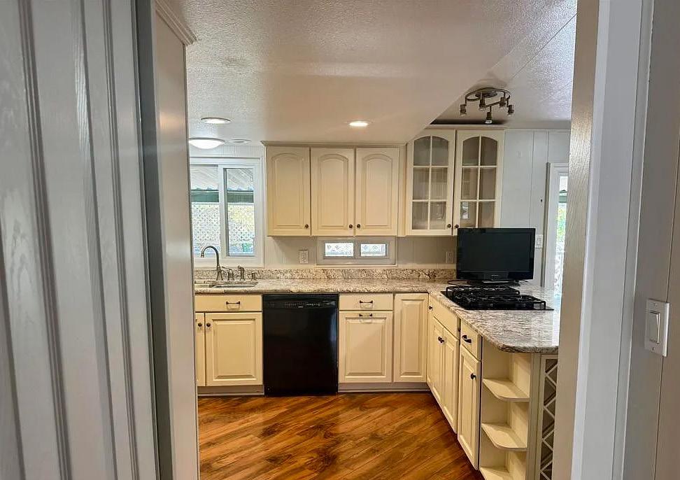 Beautiful, Spacious Manufactured Home - Built in 1990 - Highly Upgraded w/Laminate Flooring throughout - Double wide front doors lead to mirrored foyer which steps into Estate sized Living Room w/Vaulted wood beam accented ceilings, & formal dining room. Gorgeous Top Grade Granite Counter Tops & Newer Kitchen Cabinetry & Appliances. Glass door cabinetry w/wine racks & soft close kitchen drawers.