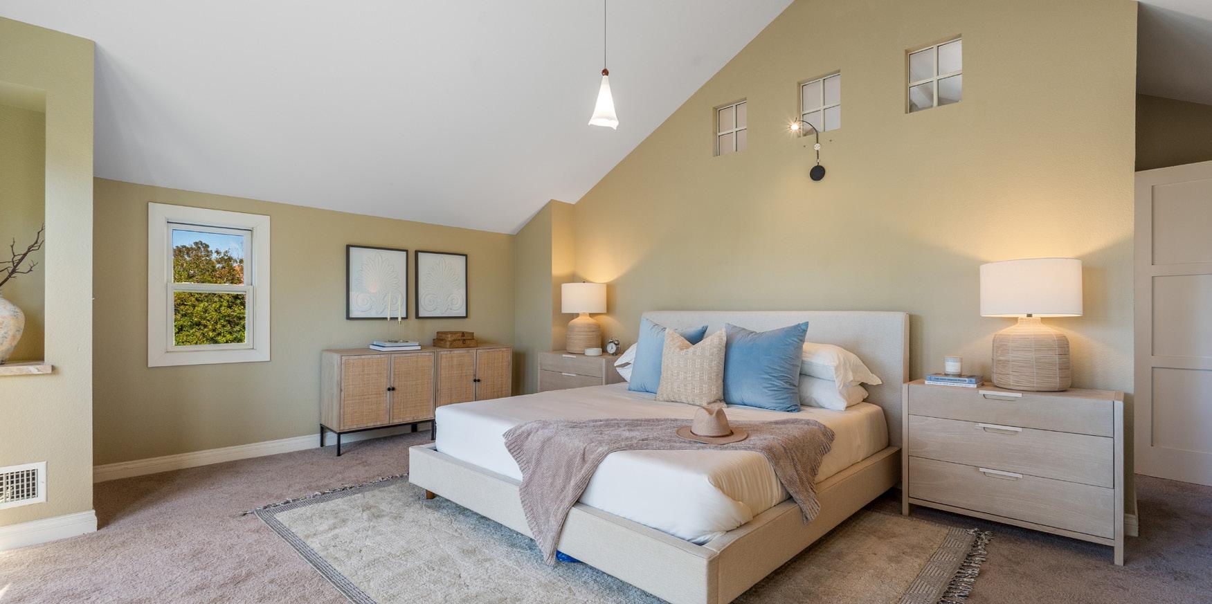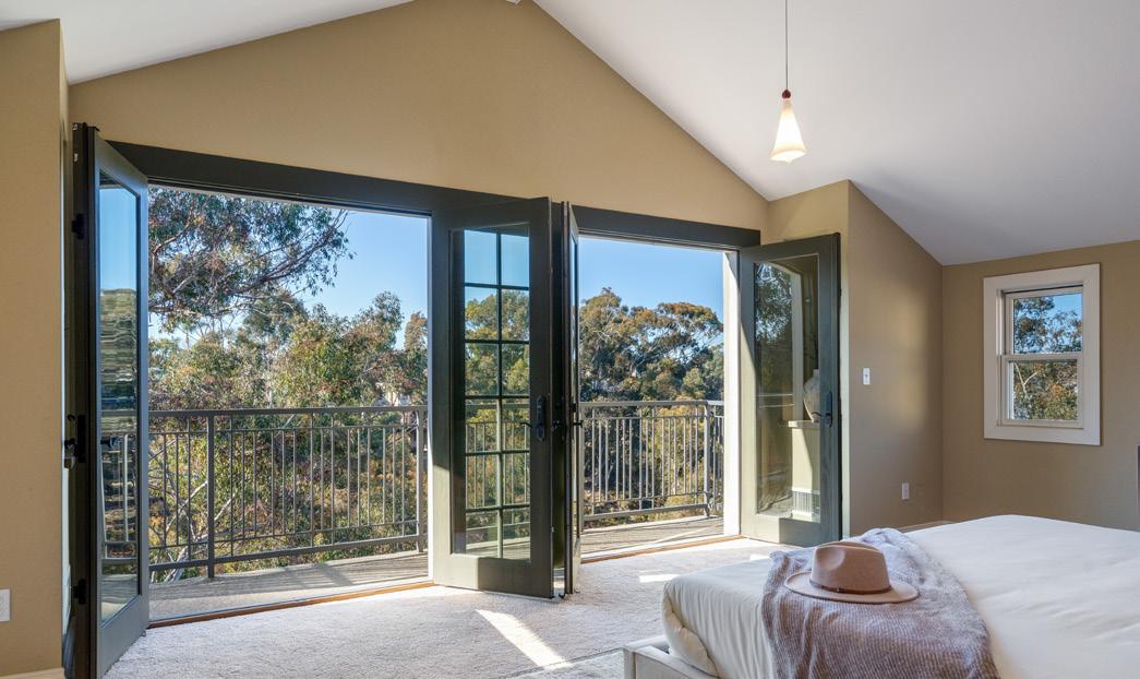 The luxurious primary bedroom opens onto its own private canyon-side deck on the second floor. The suite contains a spacious bathroom with a large walk-in shower and oversized bathtub in addition to a large walk-in closet with built-in cabinetry.