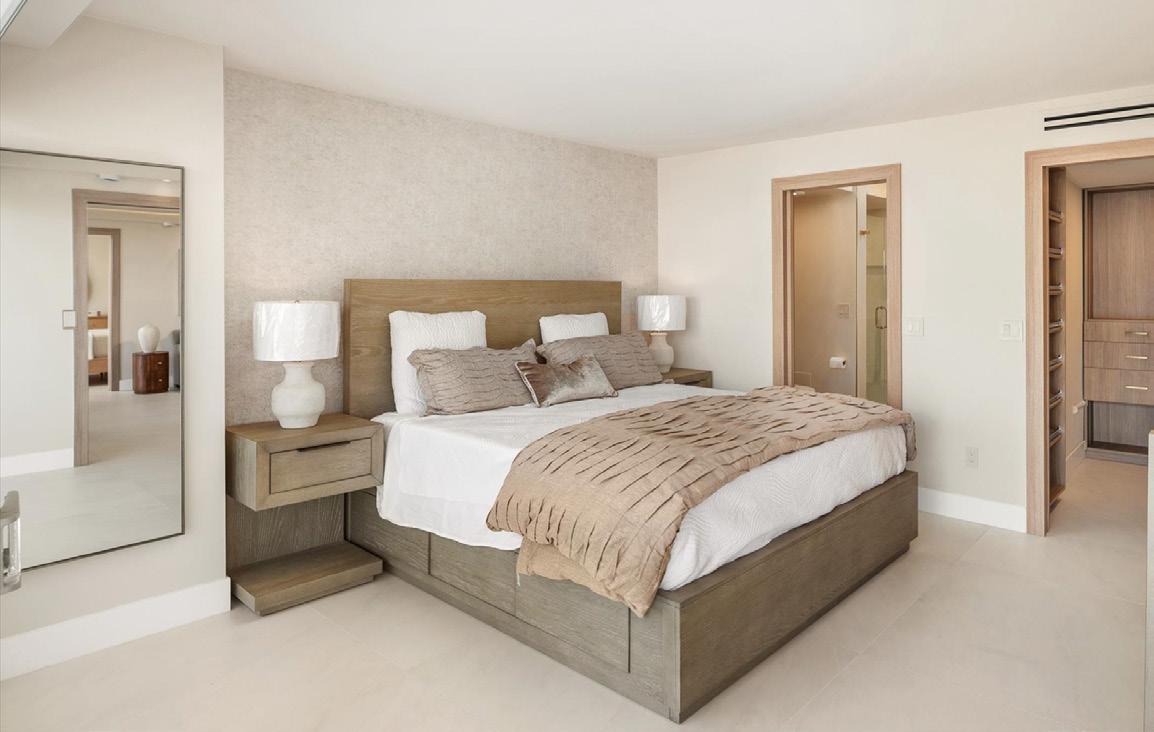 A brand-new, never-lived-in masterpiece designed by Michael Roy and custom built by Yaz Kadra, with Saraay Remodeling, offering breathtaking bay & city skyline views. Impeccably crafted with high-end finishes, appliances, and fully custom furnishings, this residence has been meticulously reimagined, down-to-the-studs, with new electrical, plumbing connections, HVAC, and ducting systems. Upon entering, you’ll be greeted by an immediate sense of spaciousness, with split bedrooms designed to maximize the stunning views through extra wide custom pocket doors. Experience the elegance of 48 x 48 imported Porcelain tile flowing out to the balcony. The 9ft non-dropped ceilings enhance the sense of space, while smart storage solutions maximize organization. A culinary haven, the kitchen features custom European cabinetry, top-of-theline, trendy white glass appliances and the timeless sophistication of 3” Quartzite Taj Mahal counters. Designer walk-in closets are illuminated by ambient LED lighting. A newly added versatile den, perfect for a home office or guest suite, features a custom-sized bed with integrated storage.
