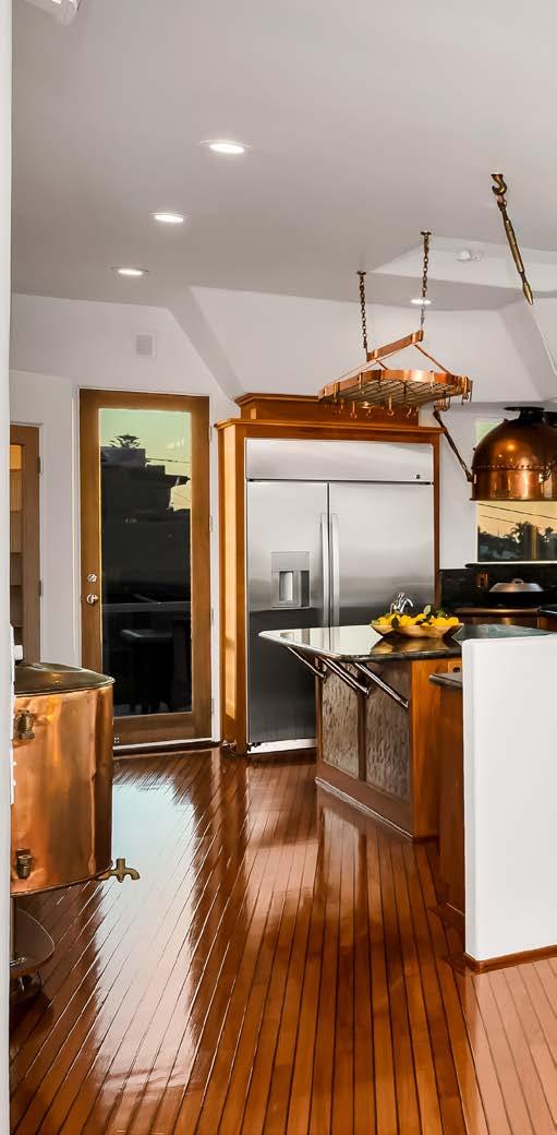 This architectural masterpiece is rich in high-end custom finishes, including a repurposed bronze channel marker buoy transformed into a dramatic light fixture above the main stairwell, along with accents of copper, brass, bronze, stainless steel, and teak. Highlights include a custom bar in the downstairs living room, exceptional outdoor living spaces, and a rooftop deck with a jacuzzi offering breathtaking 360-degree ocean-to-mountain views. Upstairs, the open and airy floor plan is filled with natural light and features an unforgettable gourmet kitchen with a repurposed copper smokestack from a decommissioned naval ship as the stovetop hood, custom solid teak cabinetry, repurposed teak yachtdeck flooring, a new 24-bottle wine cooler, and a dining and family room with mesmerizing ocean views.