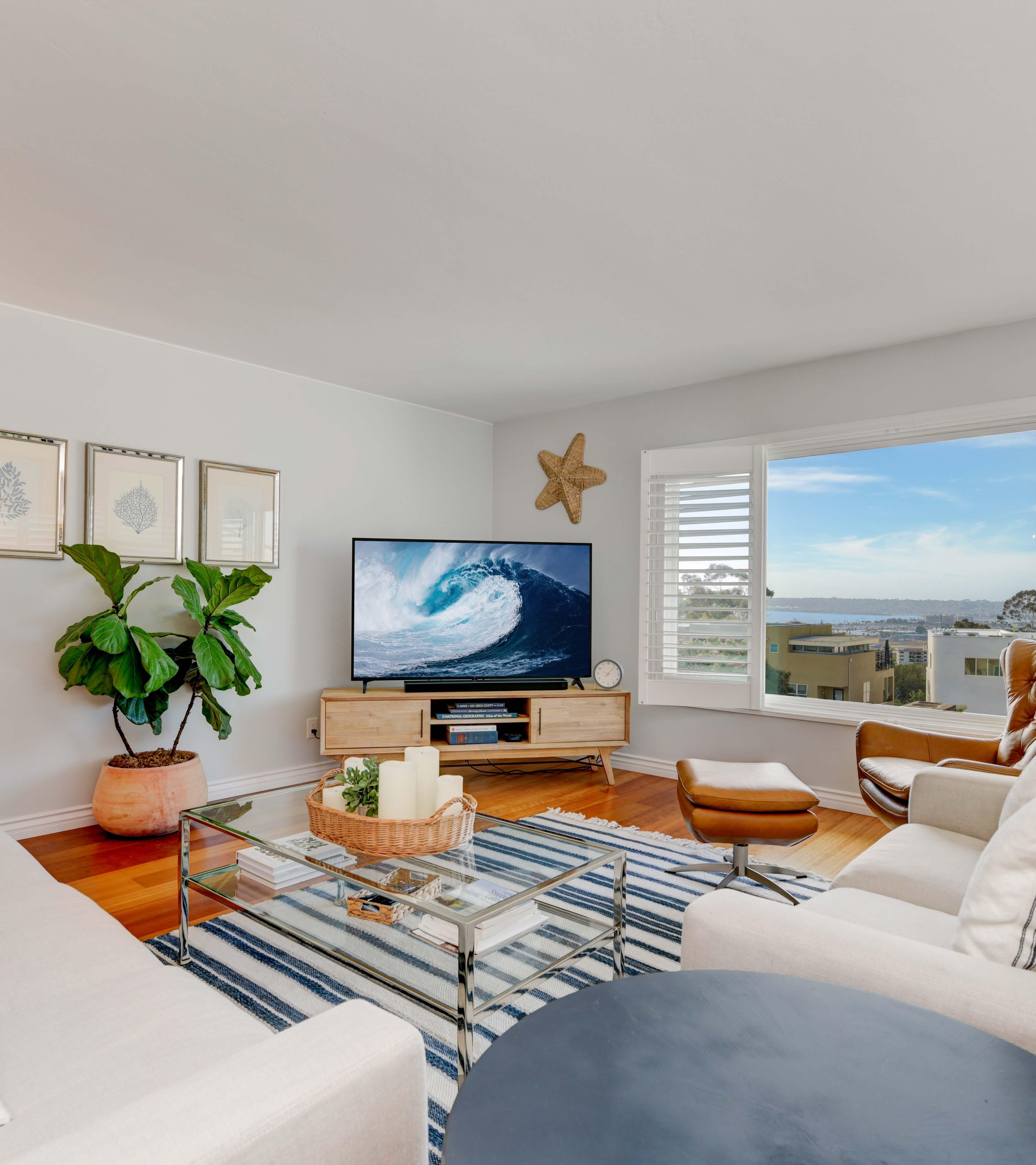 Epic sunsets and forever views to the bay & ocean from every room. Updated kitchen with granite, stainlesssteel appliances, custom butcher block island, and cabinetry with spacious pantry. Expansive floor plan with newer windows. Brilliant hardwood flooring throughout. Full HVAC and W/D in unit. Ample-sized bedrooms; primary features 2 closets, large vanity, and mid-century motifs. This residence offers plenty of storage, both in the unit and in the secured parking garage below. Sparkling, turn-key unit with nothing to do but move right in! Private, quiet and charming complex features a rooftop deck with panoramic views, gas grill and firepit. Low HOA’s, walkable to Bankers Hill, Little Italy & Hillcrest.