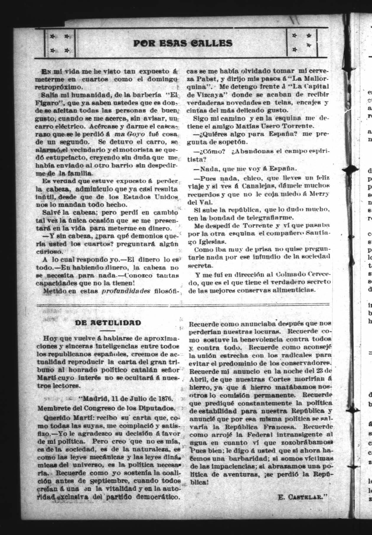- Hoy que vuelve á hablarse de aproximaciones y sinceras inteligencias entre todos los republicanos españoles, creemos de actualidad reproducir la carta del gran tribuno al honrado político catalán señor Martí cuyo interés no se ocultará á nuestros lectores.