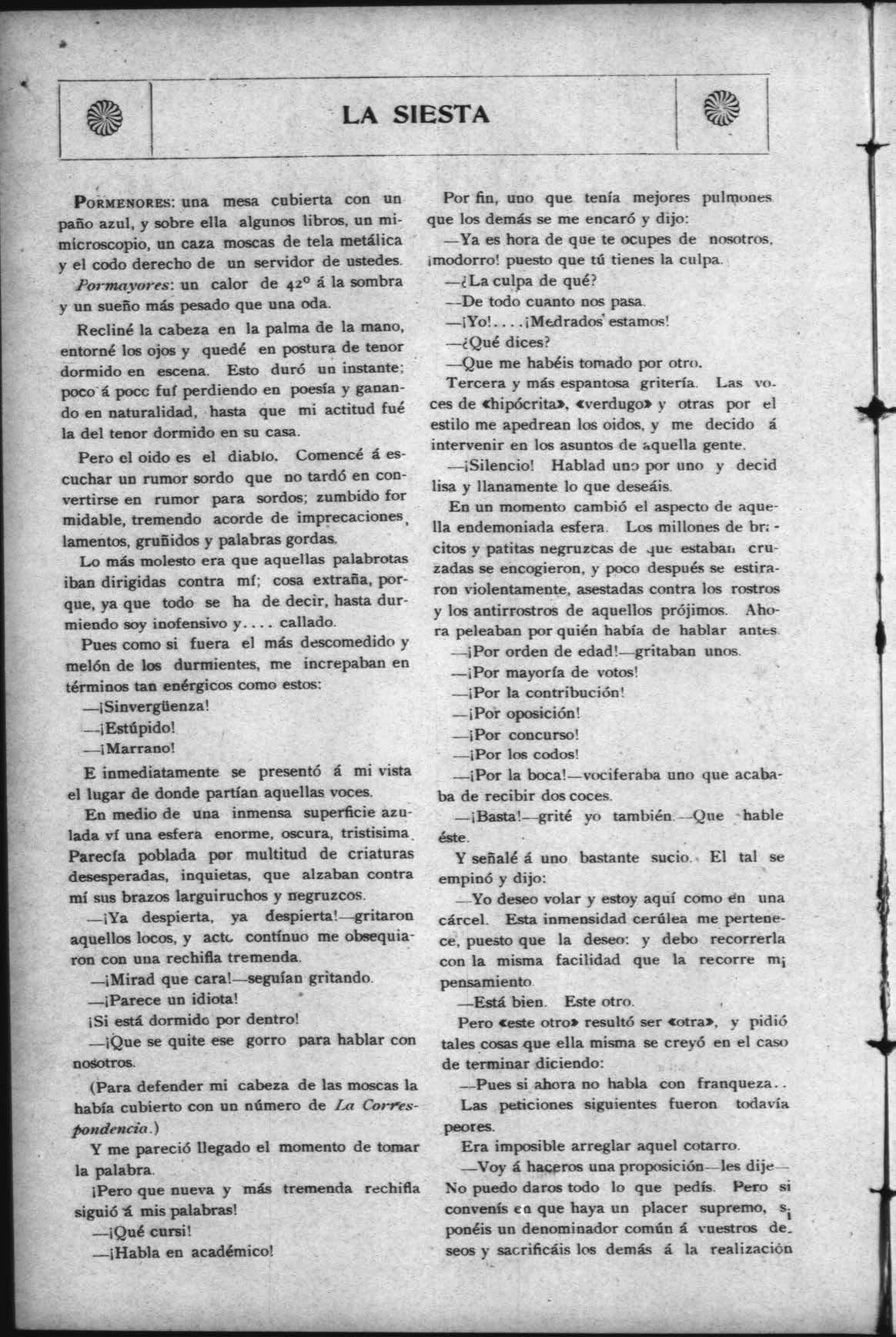 Recliné la cabeza en la palma de la mano, entorné los ojos y quedé en postura de tenor dormido en escena. Esto duró un instante; pocoá pocc fuf perdiendo en poesía y ganando en naturalidad, -hasta que mi actitud fué la del tenor dormido en su casa.
