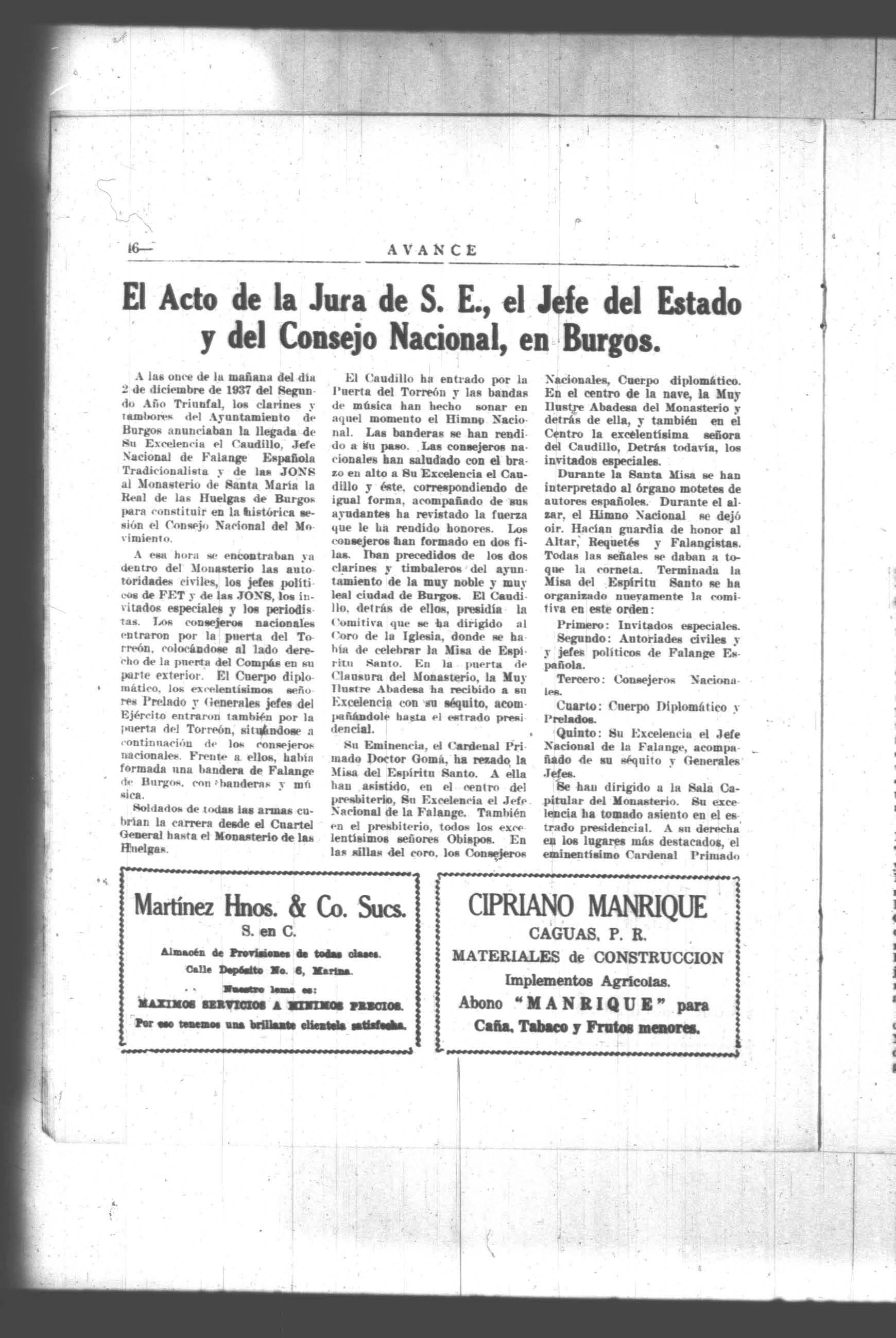 tanto queremos. Allá los rojoscon sús tácticas que tratan de lo-grat sus propósitos con la ca-lumnia, el engaño y el terror. Lahistoria señalará a los actualeslíderes rojos como los responaa-bles de la paralización del pro-greso de la humanidad. Porque,pongamos por ejemplo, ¿qué sa-caba Azaña con decir como dijoen el 1931, que España había de-jado de ser católica? Pues in-trodacir una discordia más efec-tivaen su pueblo ya que afecta-ba los sentimientos enraizados enlas doctrinas del cristianismo queni mil Azañas podrán destruir.