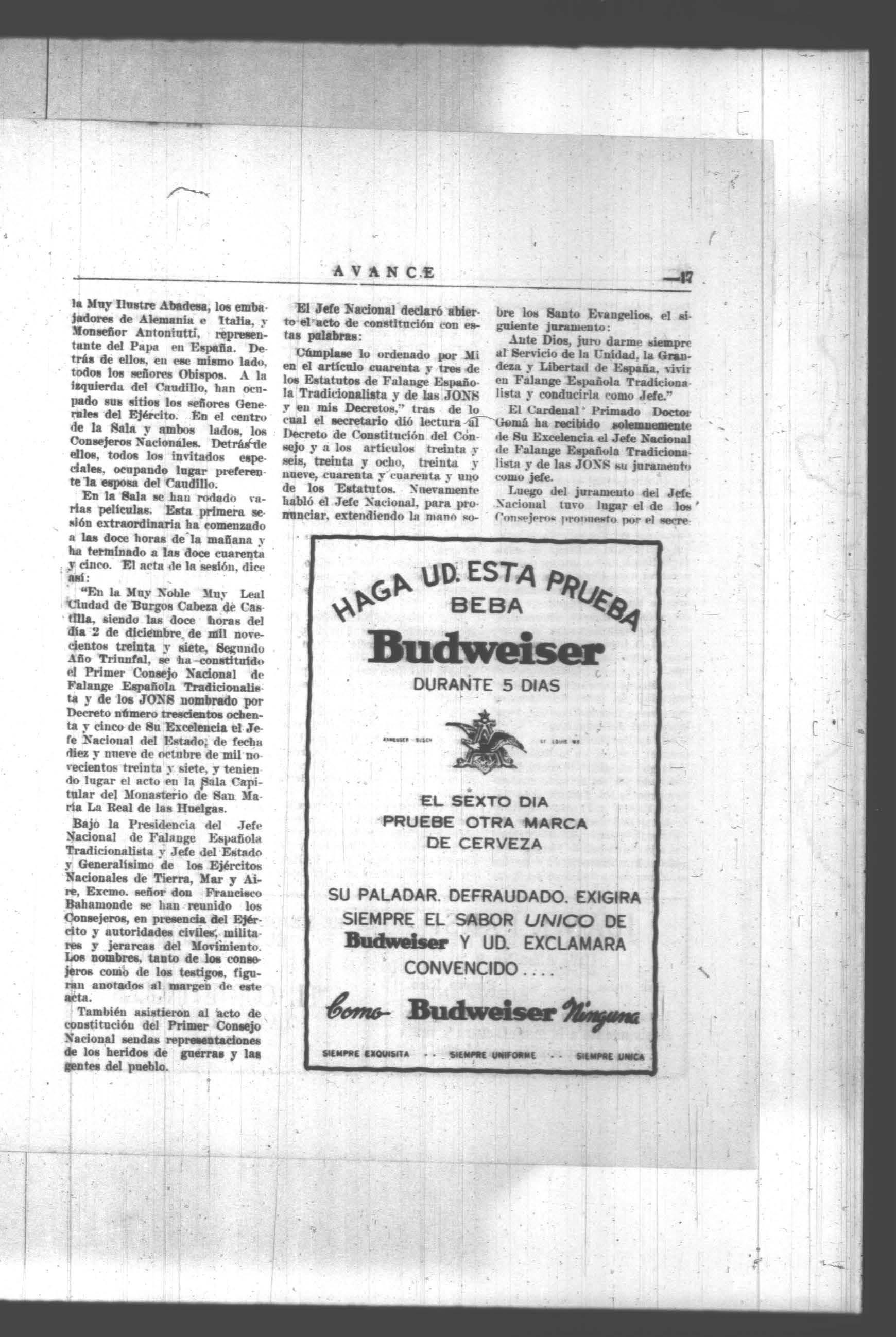 En la Muy Noble Muy LealCiudad de Burgos Cabeza de Cas-tilla, siendo las doce hhoras del día 2 de diciembre de míil nove-dentos treinta y siete, SegundoAño Triunnfal, se ha -constituidoel Primer Consejo Nacional de Falange Española Tradicionalis:ta y de los JONS nombrado por Decreto número trescientos ochen-ta y cinco de Su Excelencia el Jefe Nacional del Estado: de fecha diez y nueve de octubre de mil no vecientos treinta y siete, y teniendo lugar el acto en la Bala Capitular del Monasterio de San María La Real de las Huelgas.