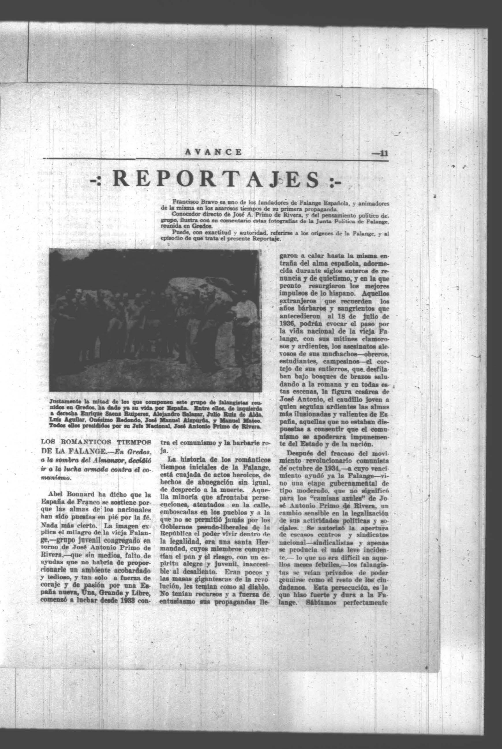 te del Estado y de la nación. Después del fracaso del movi. miento revolucionario comunista de octubre de 1934, a cuyo vencimiento ayudó ya la Falange vino una etapa gubernameñtal de tipo moderado, que no significó para los camisas aztles de José Antonio Primo de Rivera, un cambio sensible en la legalización de sus actividades políticas y sociales. - Se anmtorizó la apertura de escasos centros y sindicatos nacional sindicalistas y apenas se producía el más leve incidente. lo que no era difícil en aquellos meses febriles, los falangistas se veían privados de poder ;eunirse como el resto de los cindadanos. Esta ión, es la que hizo fuerte y dura a la Falange. Sábinmos perfectamente