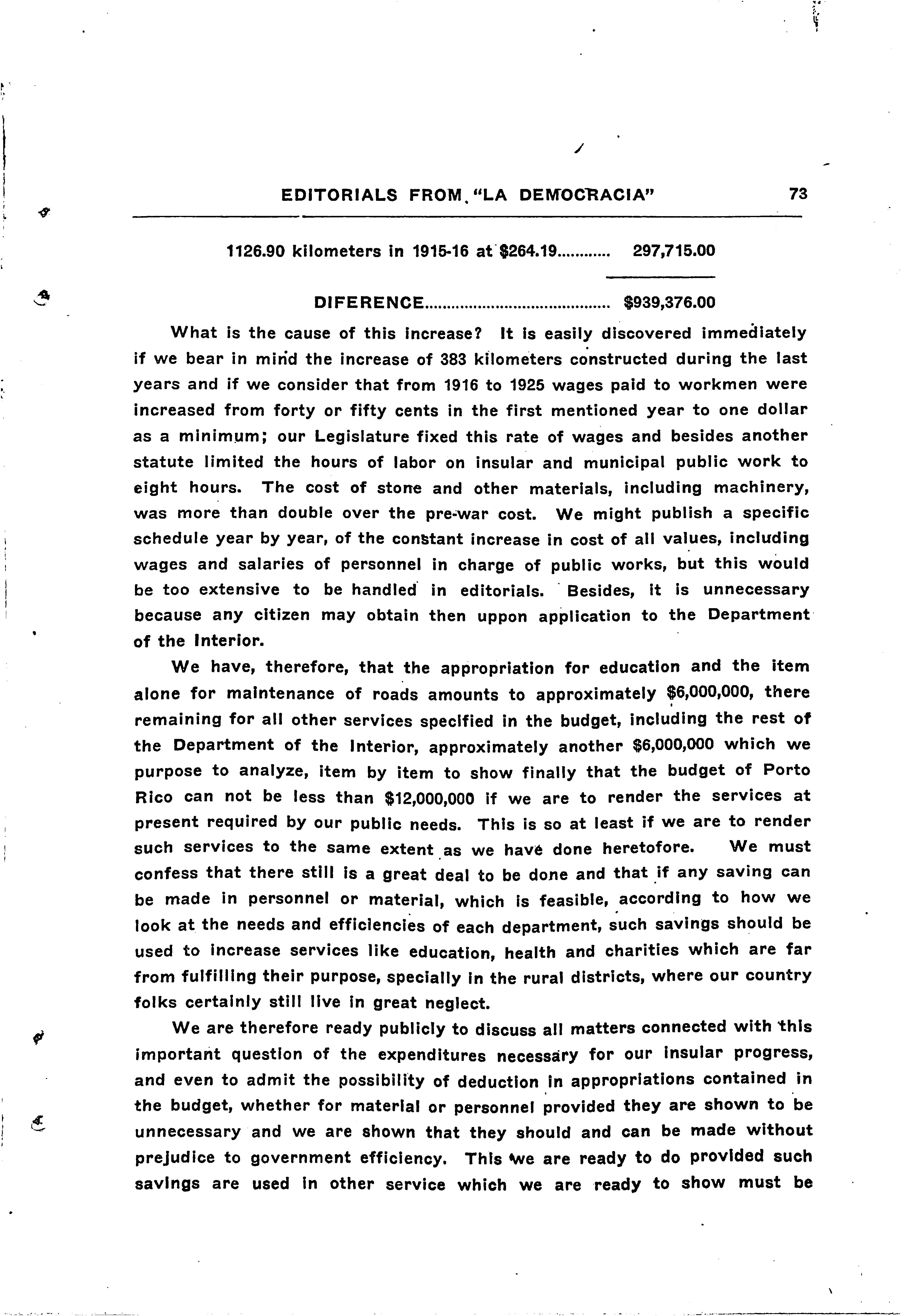 The above mentíoned paper charges our Government with being a spendthríft; with havíng Increased the taxes; with having constructed shool buildings to an excess; with having approved loans for road construction; with having forestad the agricultura! and industrial development of our Island In every respéct; with giving to our needy and poor youth a competent Uníversity permittlng them to secura their education without leaving the Island, and so many other public reforms tending to ralse the standard ol living of our proletaríat.