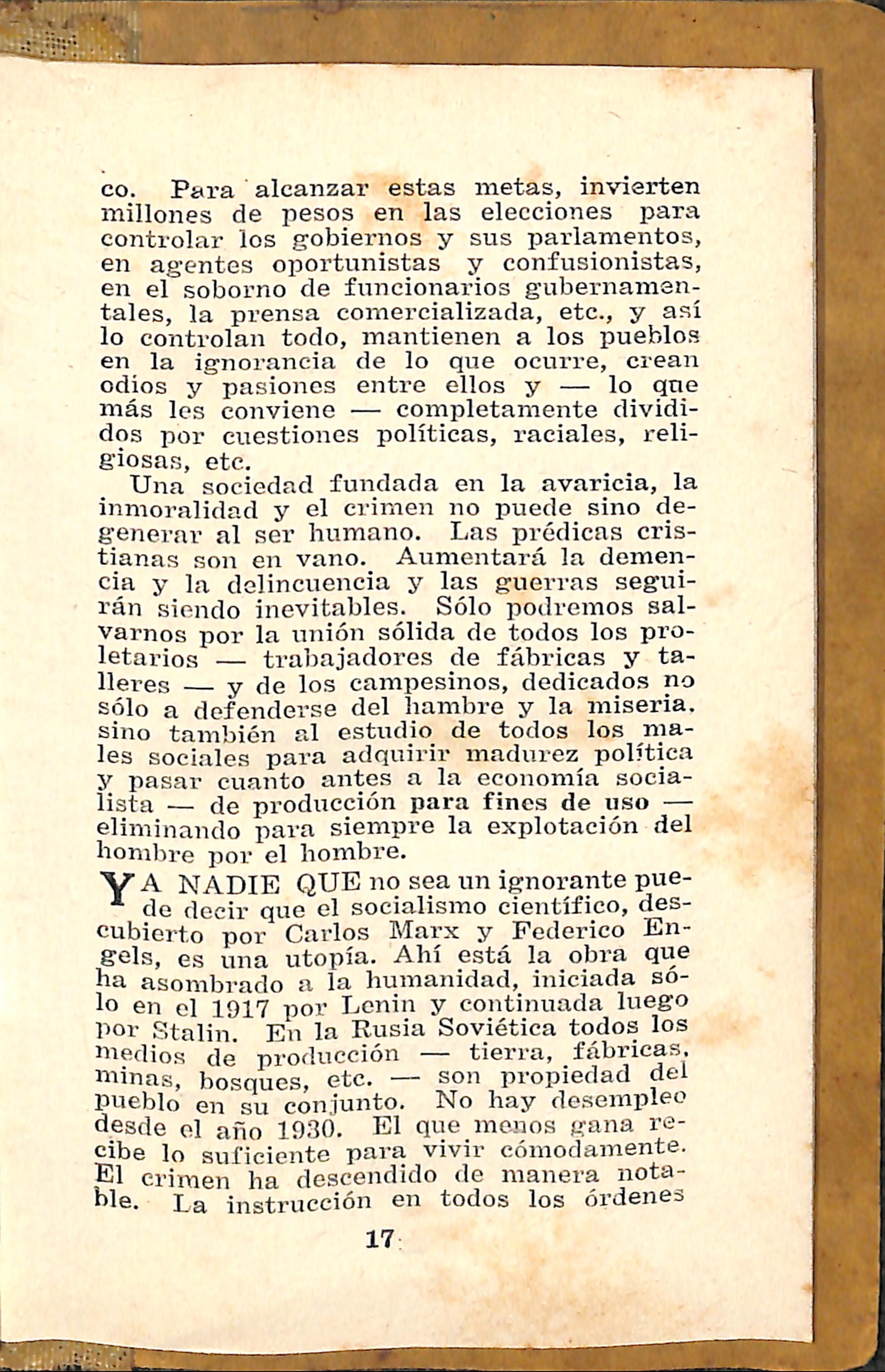Y A NADIE QUE no sea un ignorante puede decir que el socialismo científico, des cubierto por Carlos Marx y Federico Engels, es una utopía. Ahí está la obi-a que ha asombrado a la humanidad, iniciada so lo en el 1917 por Lenin y continuada luego por Stalin. En la Rusia Soviética todos los medios de producción — tierra, fábricas, minas, bosques, etc. — son propiedad del pueblo en su conjunto. No hay desempleo desde el año 193Ó. El Que menos gana re cibe lo suficiente para vivir cómodamente. El crimen ha descendido de manera nota ble. La instrucción en todos los órdenes