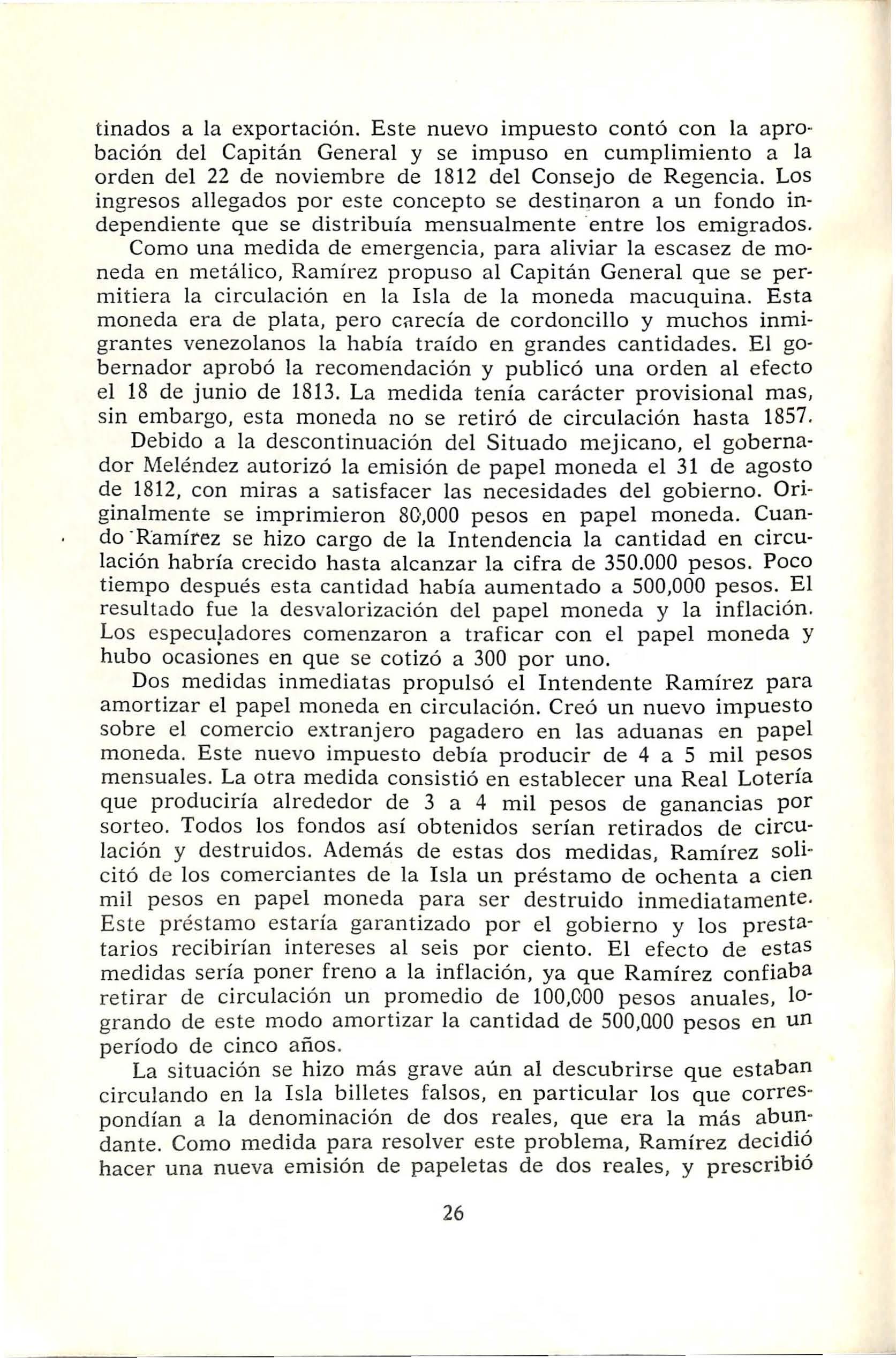 A pesar ele q ue los pla nes trazados por el I ntendente establecía n u n período de cinco años para la am or tización tota l, e n ab ril de 1816, previo a su partida de Puerto Rico , Ramírez había lo grad o amortizar Ja t otalidad de los 50 0 ,0 00 pes os.