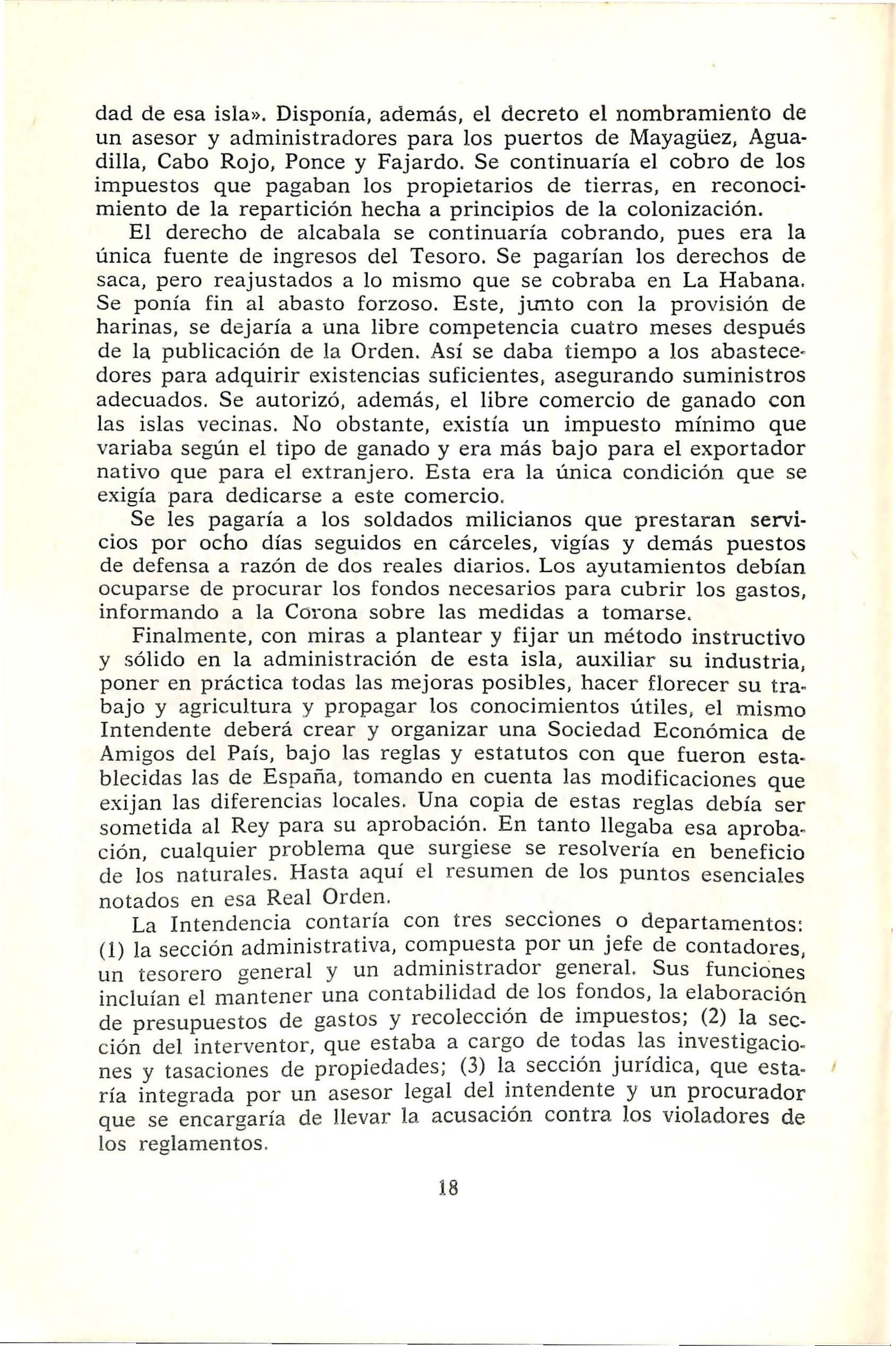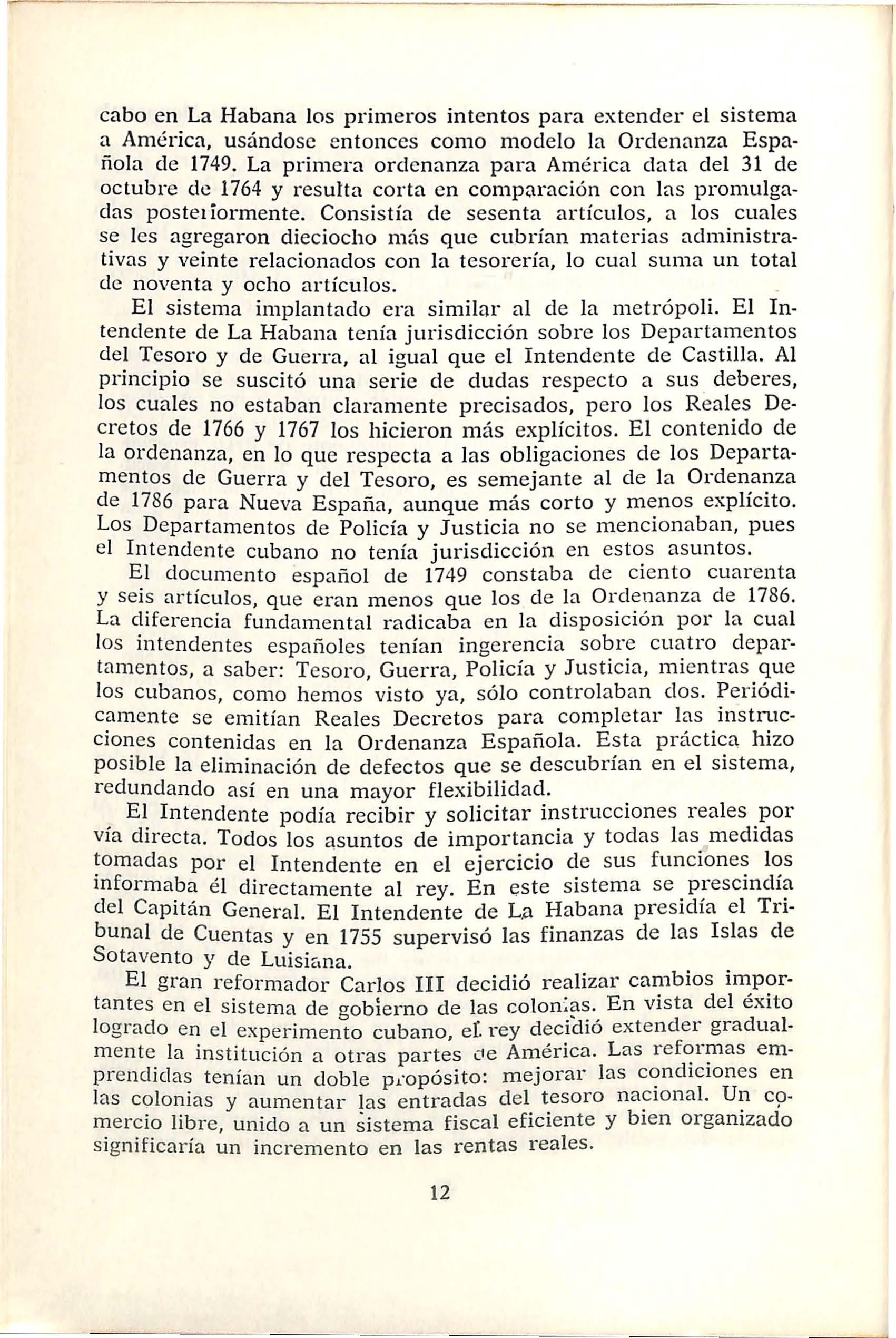 El docum en to españo l de 1749 constaba d e c i ento cuarenta Y seis artículos, qu e eran menos que los de la Ordena nza ele 1786. La difer e ncia fundamental radicaba en la disposición por la cual lo s intendentes españoles t e nían ing ere ncia sobre cuatro departam e ntos, a saber: T esoro, Guerra, Policía y Justicia, mientras que los cubanos, como hemos visto ya, sólo controlaban dos. Periódicamente se emitían Reales Decretos para completar las instn1cciones contenidas en la Ordenanza Española. Esta práctica hizo posible la eliminación de defectos que se descubrían en el sistema, redundando así en una mayor flexibilidad.
