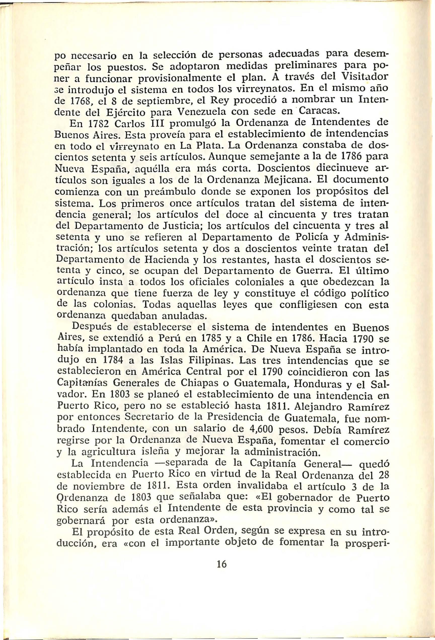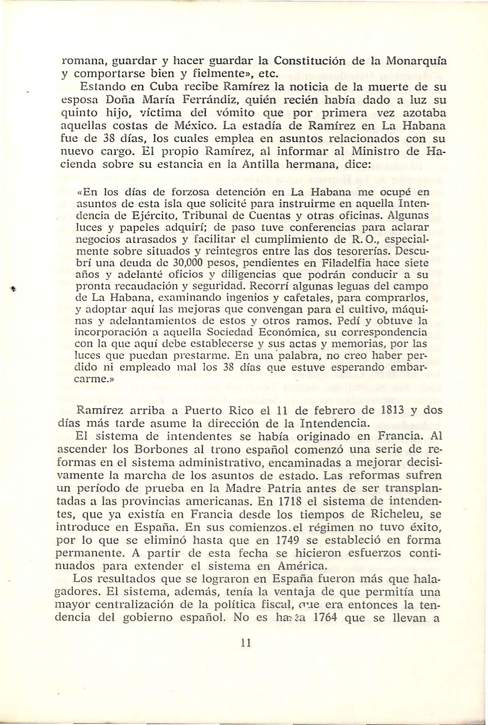 Ramfrez arri b a a Puerto Rico el 11 de febrero de 1813 y dos día s más tarde asume la dirección de la Intendencia. El sistema de inte ndent es se había originado en Francia. Al a scender los Bar b ones al trono español comenzó una serie de reformas en el s ist e m a adm inist rativo, encaminadas a mejorar decisiva m ente fa marcha de los asu n tos de estado . Las reformas sufren un período ele prueba en la Madre Patria antes de ser transplanta d as a las provincias americanas. En 1718 el sistema de intendentes, que ya existía en Francia desde lbs tiempos de Richeleu, se introduce en España. En sus comienzos. el régimen no tuvo éxito , por lo que se eliminó hasta que en 1749 se estableció en forma permanente. A partir de esta fecha se hicieron esfuerzos continuados para extender el sistema en América.