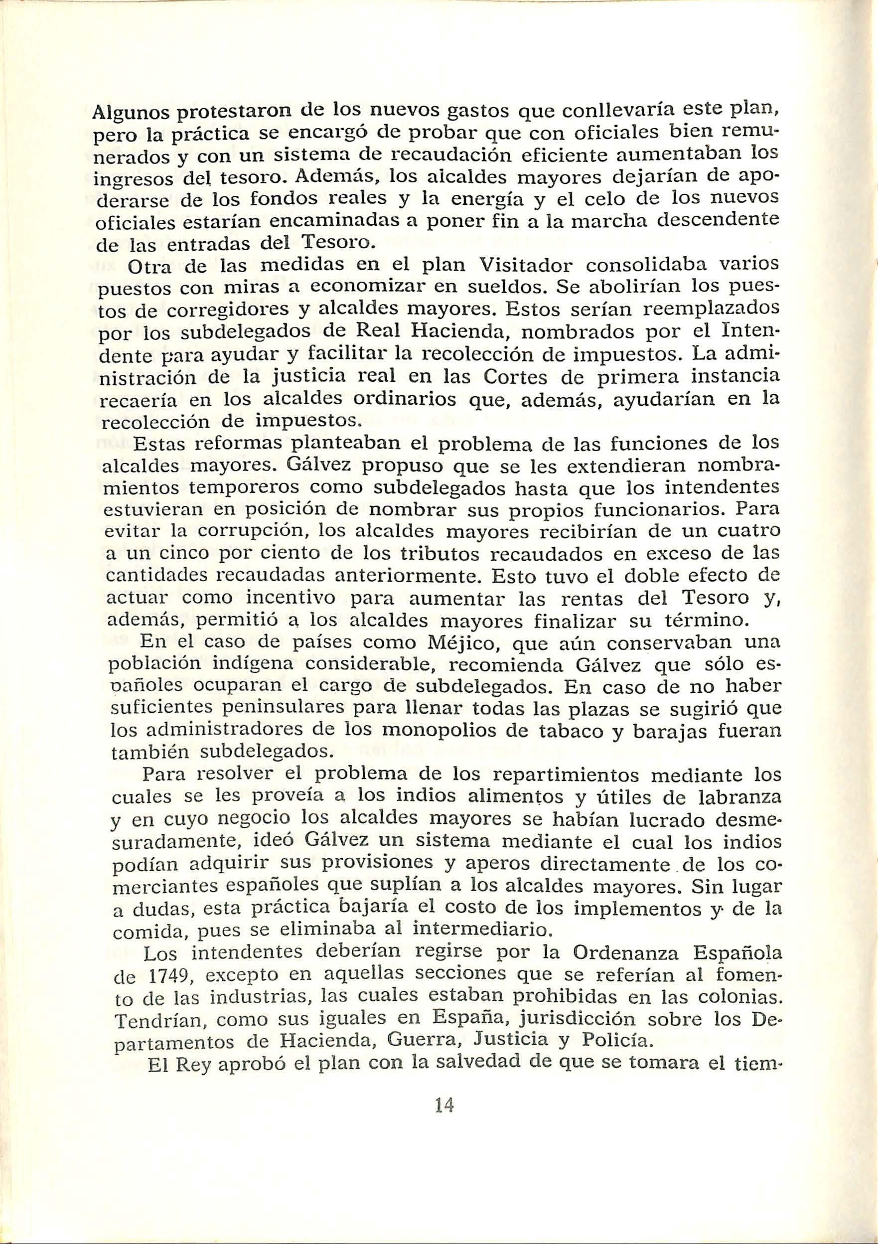 Para obtener información de primera fuente sobre la situació n americana, Carlos envía a José Gálvez en calidad de Visitador General. Este funcionario real desempeñó un papel importantísimo en el programa de reformas propulsado por el monarca. Nombrado Intendente de! Ejército, Gálvez fue a México con el propósito de establecer allí el sistema de intendencia y, a la vez, instruir a los funcionarios que ocuparían los cargos por crearse. En su informe, señala que los mejicanos eran tan ignorantes que llamaban superint e ndentes a subalternos administrativos. Gálvez discutió con el Virrey el plan para las intendencias de Nueva España y lo aprobó el 15 ele enero ele 1768. El informe ele Gálvez es un documento interesantísimo y lleno de atinadas sugerencias. El Visitador opinaba que el sistema ele intendencias había traído tantos beneficios a España, que debía implantarse en las posesiones de la Corona a la mayor brevedad. Por otro lado, no fueron pocos los americanos que se opusieron a un sistema que tendía a hacer la administración de las provincias similar a la de la Madre Patria. Preferían estos opositores la perpetuación del viejo sistema . Otros adoptaron una actitud muy pesimista, pues pensaban que nada de lo que se hiciese cambiaría las condiciones imperantes. Gálvez creía firmemente que la única manera de poner fin a la corrupción de los oficiales r ea les y los alcaldes mayores era mediante el establecimi e nto ele la intend e ncia. El Int e ndente podría relevar al Virrey de muchas de sus funciones administrativas. Se hací a imposible que el Virrey pudiese atender la inmensa carga administrativa, e specialmente cuando no contaba con subalternos preparados. Los funcionarios públicos se preocupaban más por hacerse pronto ricos que por desemteñar sus cargos adecuadamente. El aumento poblacional fue otro factor que multiplicó los probl emas administrativos. A pesar de que los r eye s habían adoptado la práctica de mandar visitadores, éstos no venían con la bastante frecuencia para asegurar un funcionamiento eficiente de la maquinaria de gobierno.