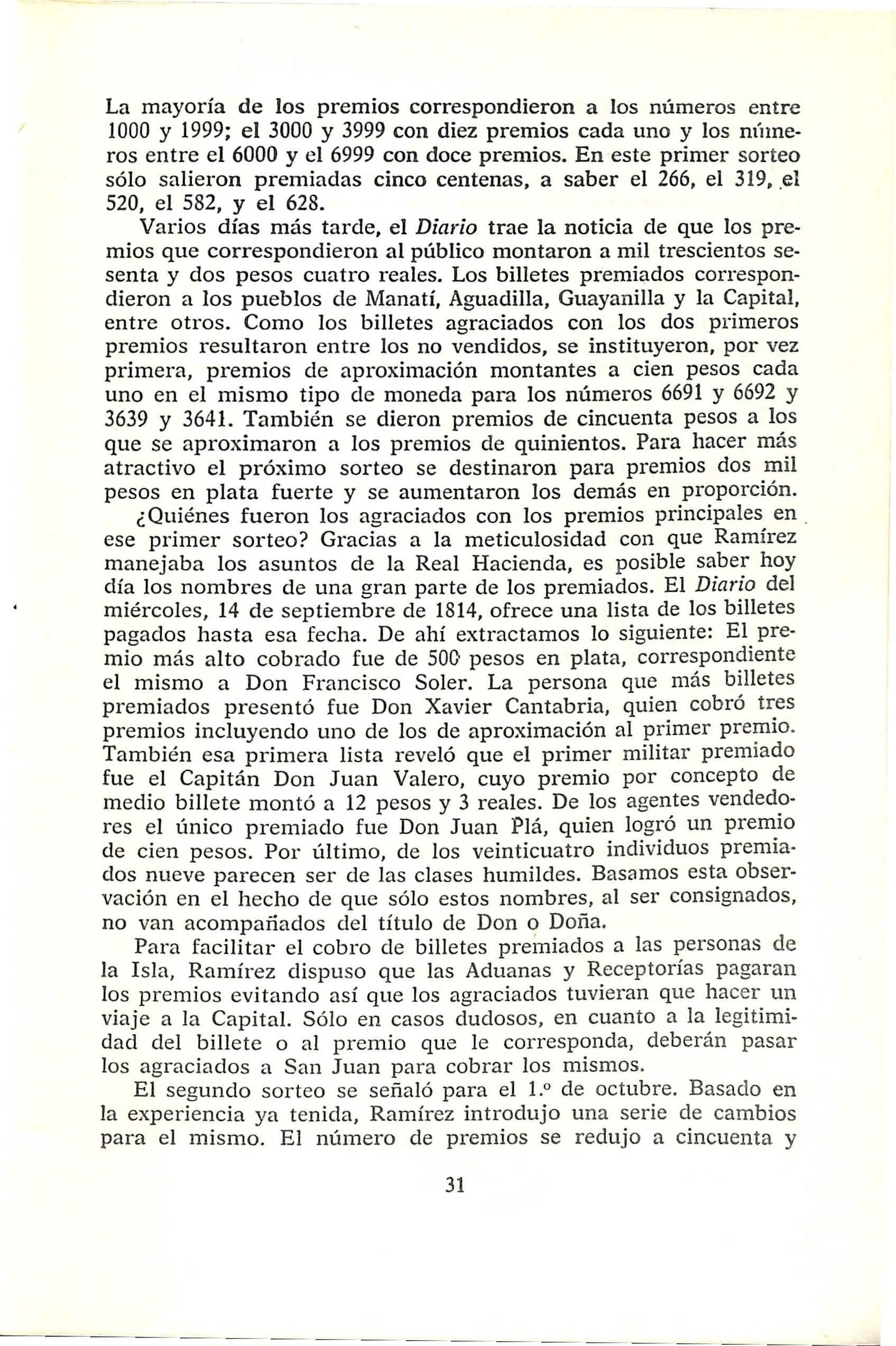 mm1stros de la Real H acienda , Don Jua n Patiñ o y Do n J os é de Bacen e r, se indica que en e l segundo sorteo «Sa t isfechos t odos l o s premios y los gastos.. . quedan a beneficio d e la Loter ía, y p a ra la amortización de l pape l moneda ochocientos diez pesos y cinc o y medio reales ». Para e l cua r to sorteo se señal a que e l mismo se efectua rá el sábado , 3 de diciembre, pero se añade más ade l ante qu e «atendiendo al escaso ex pendio de billetes, y a l cambio actu al del pape l moneda a la plata se diferir á e l sorteo si en e l dí a señalado no se han expedido a lo menos cuatro m il pesos en billetes». En cuanto a los premios para ese cuarto sor t eo se retendría el primer premio d e mil pesos en plata, e l cua l -según e l a viso Y considerando la tasa, de cambio prevaleciente- equival ía a 3 ,000 pesos e n pape l moneda. Los mil pesos res t an t es se dividiría n en pr e mio s menore s de l a misma especie, es decir , pape l moned a Coincid e con la estad ía de Ramírez e n Pue r to Rico e l establ ecimiento de l primer r é gimen constituciona l , conforme a lo d i spuesto en la Constitución de 1812. Uno de los organismos que s e crean es l a Diputación Provincial. Cumplido e l proceso prepar atorio y celebradas las elecciones, la Primera Diputación celebró su sesión inaugural el 5 de mayo de 1813 a las 9 : 30 de la mañana e n la Sal a Capitular de la Ciudad de San Juan. Alejandro Ramírez , como Intendent e , era miembro d e est e cue r po y participó acti vam e nt e e n l a s sesiones celebradas durante los años 18 13 y 18 14 .