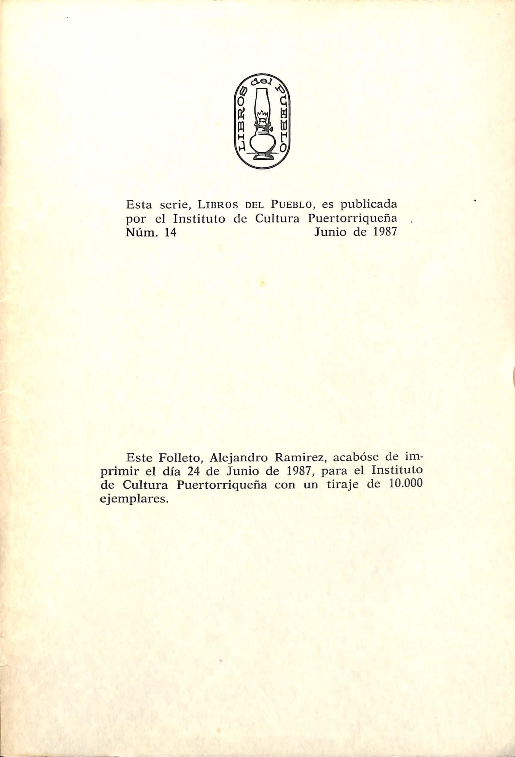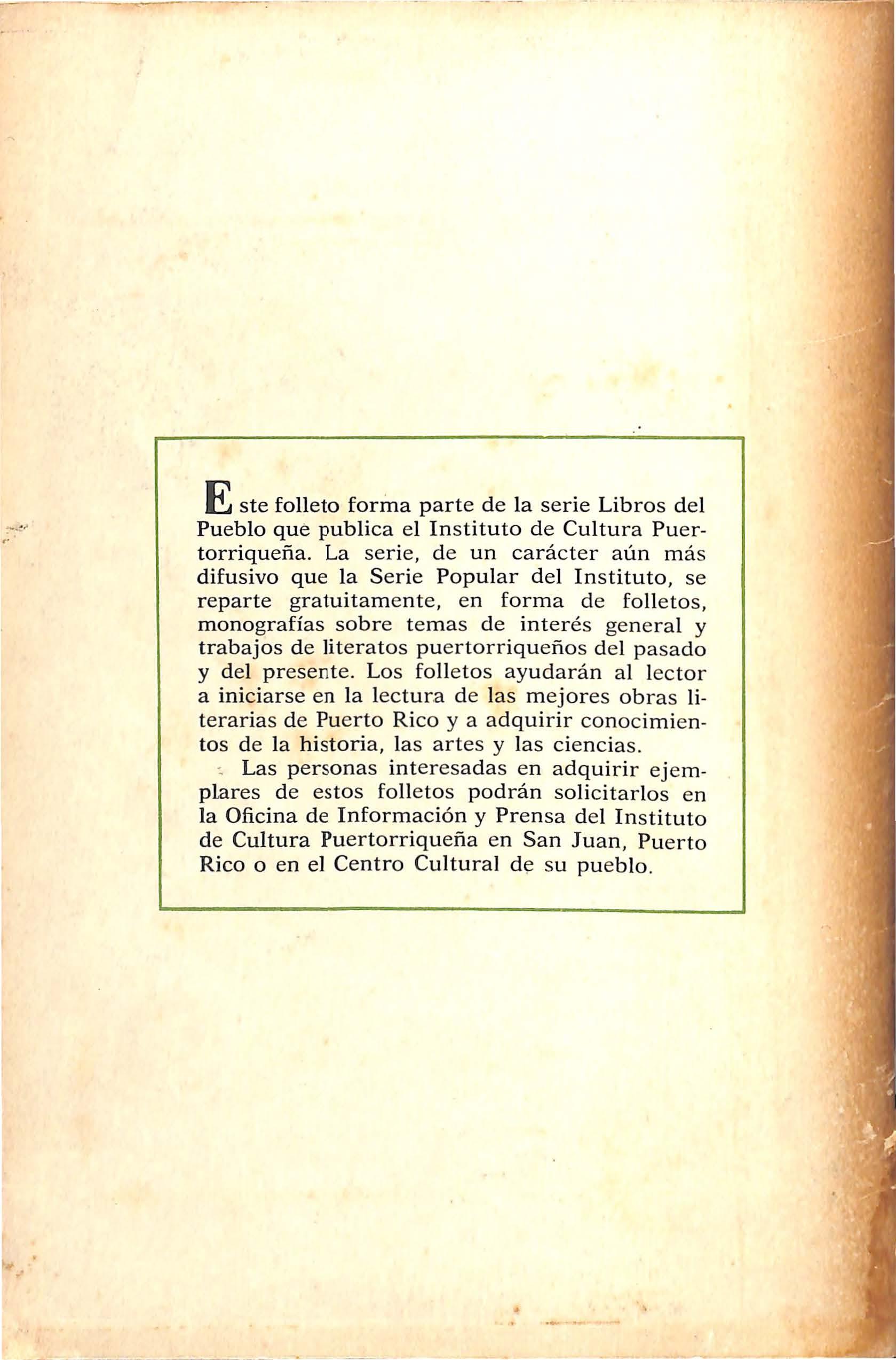 Este folleto forma parte de la serie Libros del Pueblo que publica el Instituto de Cultura Puertorriqueña. La serie, de un carácter aún más difusivo que la Serie Popular del Instituto, se reparte gratuitamente, en forma de folletos, monografías sobre temas de interés general y trabajos de literatos puertorriqueños del pasado y del presente. Los folletos ayudarán al lector a iniciarse en la lectura de las mejores obras literarias de Puerto Rico y a adquirir conocimien- . tos de la historia, las artes y las ciencias.
