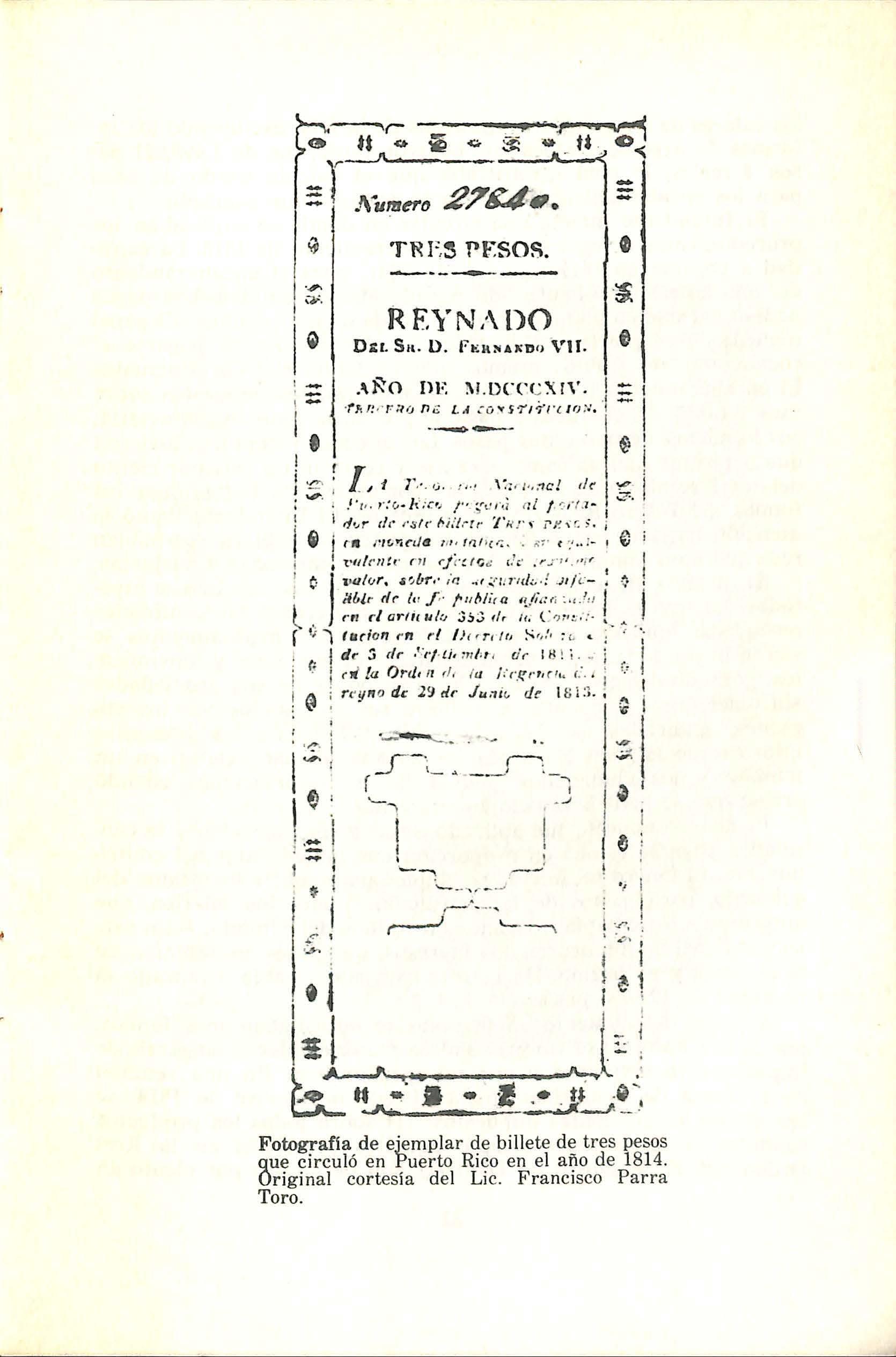 d e ej e mpl a r d e l prim e r p a pe l m o neda q u e c irculó e n Pu e rt o Ri co e n e l a ño d e 18 13 La m o neda estaba impr es a e n e l r eve r·s u d e l pap e l se ll ado O ri g in a l corte sía d e l Le d o. Fran c isco Pa rr a To r o.