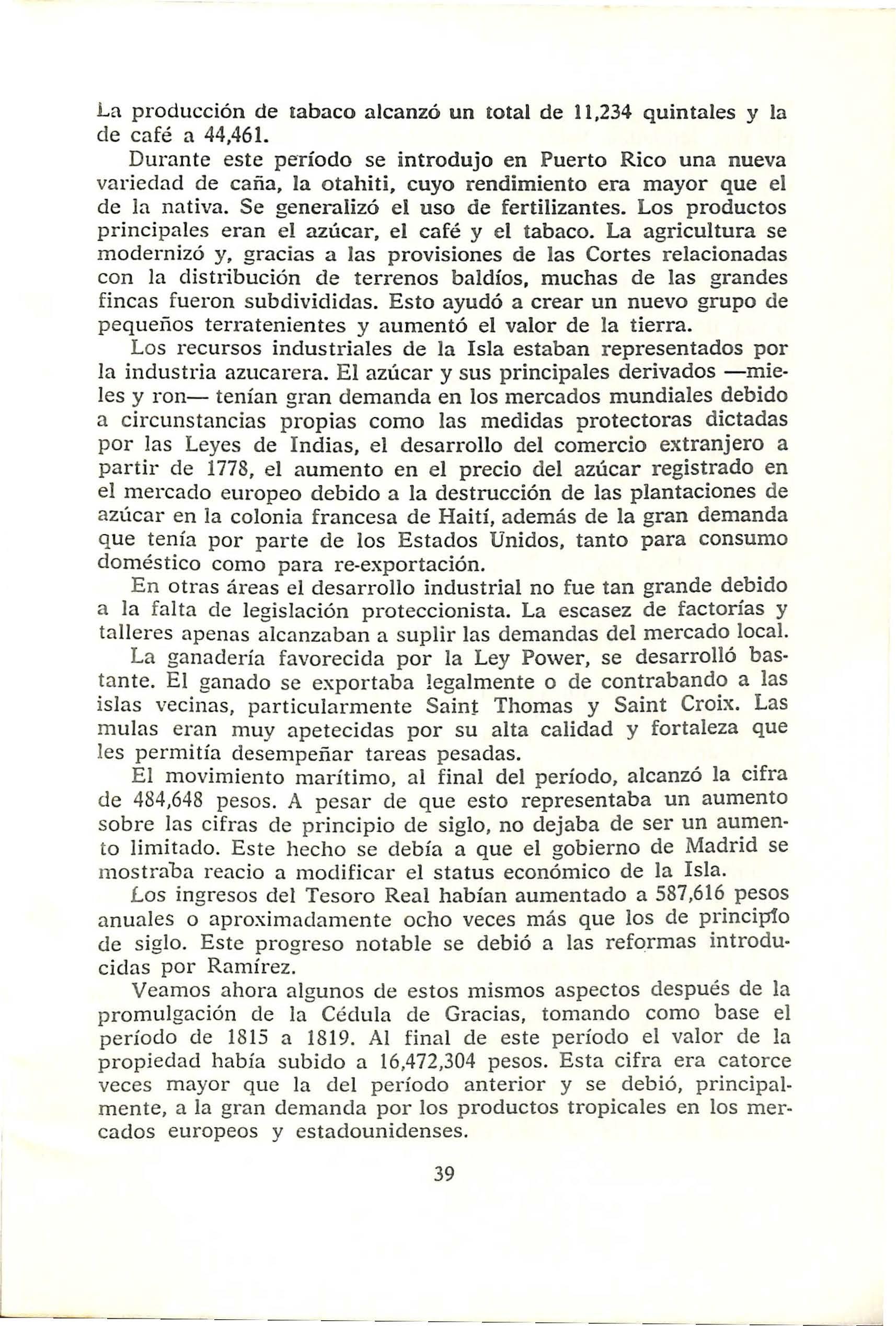 La Cédula de Gracias satisfizo muchas de las principales demandas económicas de los liberales, según aparecí2n expresadas en las instrucciones a Power, tales como comercio Übre con España y los extranjeros, la introducción de equipo agrícola y otras, pues en la confección del informe presentado por Hernáiz, Pedro Irizarry -uno de los autores principales de las Instrticcionesdesempeñó un papel importante. Sin embargo, debe darse crédito a Fernando VII y sus ministros, no sólo por la amplitud de reformas económicas y demográficas, sino también porque permitieron un comercio casi libre, cosa que no hicieron las Cortes en el gobierno constitucional.