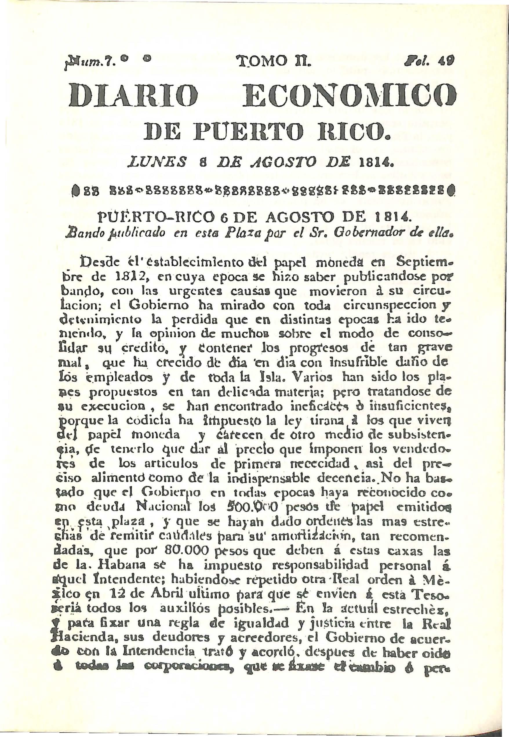 Las pr im er a s notici as d e la re s ta uració n de Fern ando V II , co mo m o narca a bsoluto d e Es p a ñ a, fuero n r ecib i d as e n P ue r to R ico po r el g ob erna do r Me lé nd ez el 30 de j u nio de 18 14. Melén de z p roc e d ió a emitir una o rden re s ta bl e c ie n do el régimen abs olu ti s ta. a co mpañánd o la de un Re a l Decr e to d e 4 d e mayo , que abolí a l a Co n :> titución. En u n e s fu erzo en c ami n a d o a ai sl ar la I s la de l a agitación i ndependentis t a en el res t o d e l a s co l o nia s españ o las, a a s e gu rar e l respaldo de lo s pu ert o rr i q u eñ os y para fome n tar el d es arr o llo ec o nómi co de la I s la, Fe rn ando VII firma u na o r d en , el 10 de octubr e de 1814, pi d ie n do al Ayuntamiento de la Capital un in fo rme con recomendac io nes para el me jo r de s arrollo de la agricultura , industria y comercio, además de cual q uier o tras medida s necesarias para el bienesta r de lo s nativo s .