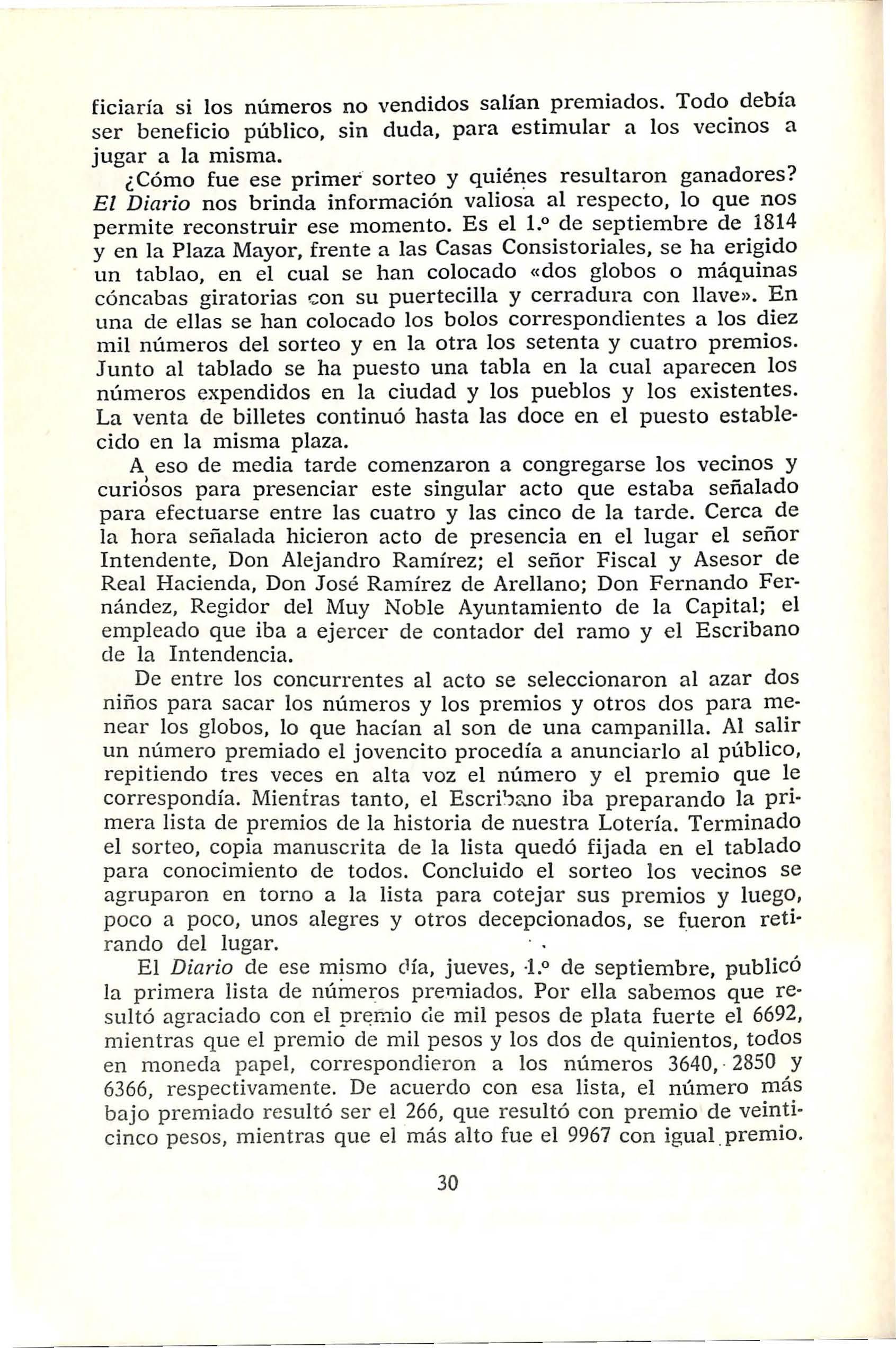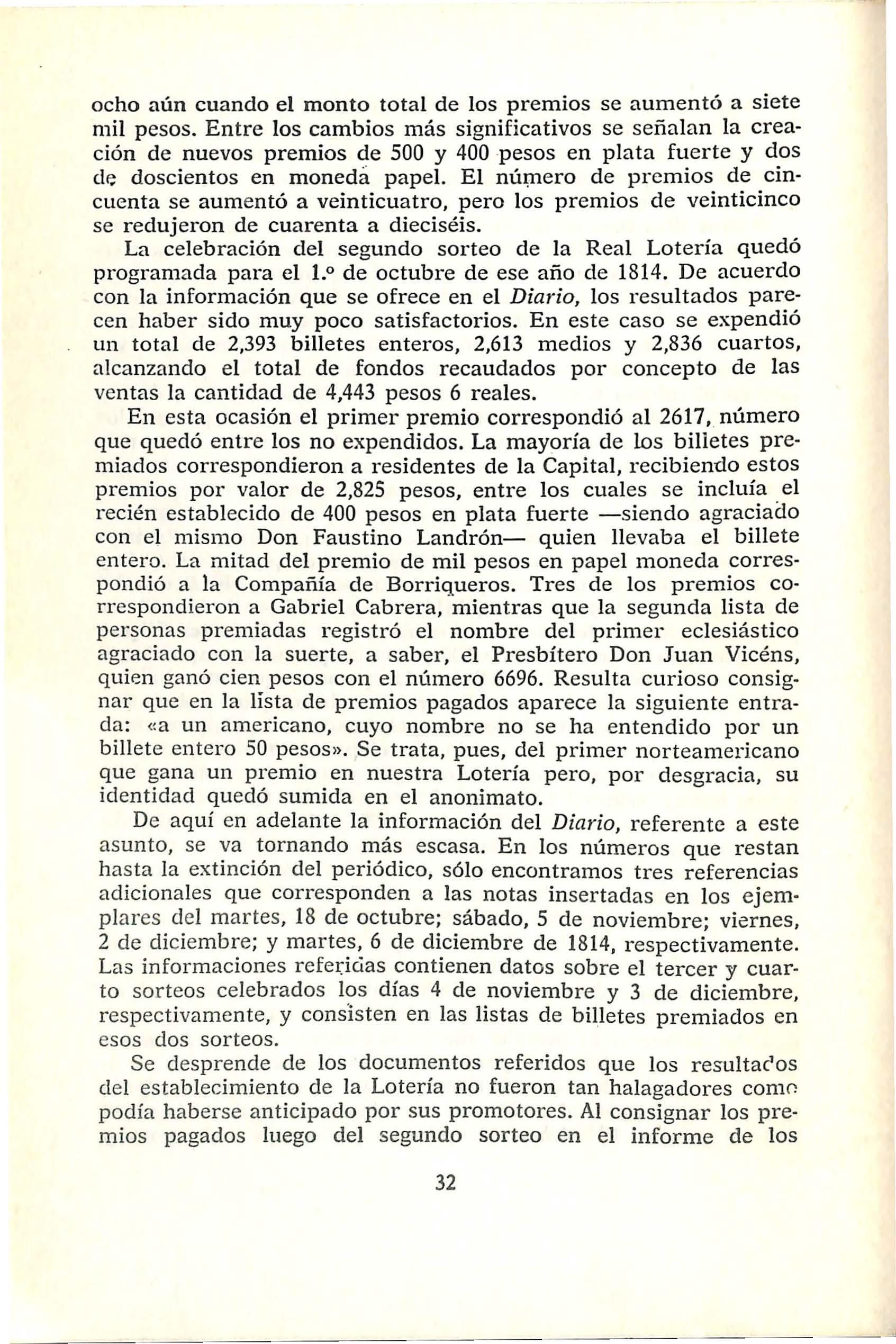 De aquí en adelante la información del Diario, referente a este asunto, se va tornando más escasa. En los números que restan hasta la extinción del periódico, sólo encontramos tres referencias adicionales que co rresp ond en a las notas ins er tad as en los e j emplares d e l martes, 18 de octubre; sábado, 5 de noviembre; viernes, 2 de diciembre; y martes, 6 de diciembre de 1814, respectivamente. Las informaciones refericias contienen datos sobre el tercer y cuarto sorteos cele b rados los días 4 de noviembre y 3 de diciembre, respectivamente, y cons'isten en las listas de billetes premiados en es os dos sorteos.