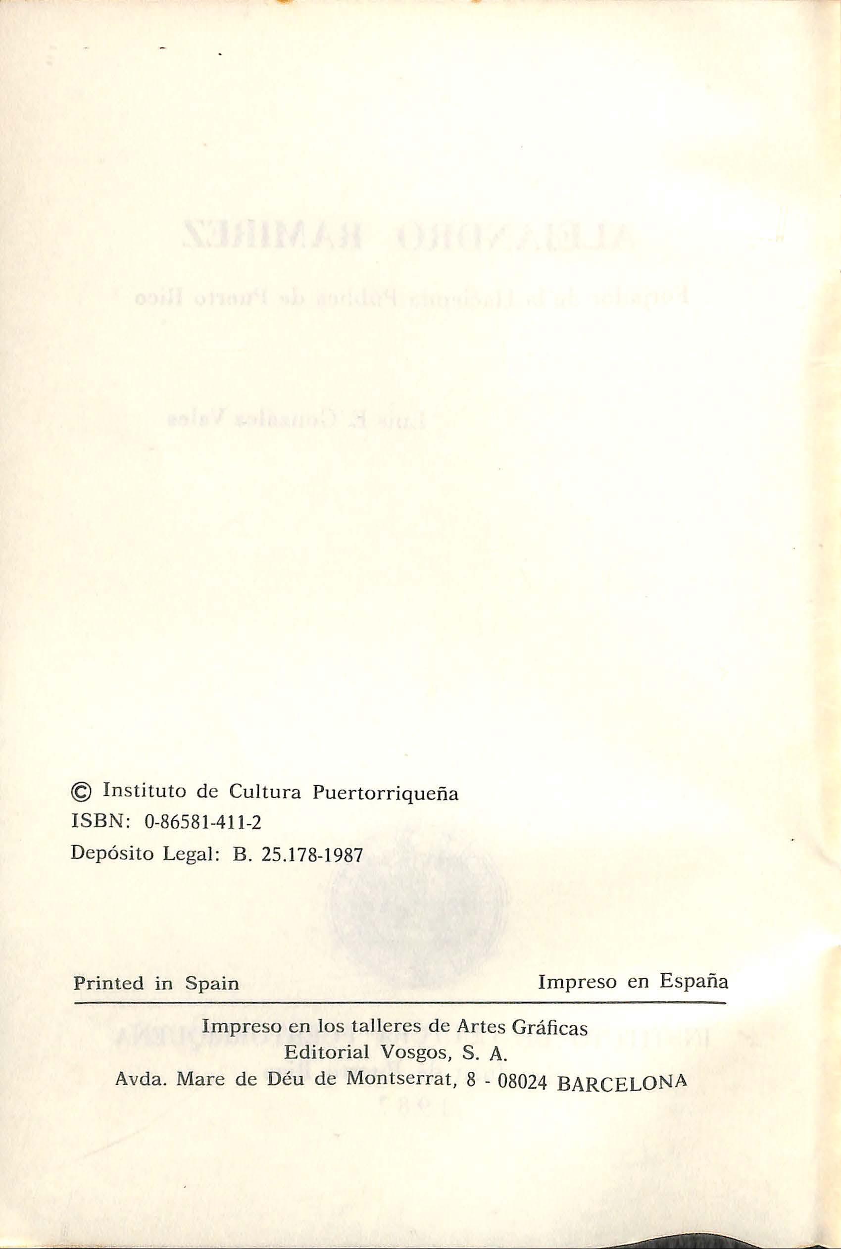 Este Folleto, Alejandro Ramirez, acabóse de imprimir el día 24 de Junio de 1987, para el Instituto de Cultura Puertorriqueña con un tiraje de 10.000 ejemplares.