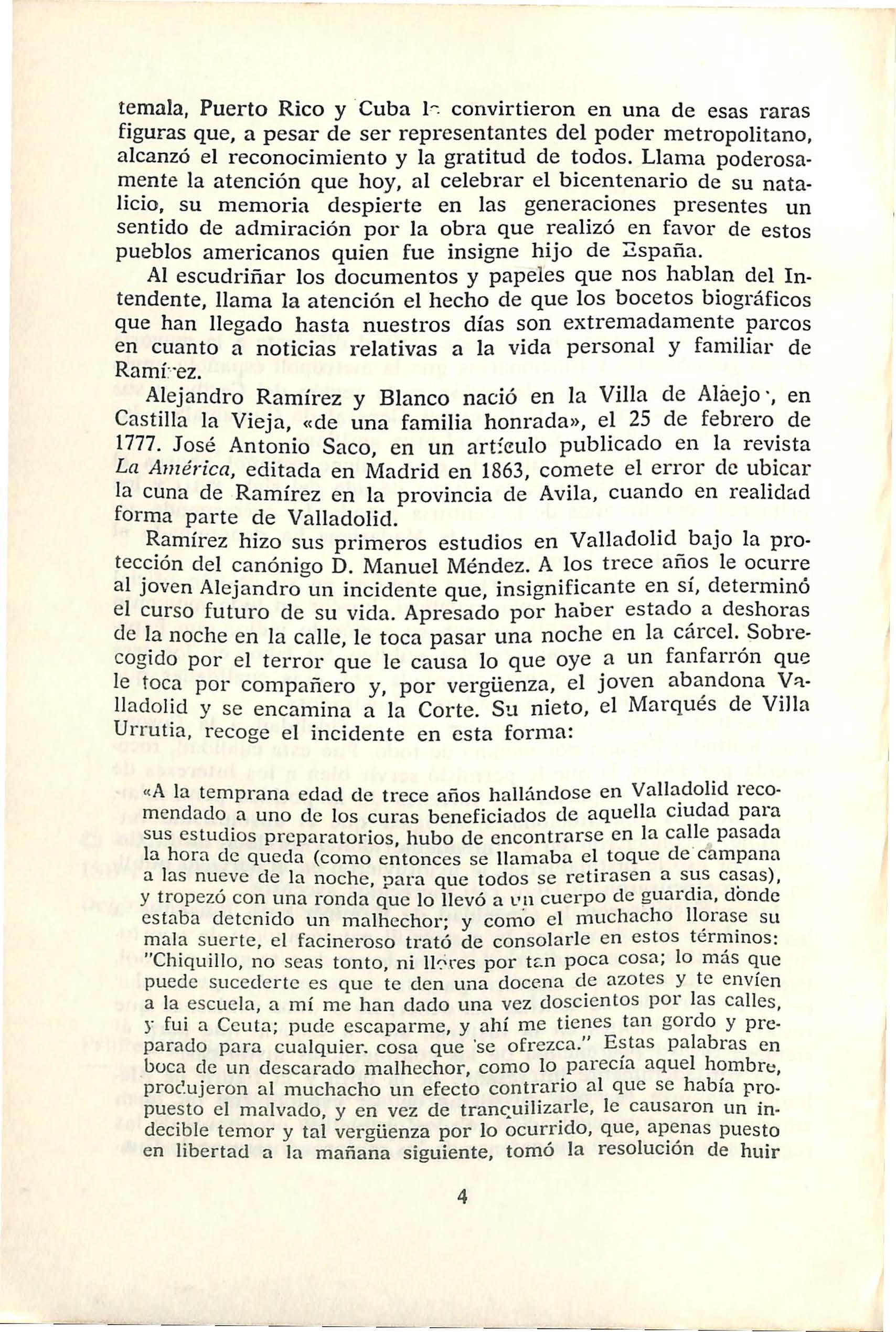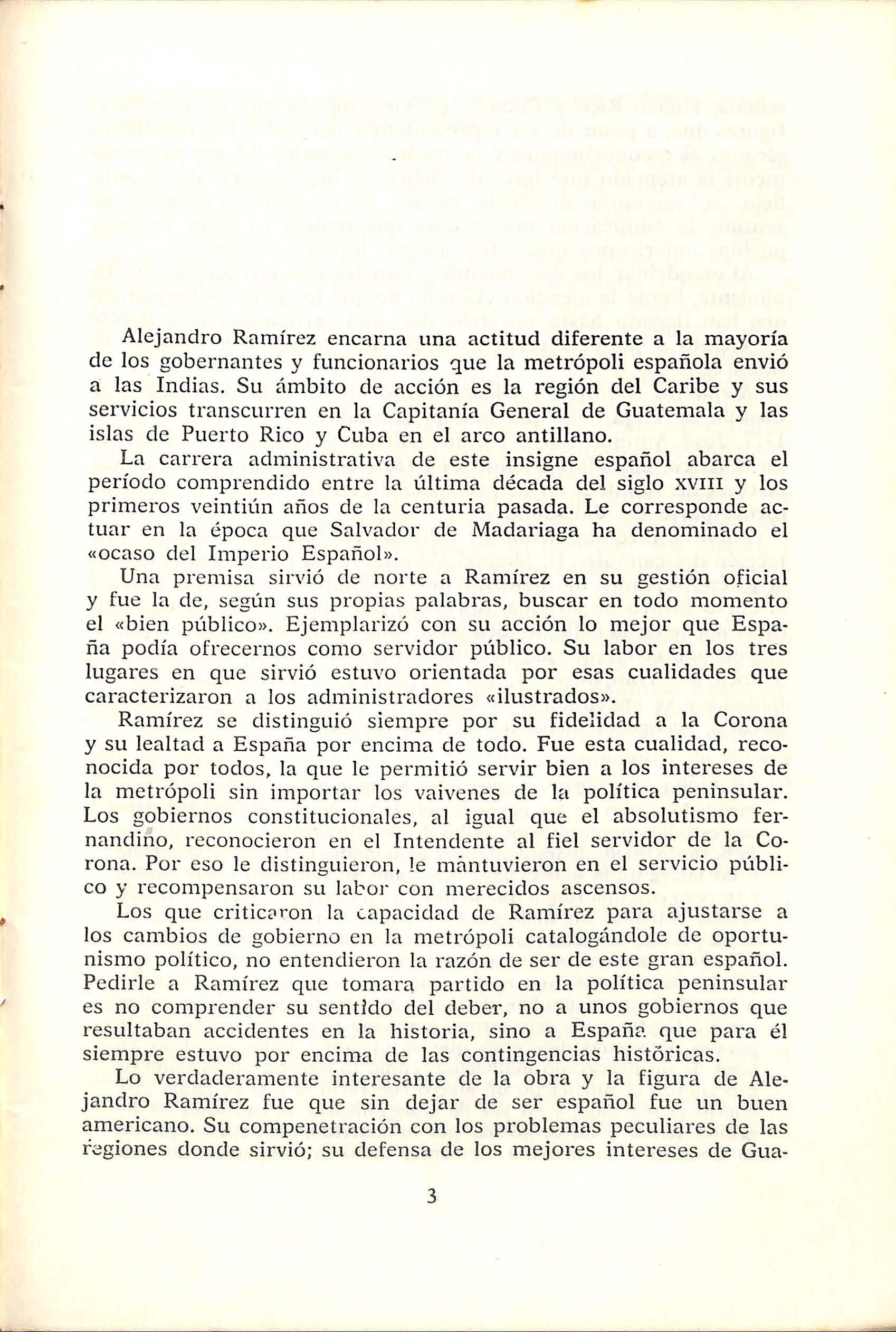 Lo verda d eramen t e interesante el e l a obra y la f ig u ra el e Al ejandro Ramírez fue que sin dejar de ser español fue un bu en americano. Su compenetración con los problemas peculiares ele l as regiones donde sirvió; su d efensa de los mejores intereses de Gua-