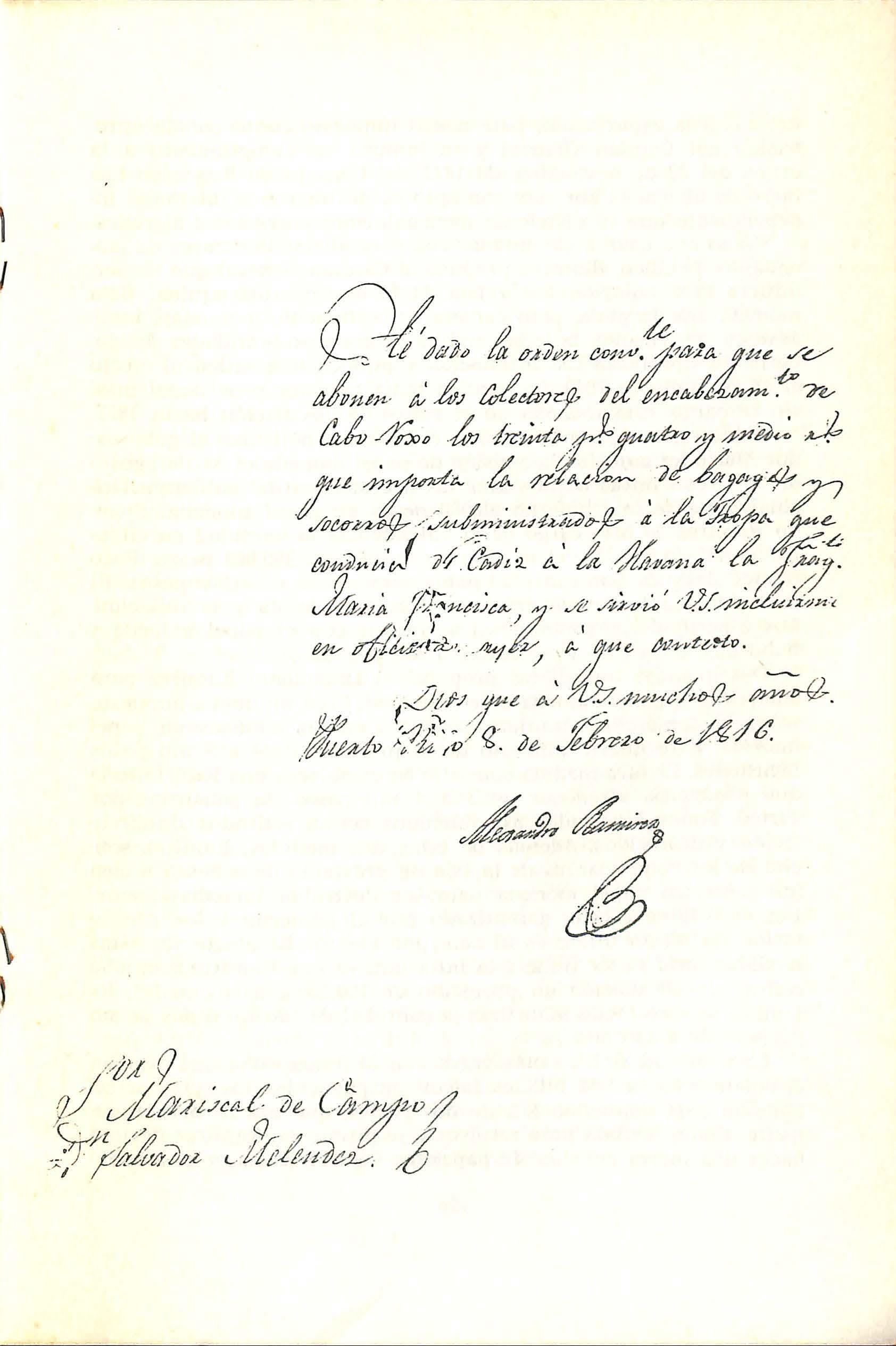 «C omo sólo me había propuesto la fe licidad de Puerto Rico , soli cité con el ma yor ahínco una persona cap a z de llen a r los import a ntes car gos de aquel empleo (la In tendencia) y bi e n info r mado de que r esidía en V S las m á s re com endables cualid a d e s, lo expr esé así al Consejo de Reg encia, que t ambién se hallaba convencido de lo mismo, por los inform e s que existen e n los mini s te r ios de Guerra y H aci e nd a. H e te nido pu e s la satisfacción d e q ue se hay a provisto dicha I ntendencia tan di g nam ent e como s e a petec ía, po r cu yo fav orabl e resultado congratulo a V . S. al mi s mo ti e mpo q ue m e fe licito r e presentándome desde ho y los be n efic ios qu e re cibirá muy p ronto mi p atria baj o e l b e n é fico influjo d e los ta lentos Y li beral es ide as q ue t anto brillan e n V. S .»