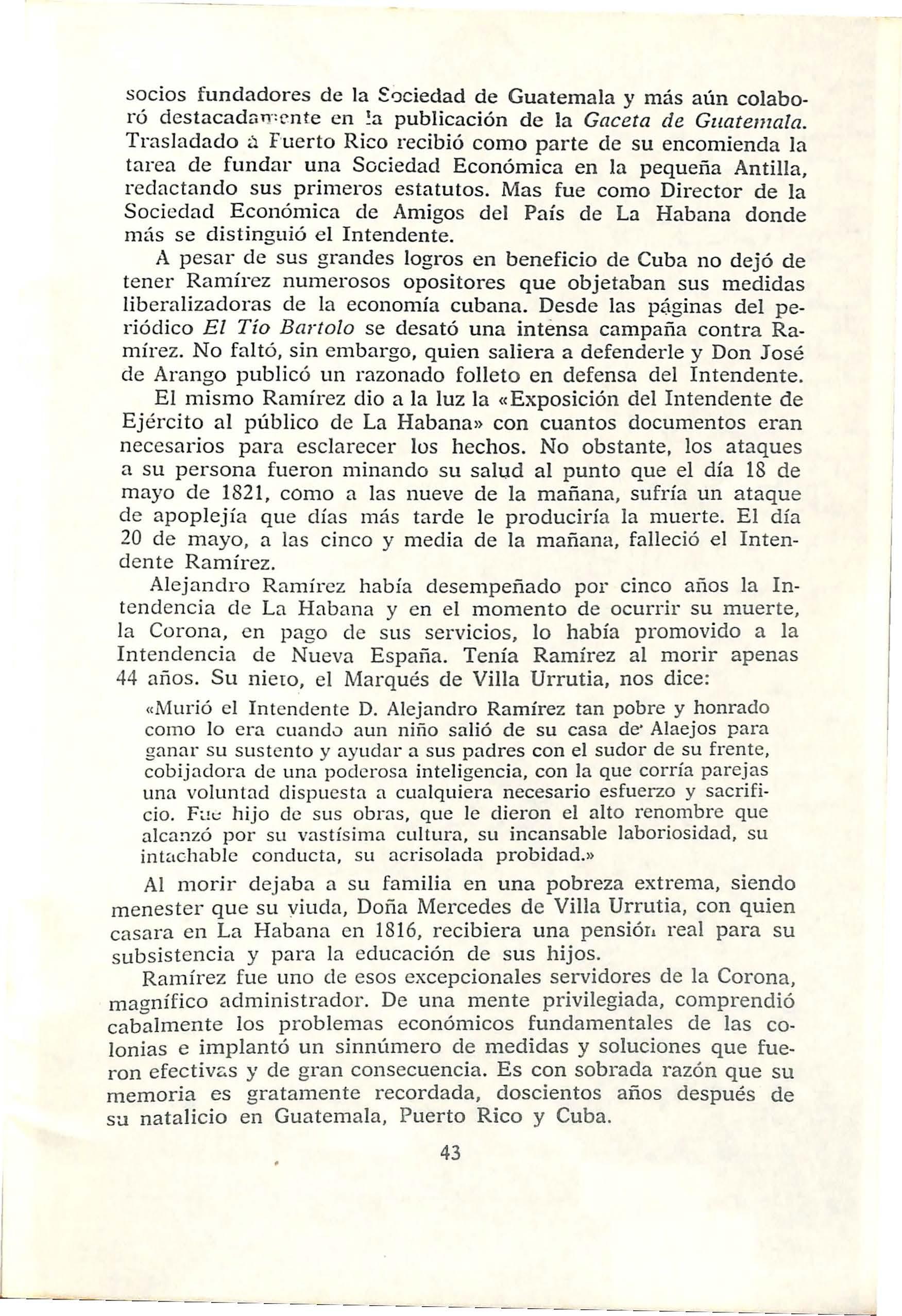 socios fundadores de la de Guatemala y más aún colaboró en !a publicación de la Gaceta de Guatemala. Trasladado il Fuerte Rico recibió como parte de su encomienda la tarea de fundar una Sociedad Económica en la pequeña Antilla, redactando sus primeros estatutos. Mas fue como Director de la Sociedad Económica ele Amigos del País de La Habana donde más se distinguió el Intendente.
