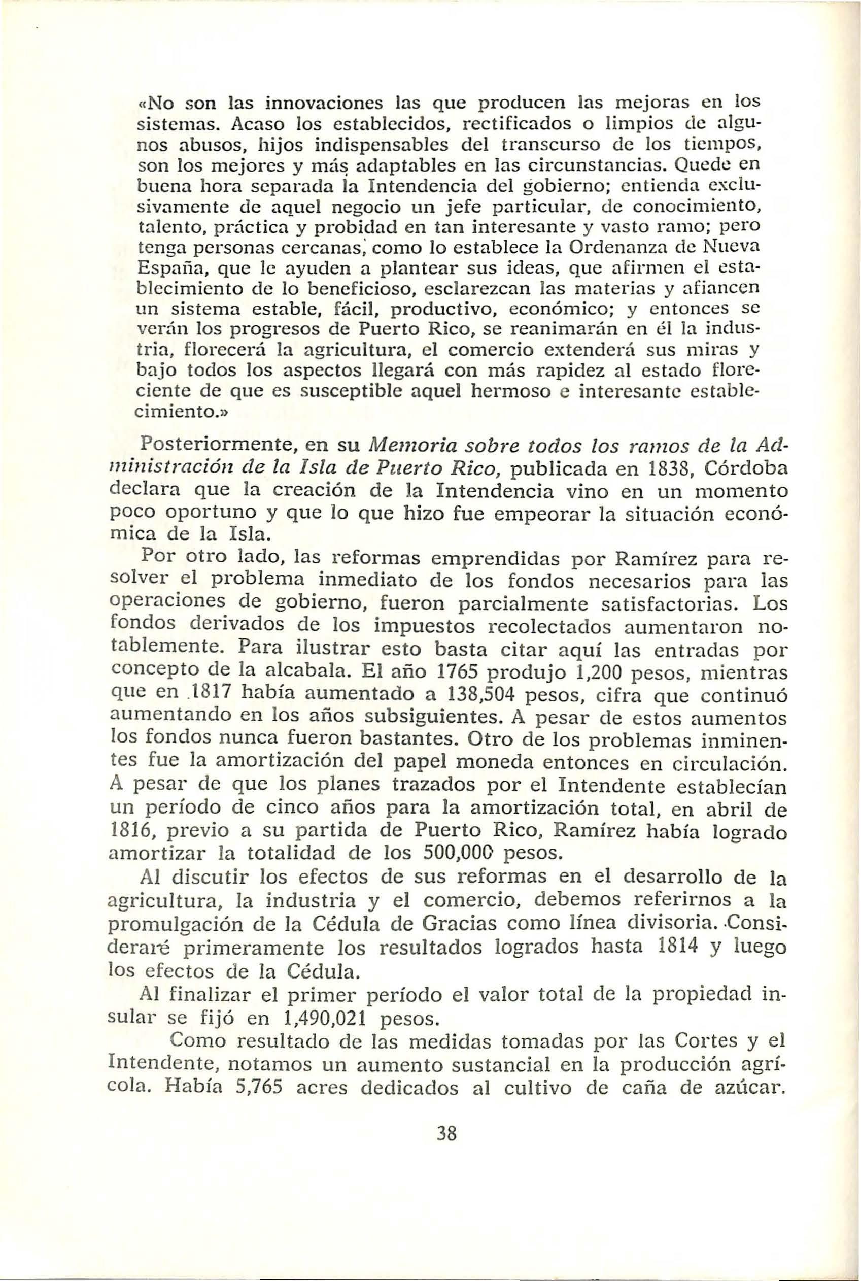 «N o son las innovaciones las que p roducen la s me joras en los s istemas Acaso los establecidos, rectificados o li mpios de alguno s abusos, hijos indispensables del transcurso de lo s tiem pos, son los mejores y adaptables en las circunstancias . Q u ed e en b uena hora separada la Inte ndencia d e l gobierno; e nti e nda excl usivamente de aquel negocio un je fe particular, de con o cimiento, tale nto, pr áctica y probidad en tan interesante y vasto ramo; pero te nga personas cercanas; como lo e stablece la Ordenanza de Nueva Espa ña, que le ay uden a plan tear s us idea s, que afirmen el establecim iento de lo be ne fi cioso, e scla rez can la s materias y afiancen un sistema e stable, fá cil, productivo, e conómico; y e ntonc es se verá n los p rogresos de Puerto Rico, se re anima rán en él la industri a , florec erá la agricult ura , el comercio extenderá s us miras y bajo to cios los aspectos llega rá con má s rapide z a l es tado flo reciente de que es s u s c eptible aquel herm oso e interesa nt e estab lecimient o. »
