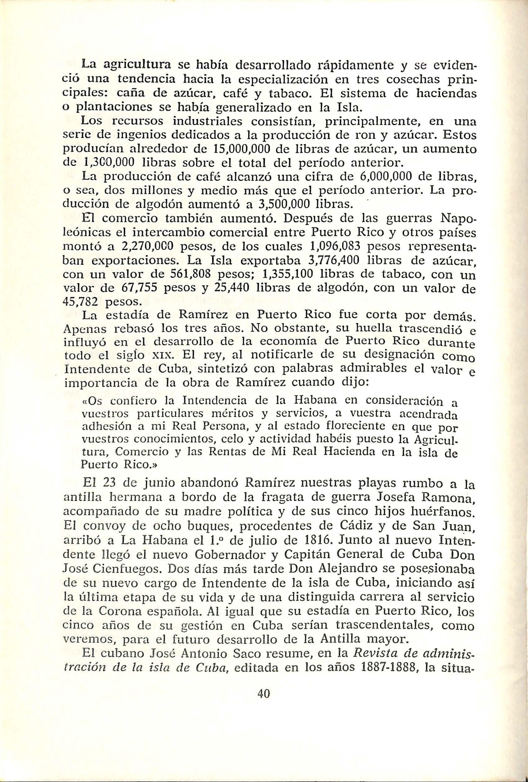 El 23 d e junio abandonó Ramírez nu es tras playas rumbo a la a n tilla hermana a bo rd o de la fr aga ta de guerra Josefa Ramona, acompaña d o de su madre política y de sus cinco hijos hu érfa nos. El convoy de ocho buques, proce d en t es de Cá diz y ele San Juan, arr ib ó a L a Habana el 1.0 d e julio de 1816. Junto a l nuevo Intendente llegó el nuevo Gobe rnado r y Capit án General de Cuba Don José Cicnfuegos. Dos días m ás tarde Don Ale j andro se pose.sion a b a de su n u evo cargo de Intendente de la isla d e Cuba, iniciando así la última etapa de su vida y de un a distinguid a c ar r era al s er vicio de la Corona españo la. Al igual que su estadía en Puerto R ico, los cinco años de su ges tión e n Cuba serían t rascen d entales, como veremos, para e l futuro desarrollo d e la Antilla mayor.