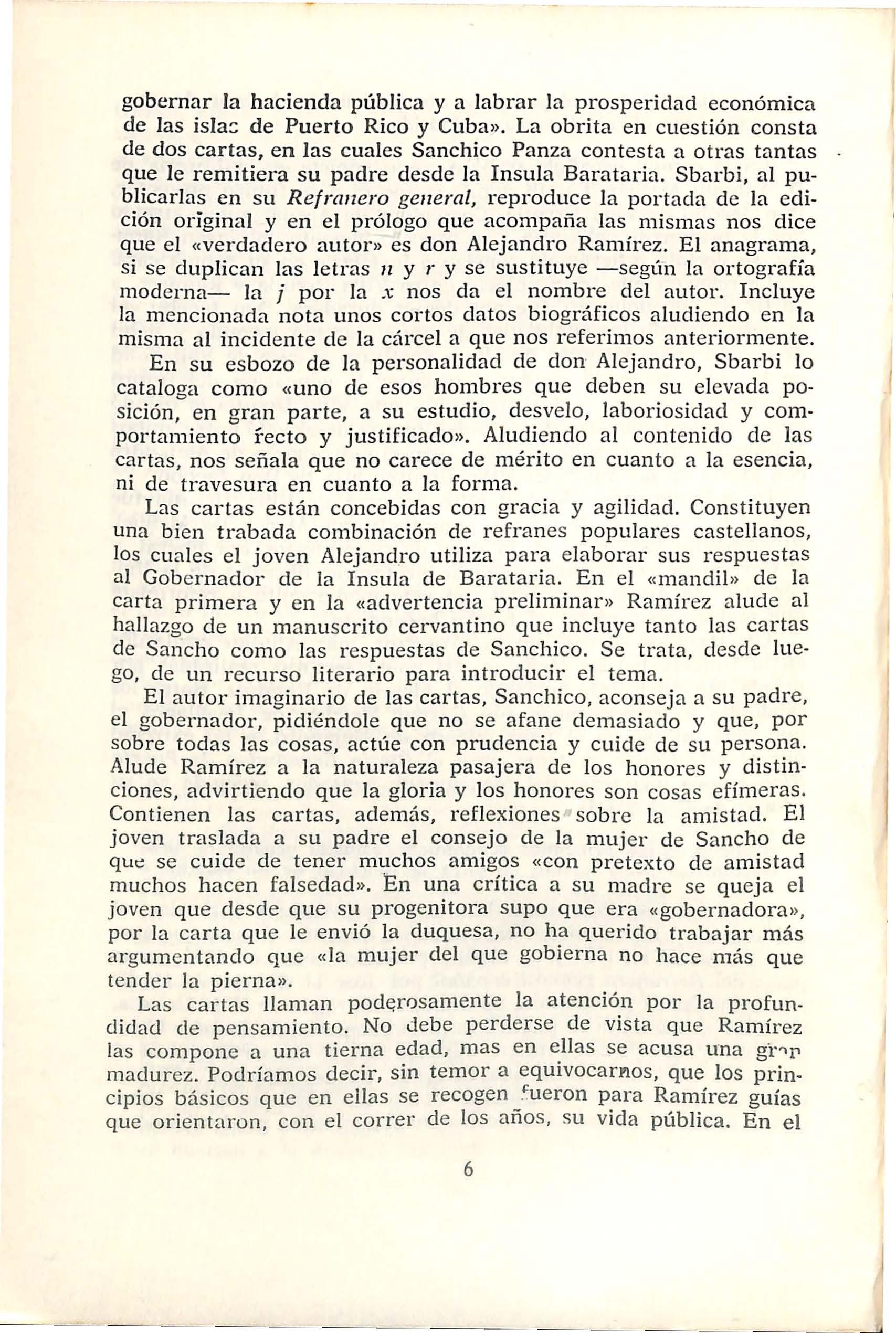gobernar la hacienda pública y a labrar la prosperidad económica de las de Puerto Rico y Cuba». La obrita en cuestión consta de dos cartas, en las cuales Sanchico Panza contesta a otras tantas que le remitiera su padre desde la Insula Barataria. Sbarbi , al publicarlas en su Refranero ge11eral, reproduce la portada de la edición original y en el prólogo que acompaña las mismas nos dice que el «verdadero autor» es don Alejandro Ramírez. El anagrama, si se duplican las letras 11 y r y se sustituye -según la ortografía moderna- la j por la x nos da el nombre del autor. Incluye la mencionada nota unos cortos datos biográficos aludiendo en la misma al incidente ele la cárcel a que nos referimos anteriormente.