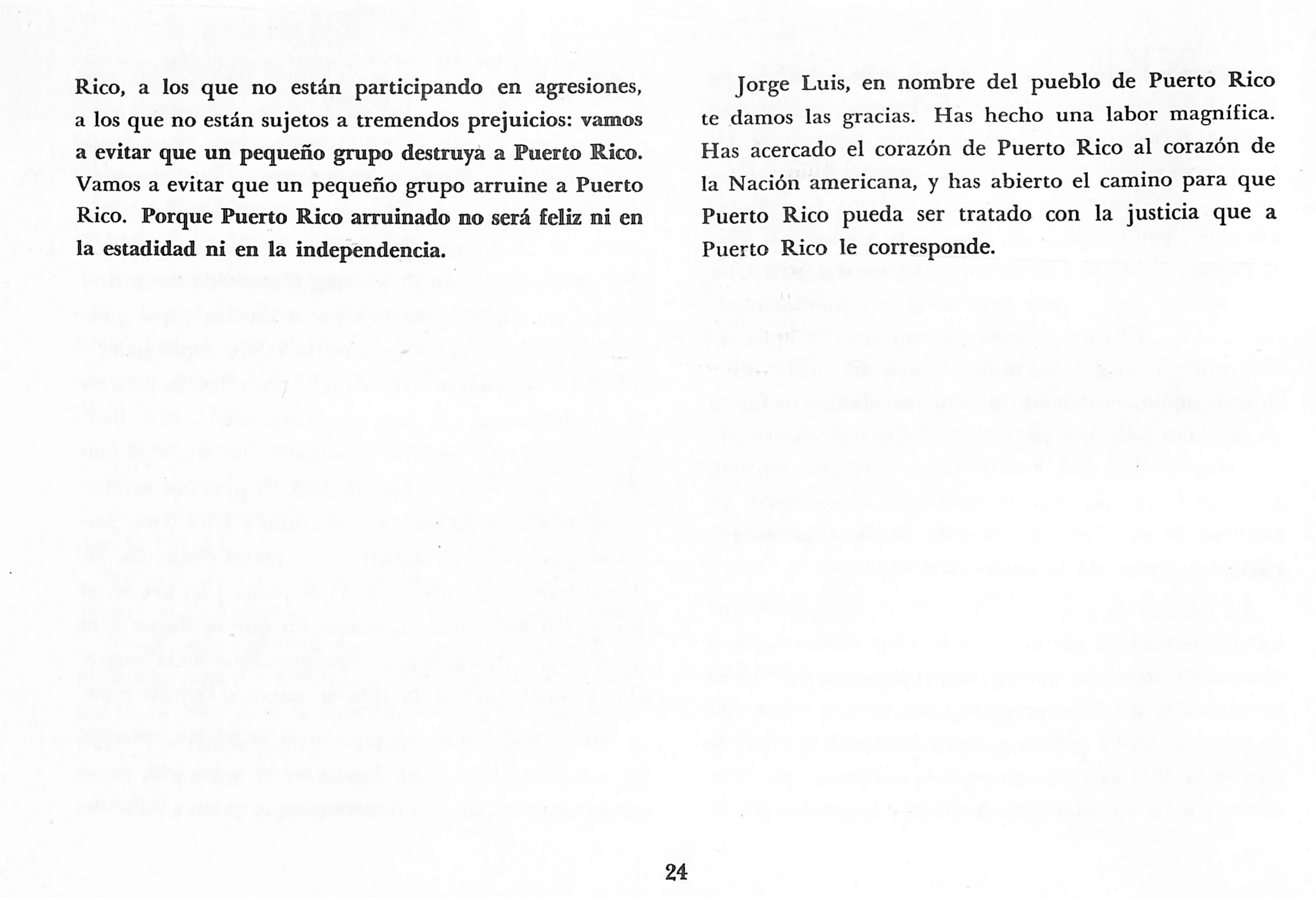 Jorge Luis, en nombre del pueblo de Puerto Rico te damos las gracias. Has hecho una labor magnífica. Has acercado el corazón de Puerto Rico al corazón de la Nación americana, y has abierto el camino para que Puerto Rico pueda ser tratado con la justicia que a Puerto Rico le corresponde.
