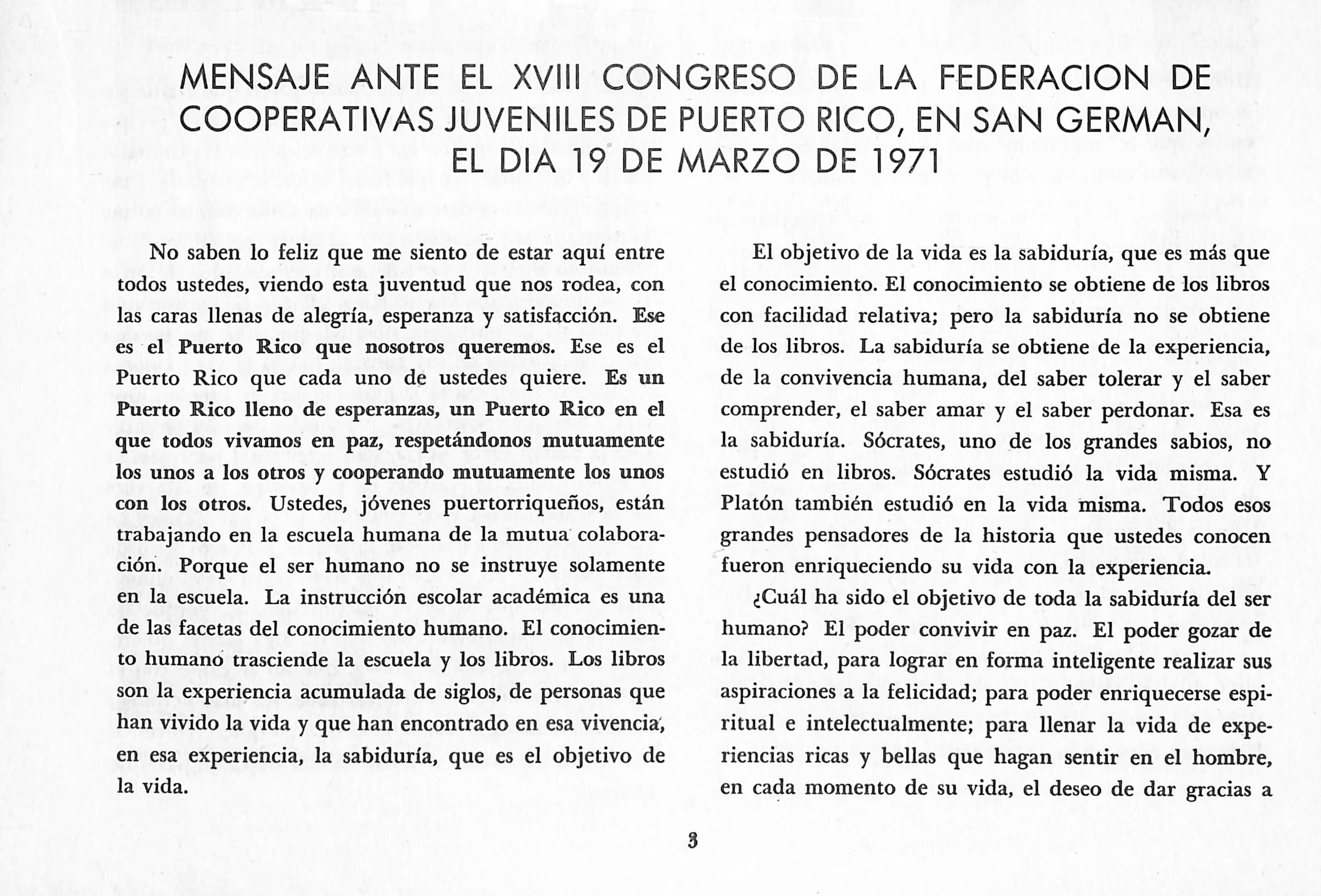 No saben lo feliz que me siento de estar aquí entre todos ustedes, viendo esta juventud que nos rodea, con las caras llenas de alegría, esperanza y satisfacción. Ese es el Puerto Rico que nosotros queremos. Ese es el Puerto Rico que cada uno de ustedes quiere. Es un Puerto Rico lleno de esperanzas, un Puerto Rico en el que todos vivamos en paz, respetándonos mutuamente los unos a los otros y cooperando mutuamente los unos con los otros. Ustedes, jóvenes puertorriqueños, están trabajando en la escuela humana de la mutua colabora ción. Porque el ser humano no se instruye solamente en la escuela. La instrucción escolar académica es una de las facetas del conocimiento humano. El conocimien to humanó trasciende la escuela y los libros. Los libros son la experiencia acumulada de siglos, de personas que han vivido la vida y que han encontrado en esa vivencia', en esa experiencia, la sabiduría, que es el objetivo de la vida.