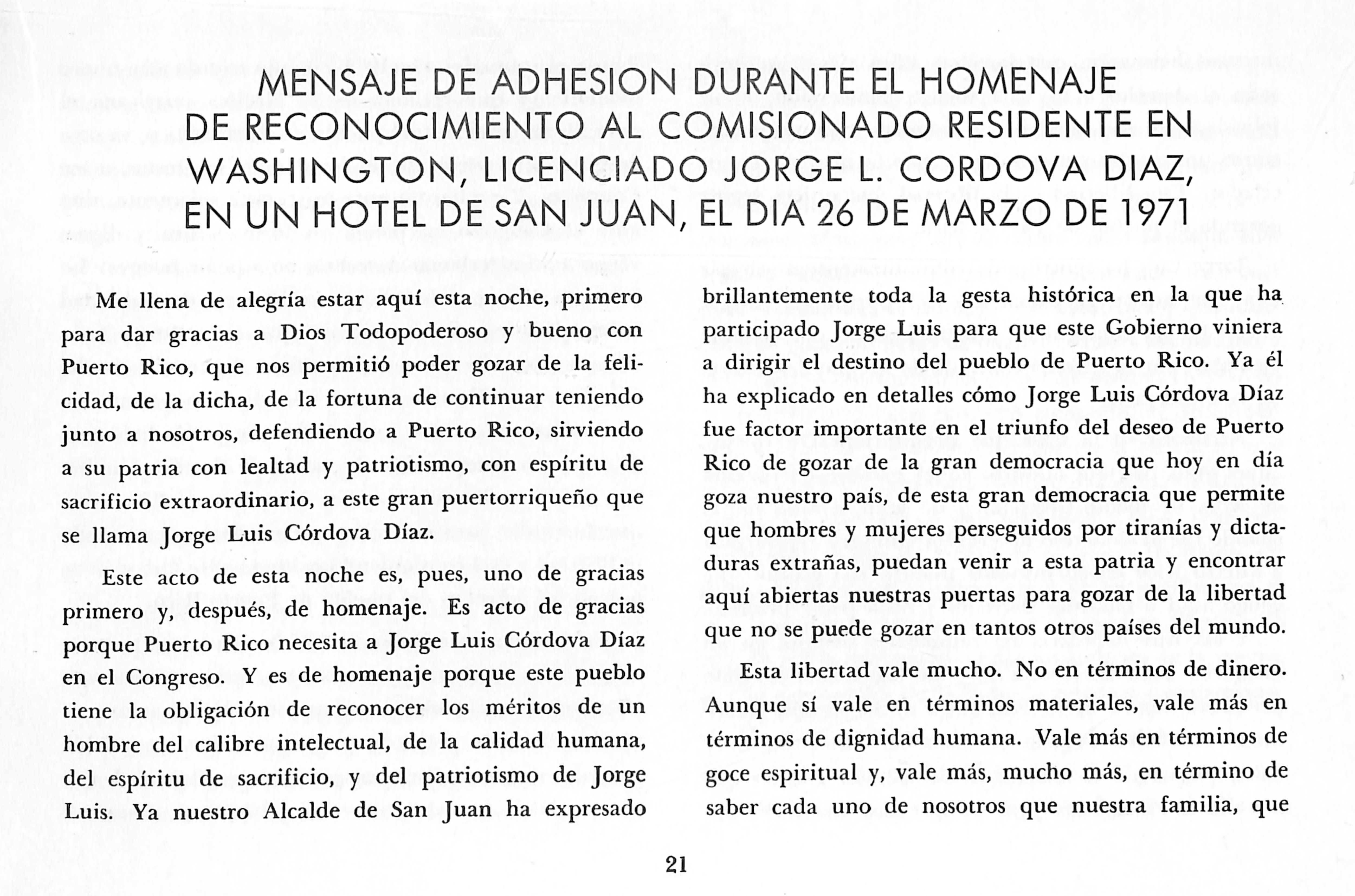 Mensaje de adhesión durante el homenaje al Comi sionado Residente en Washington, licenciado Jorge Luis Córdova Díaz, en un hotel de San Juan, el vier nes 26 de marzo de 1971 21 Al Lector