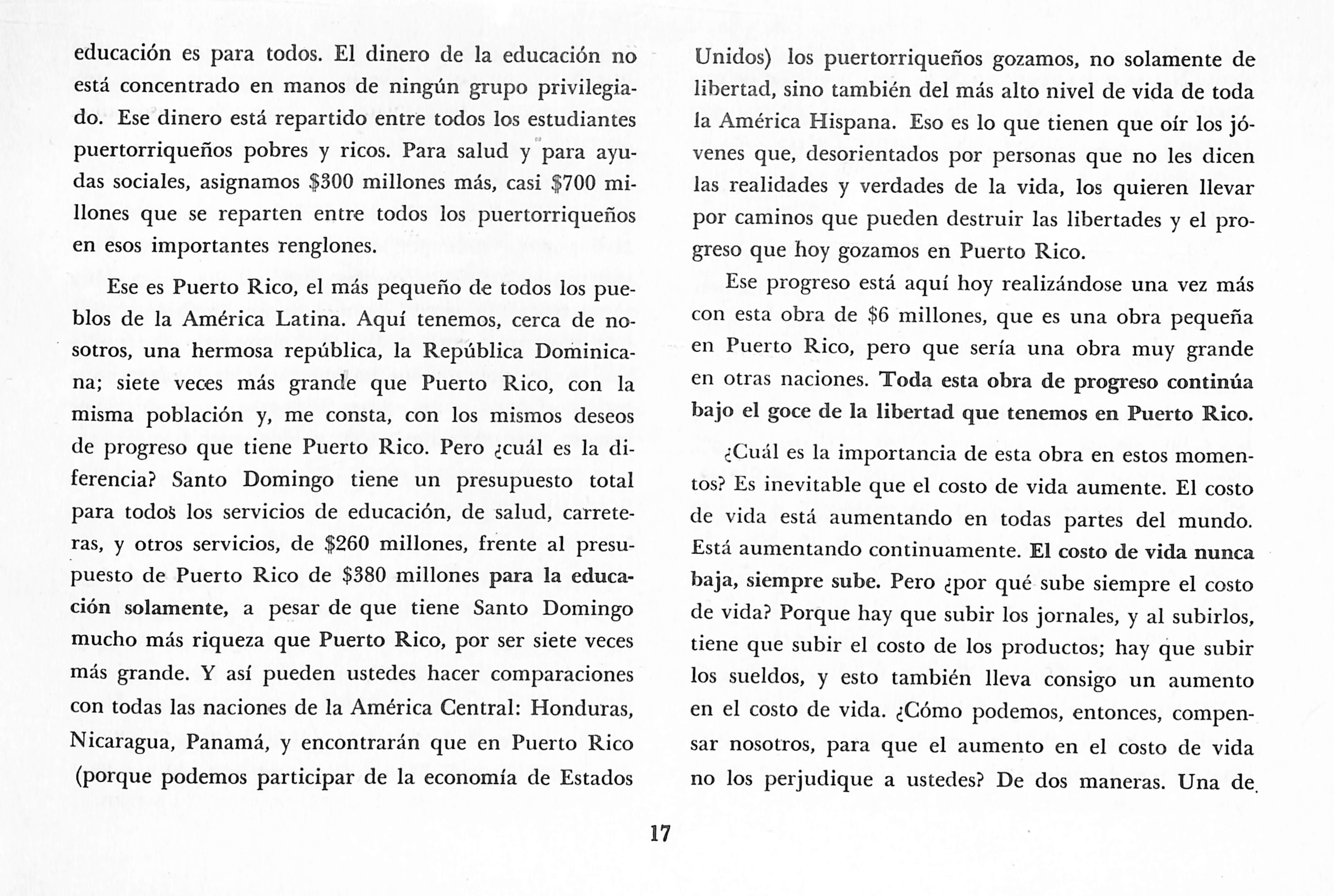 Dentro de ese régimen de libertad es que Puerto Rico ha progresado. Es hoy el área de la América Latina que tiene mayores ingresos. La más pequeña de todas las naciones de América Latina; con tres millones de habitantes, pero con un presupuesto más grande que el de todas las naciones de América Central, excepto Méxi co. Puerto Rico tiene para la educación un presupuesto de trescientos ochenta millones de dólares, porque esta mos conscientes que la educación no es para los ricos, la
