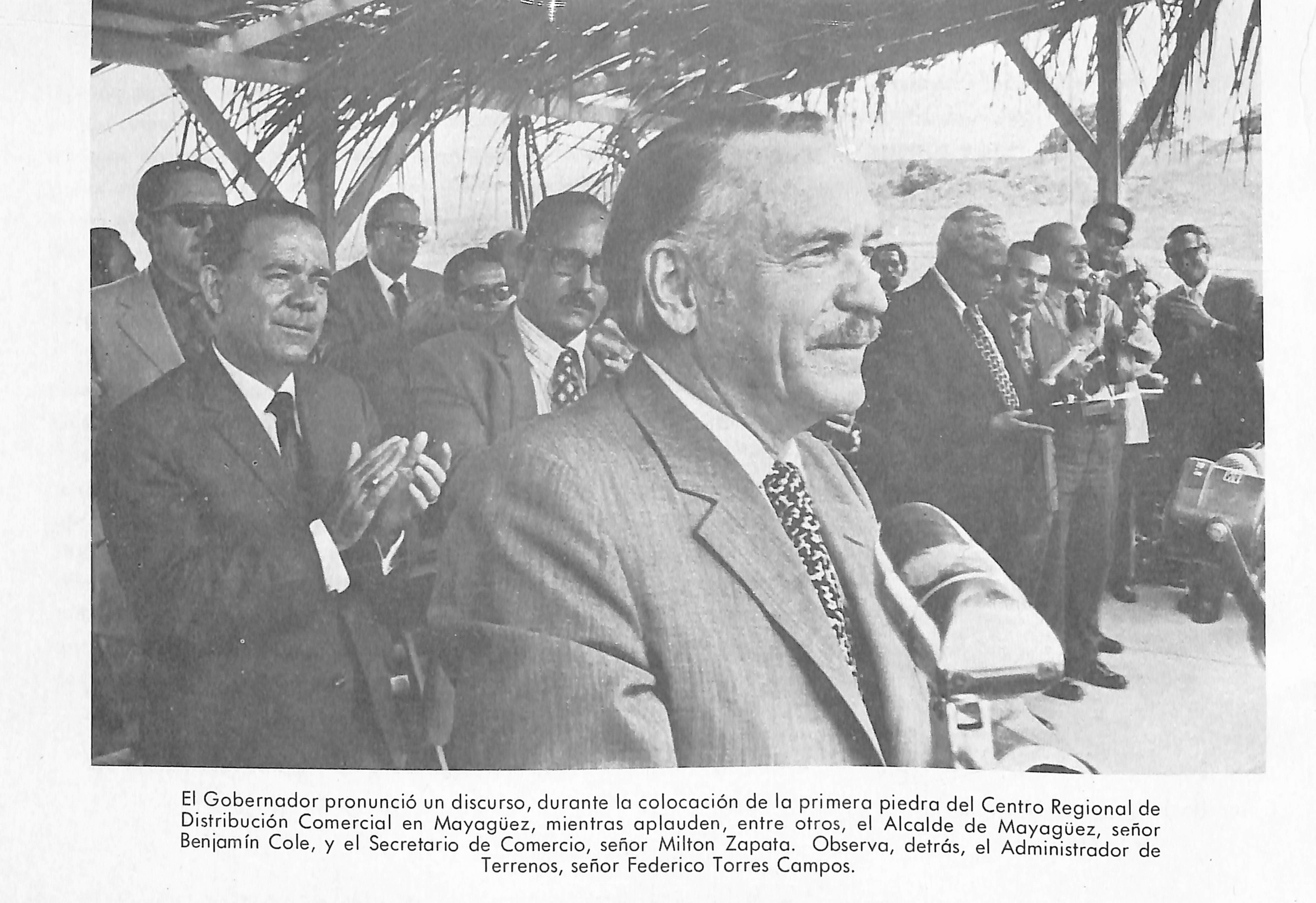 El Gobernador pronunció un discurso, durante la colocación de la primera piedra del Centro Regional de Distribución Comercial en Mayagüez, mientras aplauden, entre otros, el Alcalde de Mayagüez, señor Benjamín Colé, y el Secretario de Comercio, señor Milton Zapato. Observa, detrás, el Administrador de Terrenos, señor Federico Torres Campos.