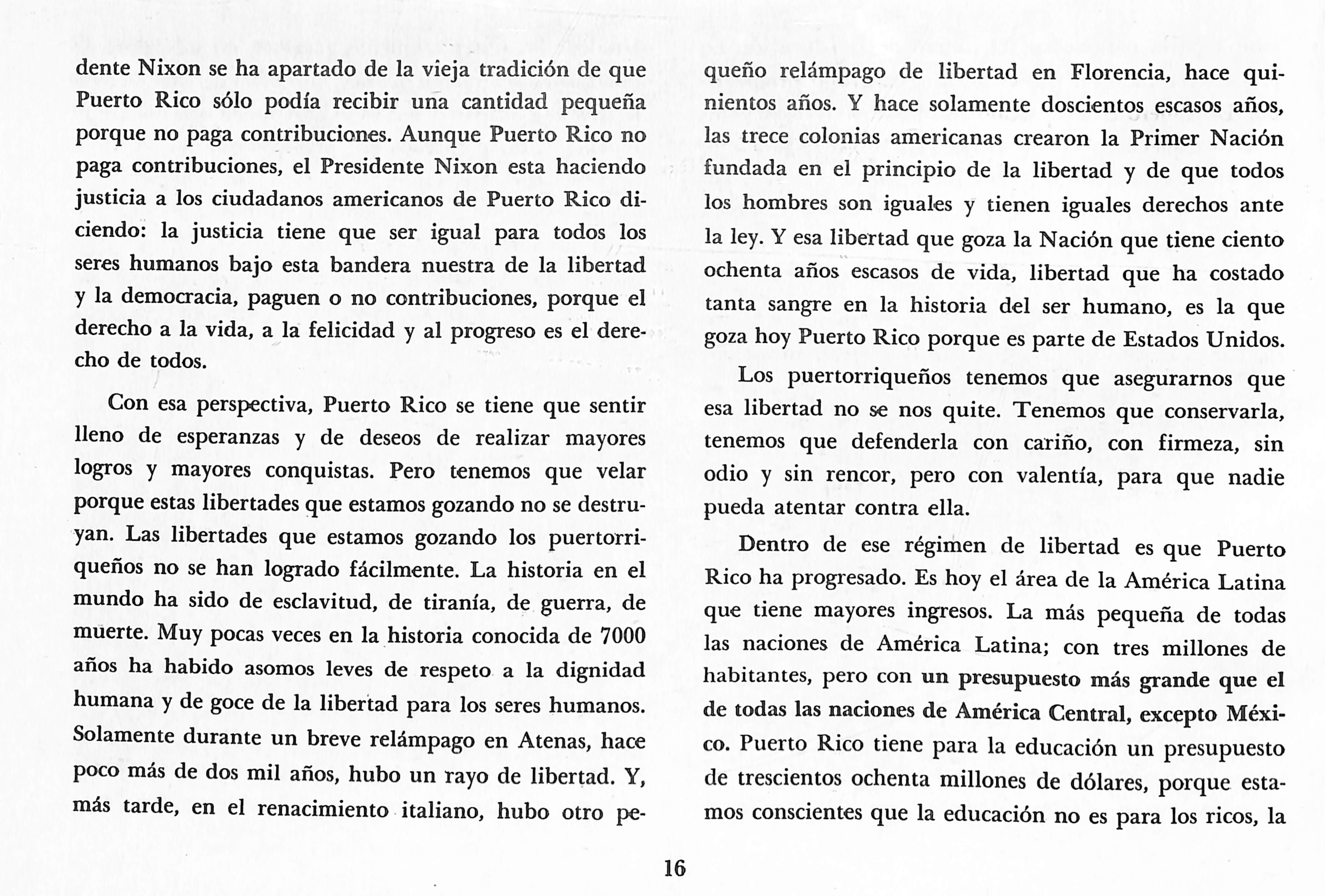 dente Nixon se ha apartado de la vieja tradición de que Puerto Rico sólo podía recibir una cantidad pequeña porque no paga contribuciones. Aunque Puerto Rico no paga contribuciones, el Presidente Nixon esta haciendo justicia a los ciudadanos americanos de Puerto Rico di ciendo: la justicia tiene que ser igual para todos los seres humanos bajo esta bandera nuestra de la libertad y la democracia, paguen o no contribuciones, porque el derecho a la vida, a la felicidad y al progreso es el dere cho de todos.