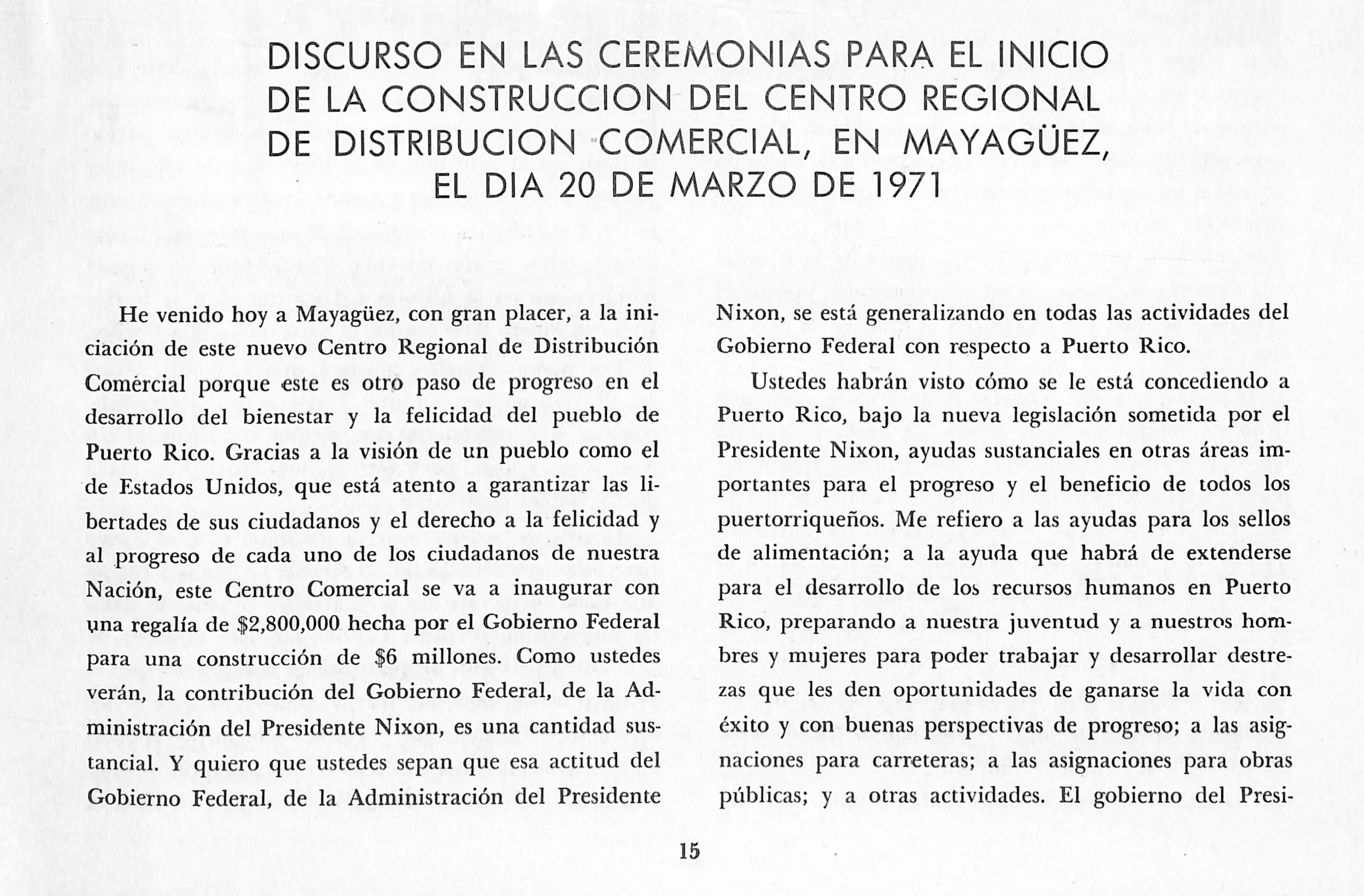 Comercial porque este es otro paso de progreso en el desarrollo del bienestar y la felicidad del pueblo de Puerto Rico. Gracias a la visión de un pueblo como el de Estados Unidos, que está atento a garantizar las li bertades de sus ciudadanos y el derecho a la felicidad y al progreso de cada uno de los ciudadanos de nuestra Nación, este Centro Comercial se va a inaugurar con una regalía de |2,800,000 hecha por el Gobierno Federal para una construcción de $6 millones. Como ustedes verán, la contribución del Gobierno Federal, de la Ad ministración del Presidente Nixon, es una cantidad sus tancial. Y quiero que ustedes sepan que esa actitud del Gobierno Federal, de la Administración del Presidente