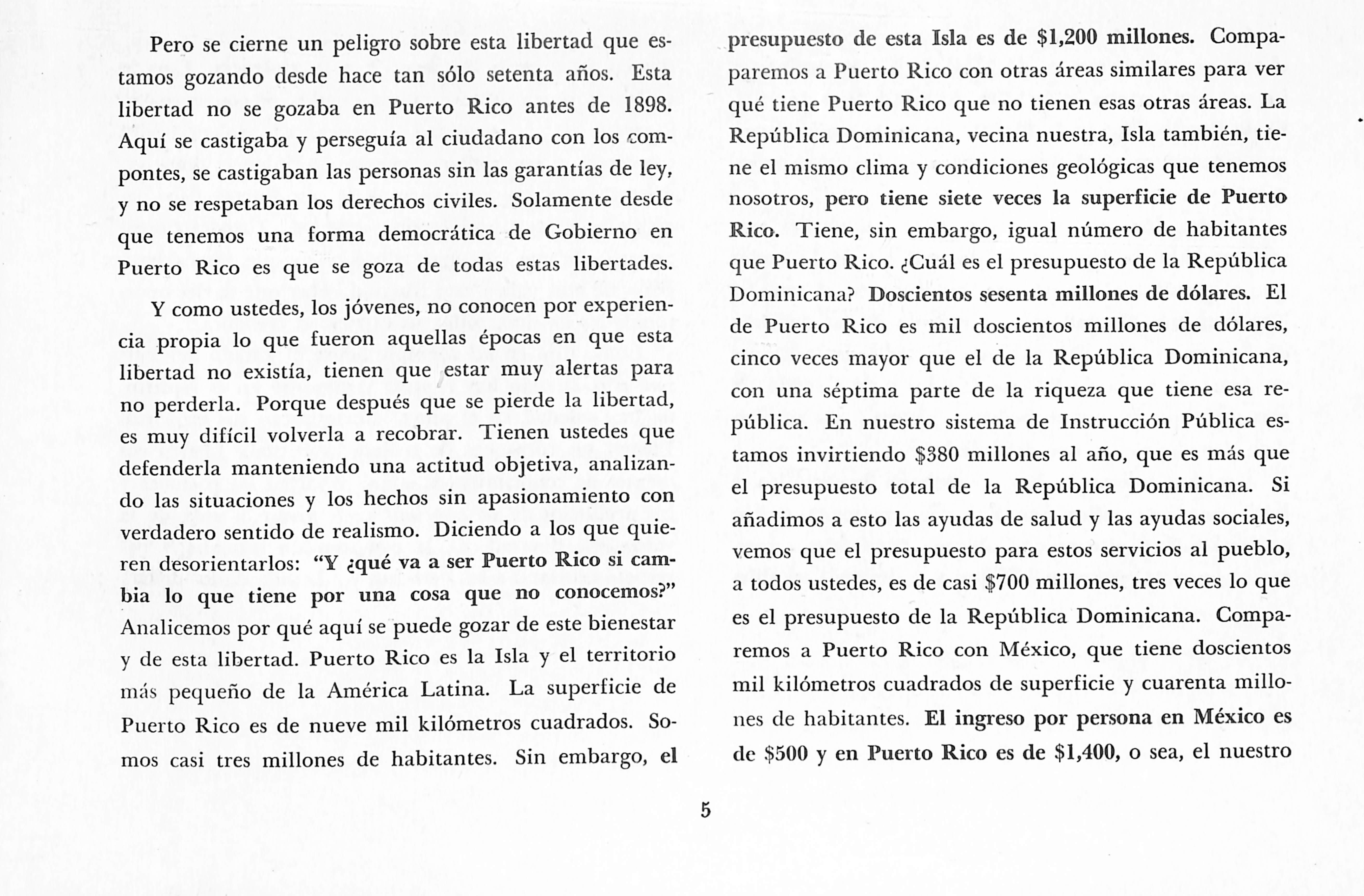 Analicemos por qué aquí se puede gozar de este bienestar y de esta libertad. Puerto Rico es la Isla y el territorio más pequeño de la América Latina. La superficie de Puerto Rico es de nueve mil kilómetros cuadrados. So mos casi tres millones de habitantes. Sin embargo, el presupuesto de esta Isla es de $1,200 millones. Compa paremos a Puerto Rico con otras áreas similares para ver qué tiene Puerto Rico que no tienen esas otras áreas. La República Dominicana, vecina nuestra. Isla también, tie ne el mismo clima y condiciones geológicas que tenemos nosotros, pero tiene siete veces la superficie de Puerto Rico. Tiene, sin embargo, igual número de habitantes que Puerto Rico. ¿Cuál es el presupuesto de la República Dominicana? Doscientos sesenta millones de dólares. El de Puerto Rico es mil doscientos millones de dólares, cinco veces mayor que el de la República Dominicana, con una séptima parte de la riqueza que tiene esa re pública. En nuestro sistema de Instrucción Pública es tamos invirtiendo $380 millones al año, que es más que el presupuesto total de la República Dominicana. Si añadimos a esto las ayudas de salud y las ayudas sociales, vemos que el presupuesto para estos servicios al pueblo, a todos ustedes, es de casi $700 millones, tres veces lo que es el presupuesto de la República Dominicana. Compa remos a Puerto Rico con México, que tiene doscientos mil kilómetros cuadrados de superficie y cuarenta millo nes de habitantes. El ingreso por persona en México es de $500 y en Puerto Rico es de $1,400, o sea, el nuestro
