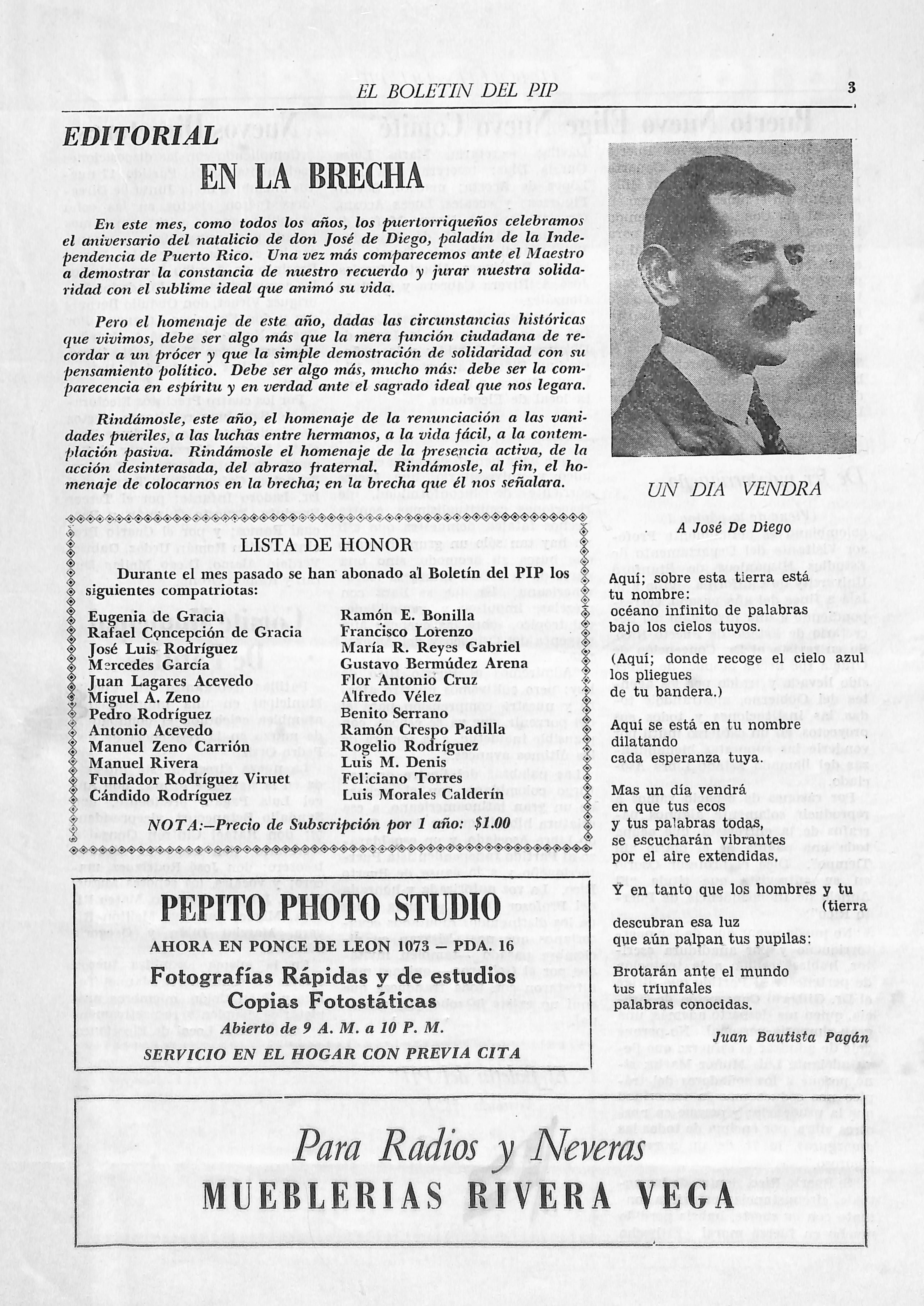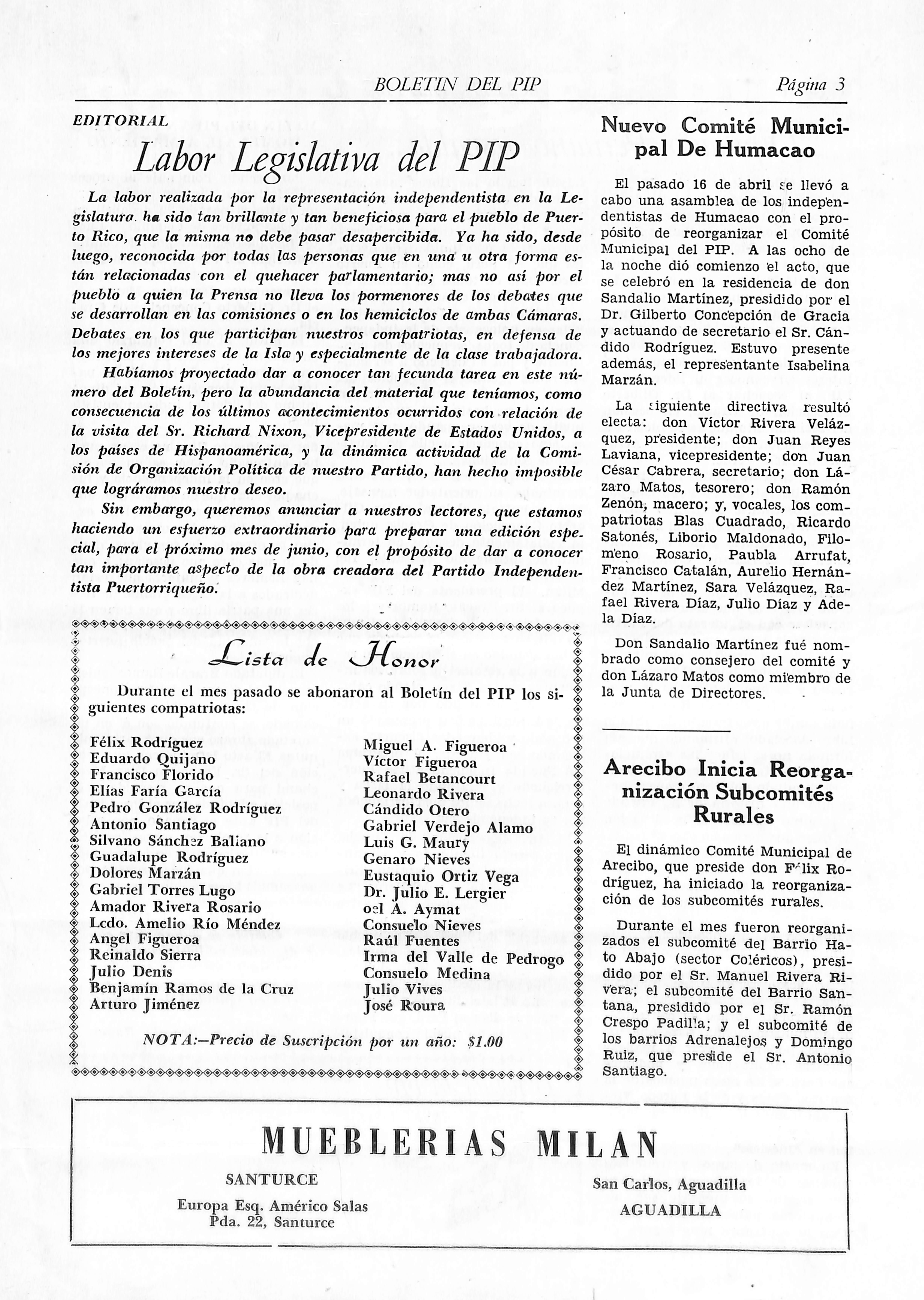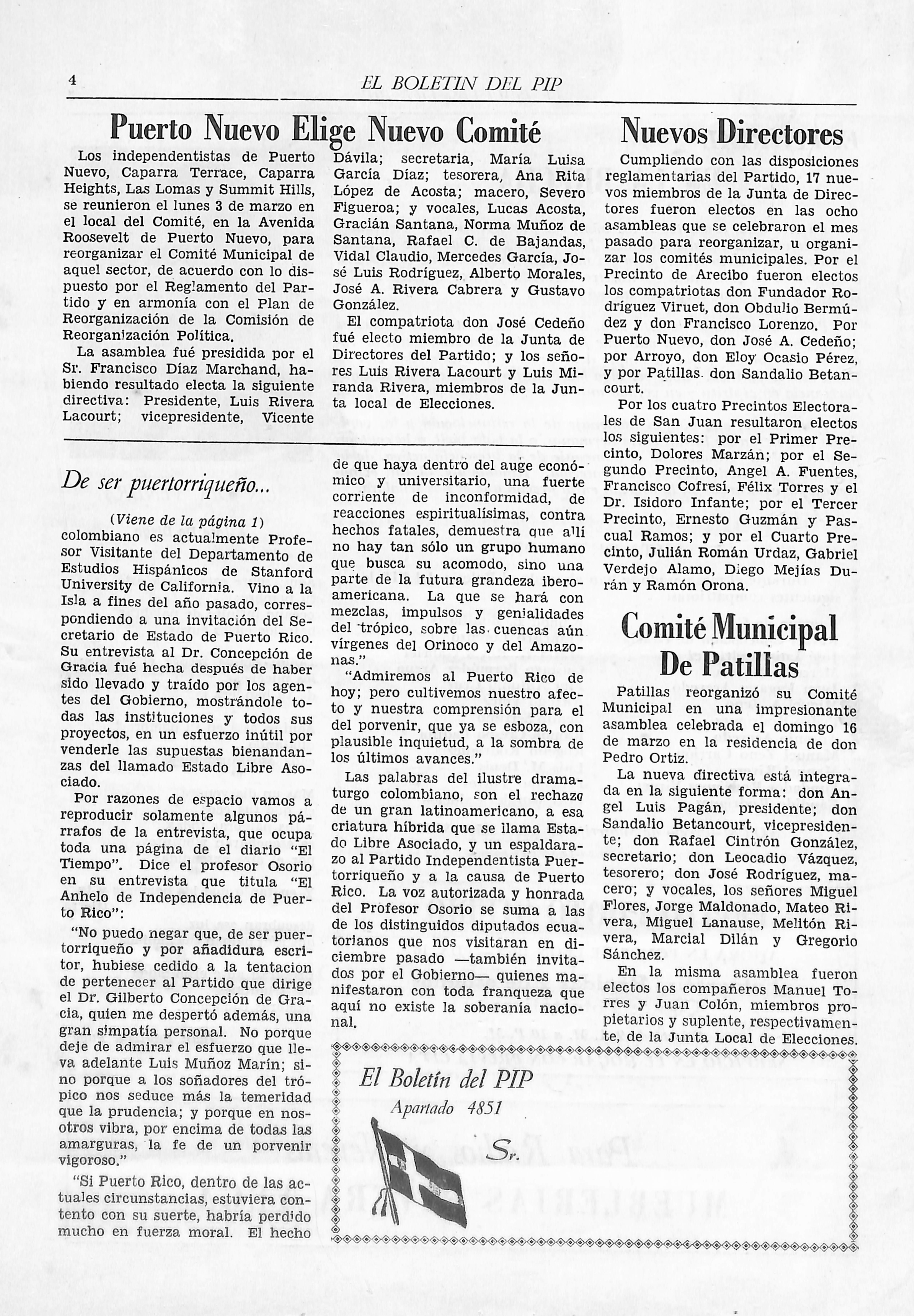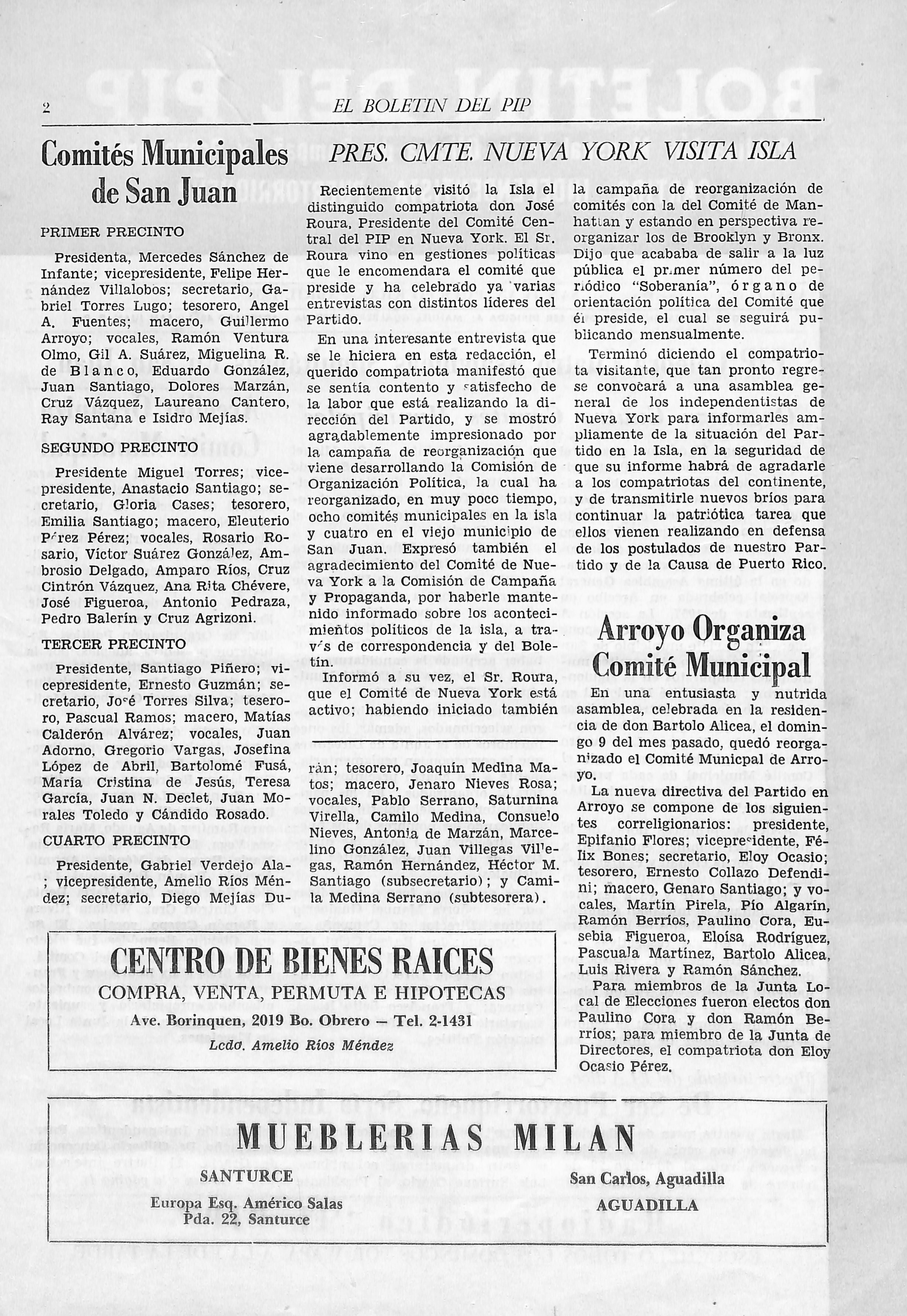 La misión del Boletín del PIP no será la de publicar artículos de fondo ni colaboraciones de propaganda; sino la de mantener informa dos a nuestros lectores, de todas las actividades desarrolladas por el Par tido durante el mes, a través de la noticia breve, sencilla y consisa. De esta manera, llevaremos la mayor información en el menor espacio po sible; economizando tiempo al ocupado lector y dinero al colaborador económico.