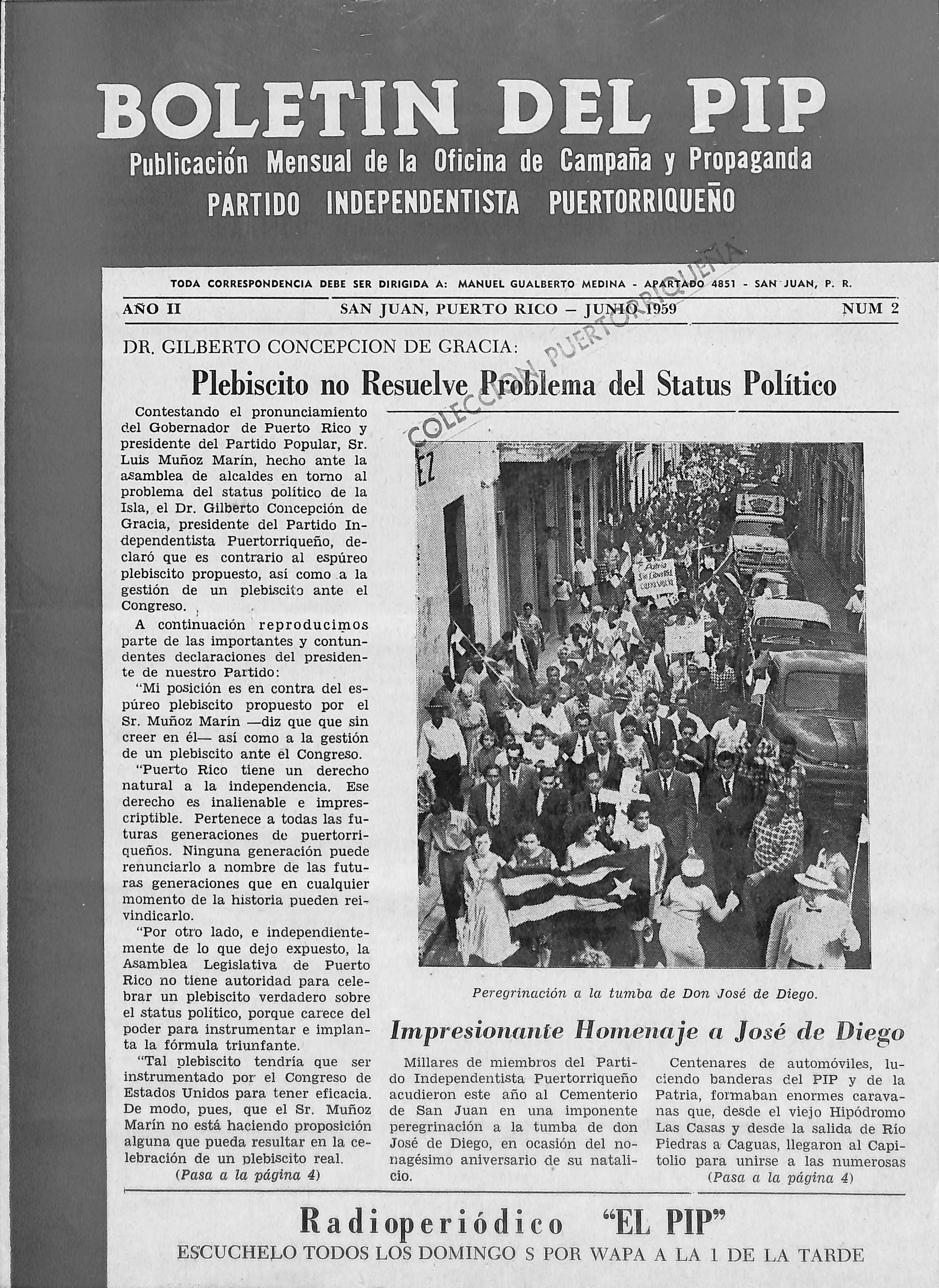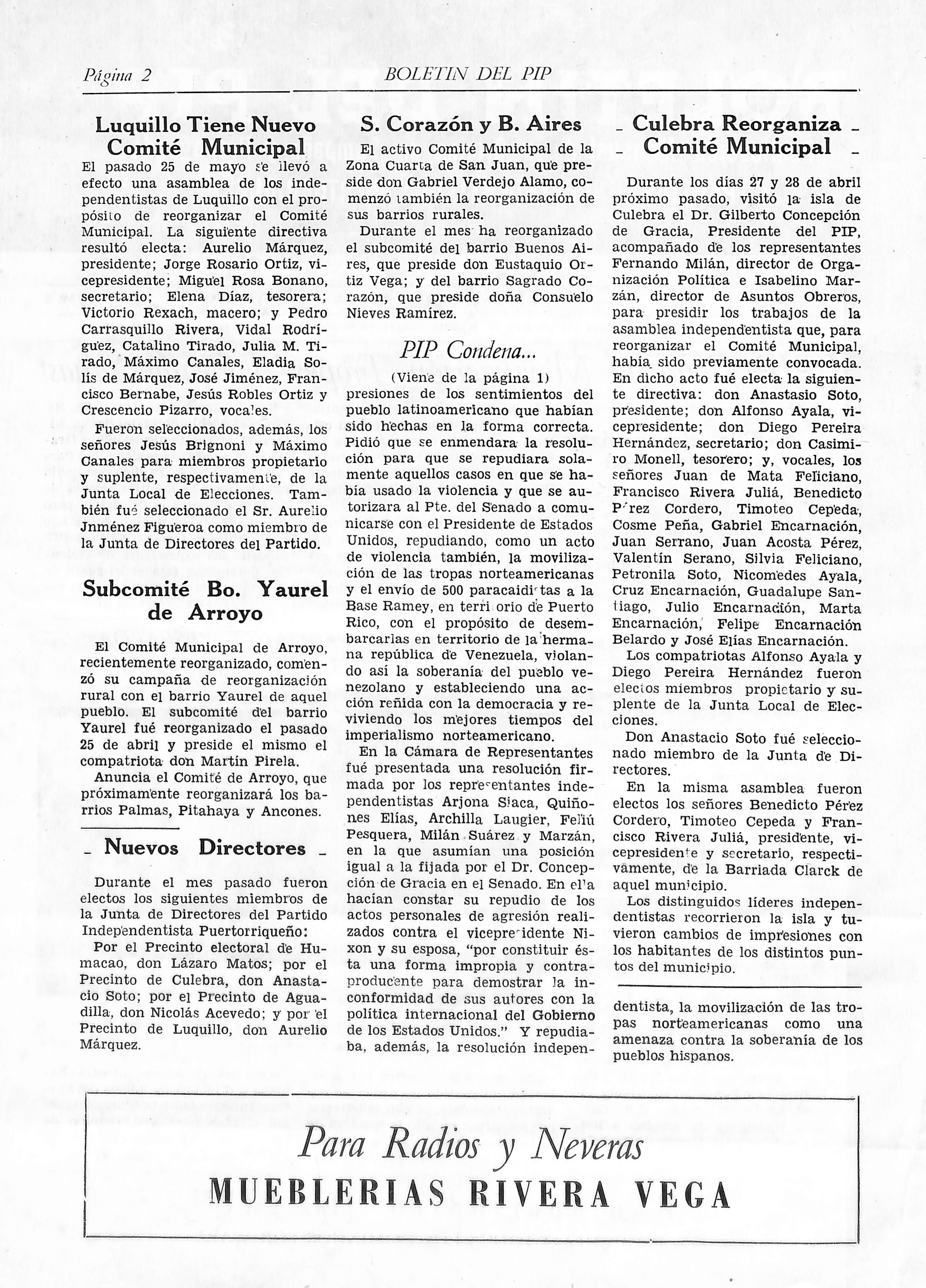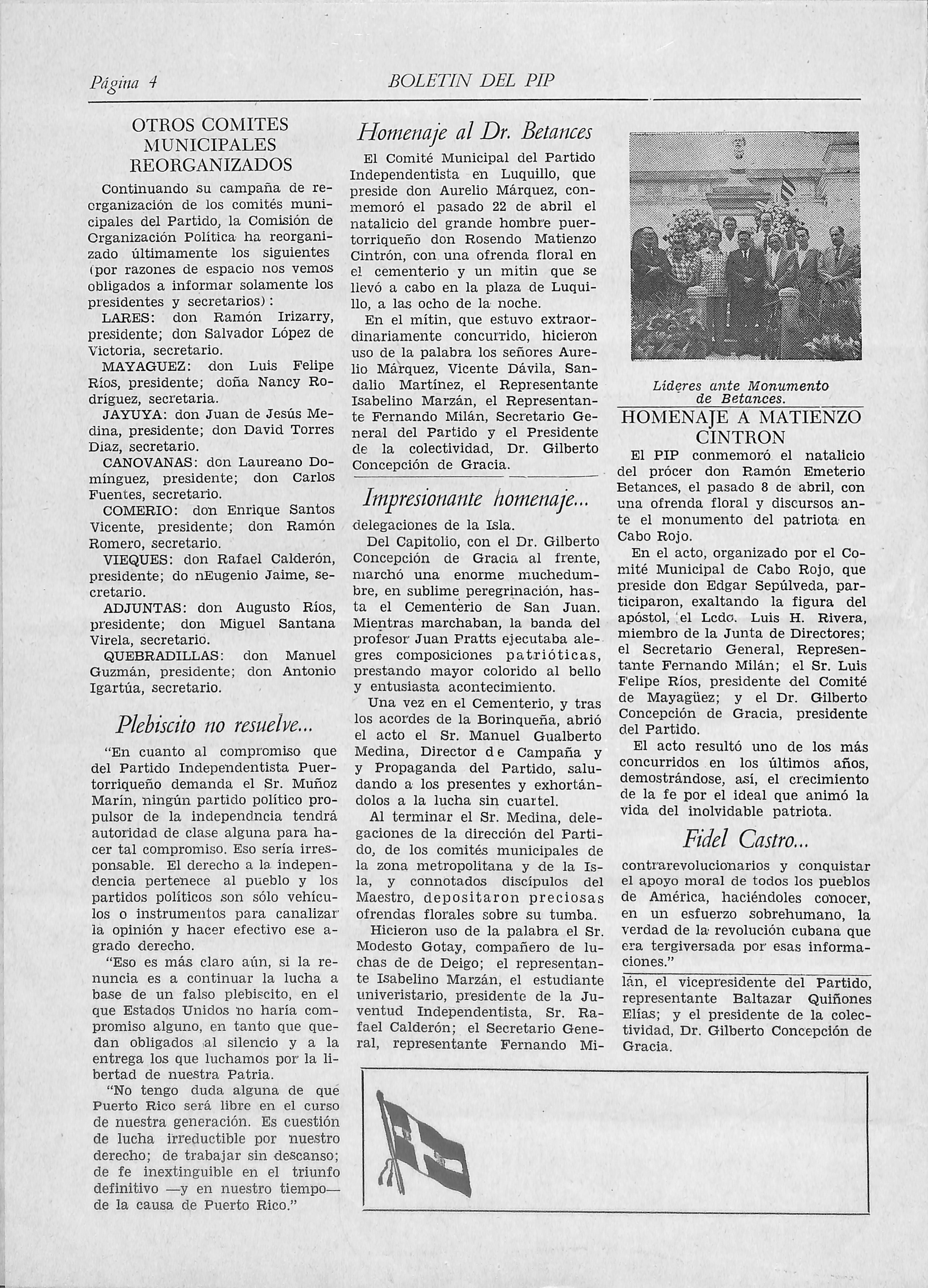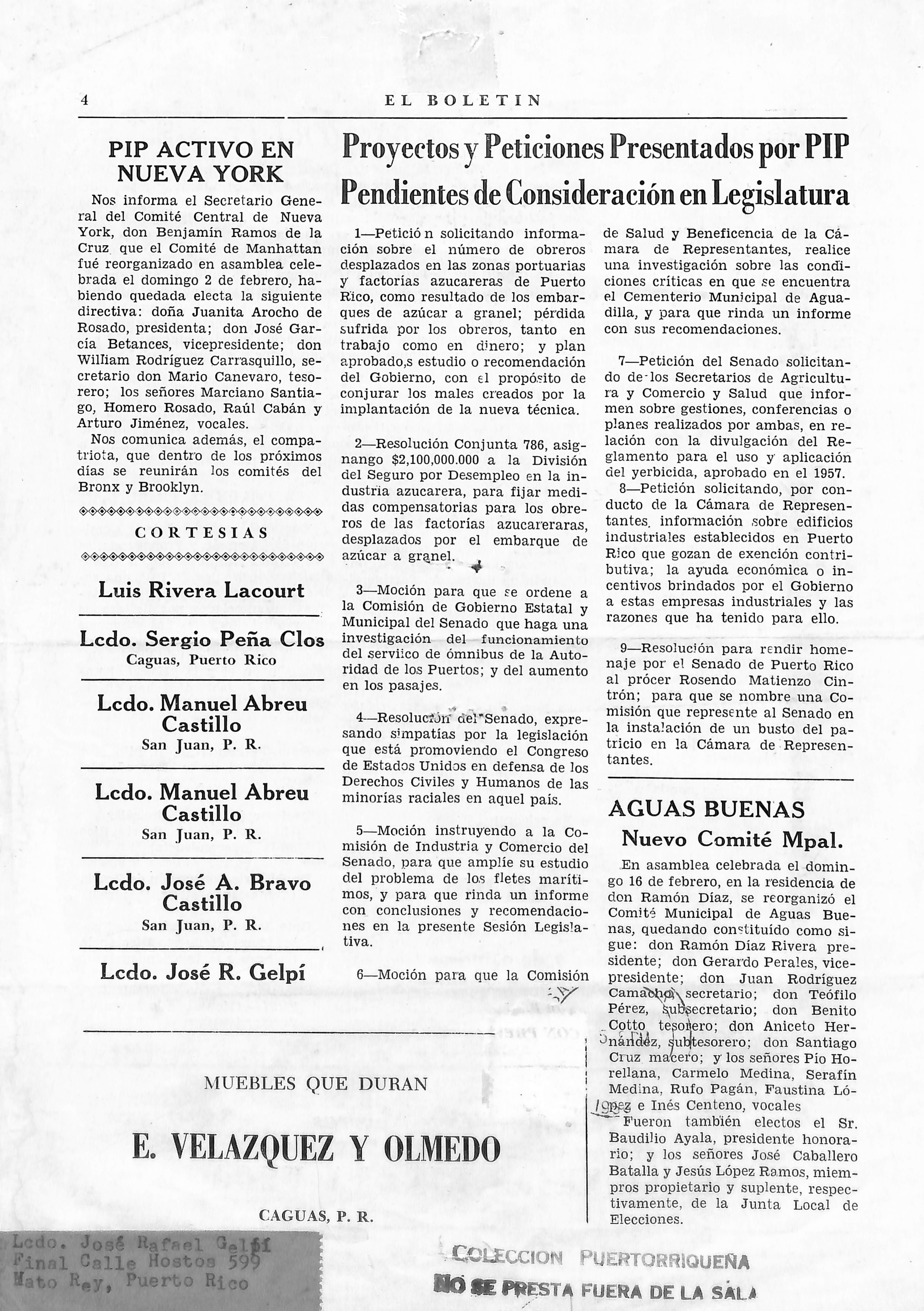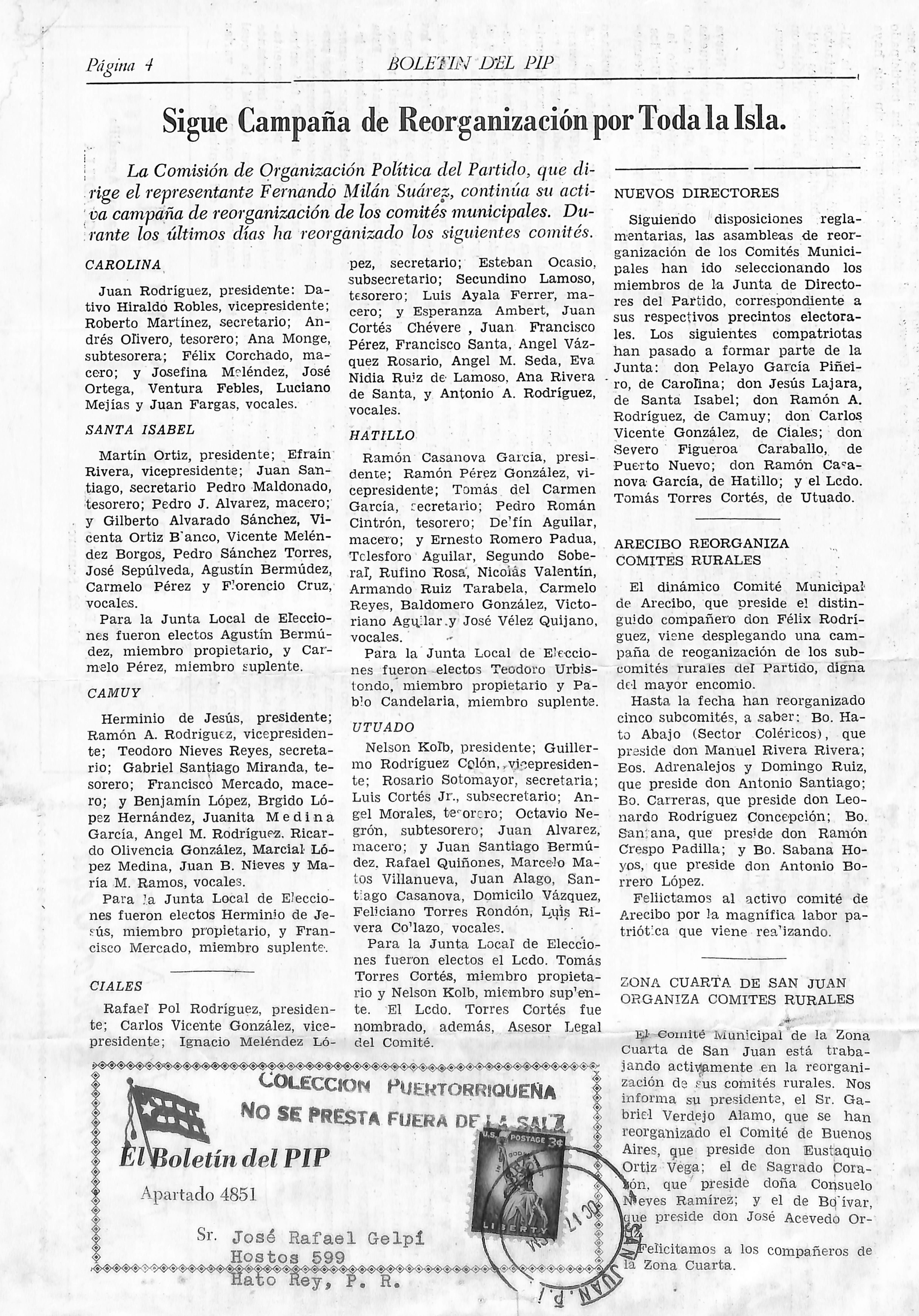 La misión del Boletín del PIP no será la de publicar artículos de fondo ni colaboraciones de propaganda; sino la de mantener informa dos a nuestros lectores, de todas las actividades desarrolladas por el Par tido durante el mes, a través de la noticia breve, sencilla y consisa. De esta manera, llevaremos la mayor información en el menor espacio po sible; economizando tiempo al ocupado lector y dinero al colaborador económico.