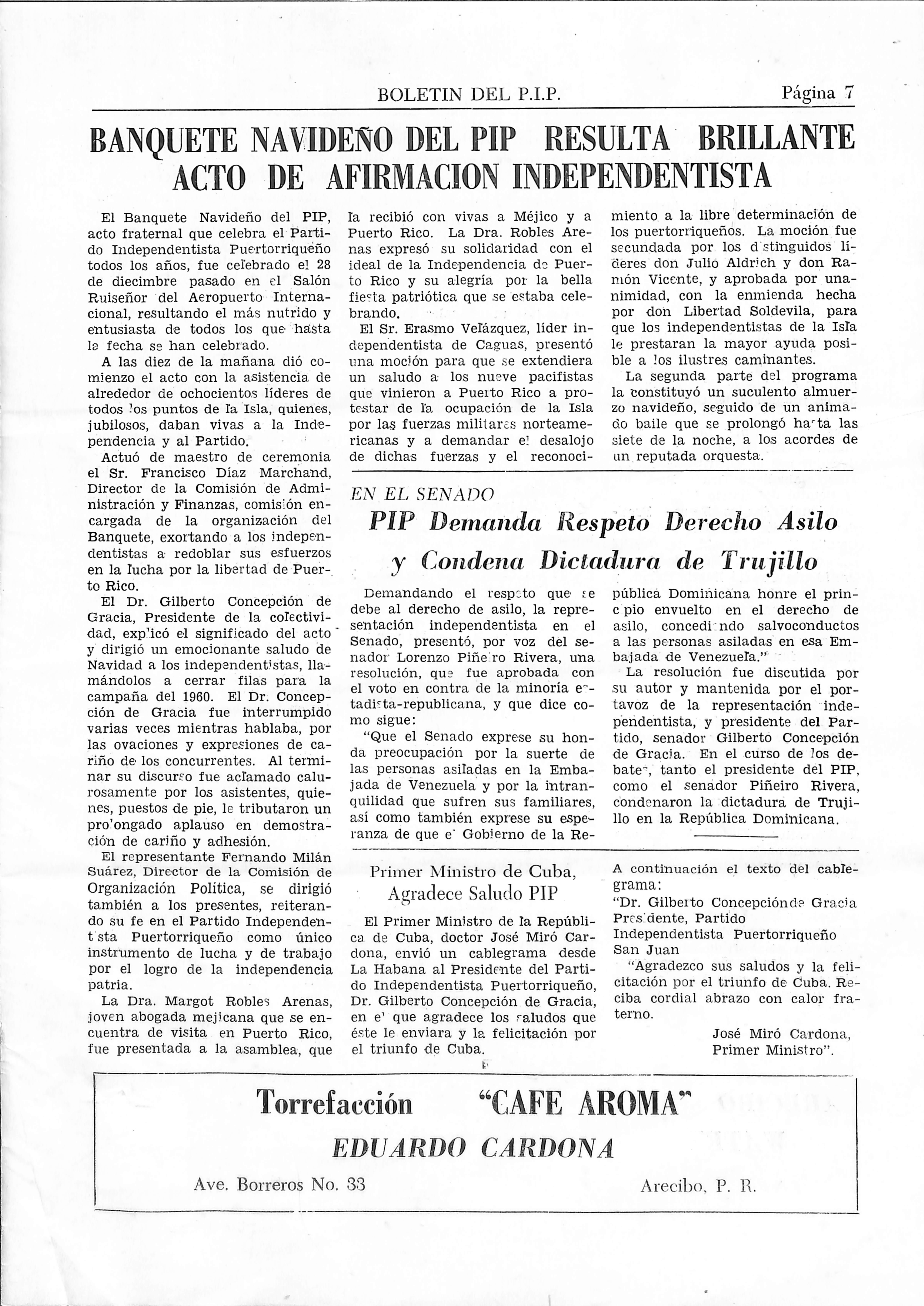 "El Dr. Fidel Castro y el pueblo de Cuba en general reconocen la noble actitud del pueblo puertorri queño hacia la causa de Cuba Li bre y agradece muy hondamente el Sincero pronunciamiento del Par tido Independentista Puertorrique ño cuando, por unanimidad, aprobó en su asamblea general en la ciu dad de Arecibo el 29 de septiem bre de 1958 la resolución de apoyo a la revolución cubana, apoyo con vertido en realidad a través de los Delegados que actuaron en su país; así como también el gesto de usted, como Presidente de ese Partido, al presentar proyectos de resoluciones de repudio al dictador Batista y apoyo a la Revolución y a la per sona de Fidel Castro, además de demandar el cese del envío de ar mas al primero."