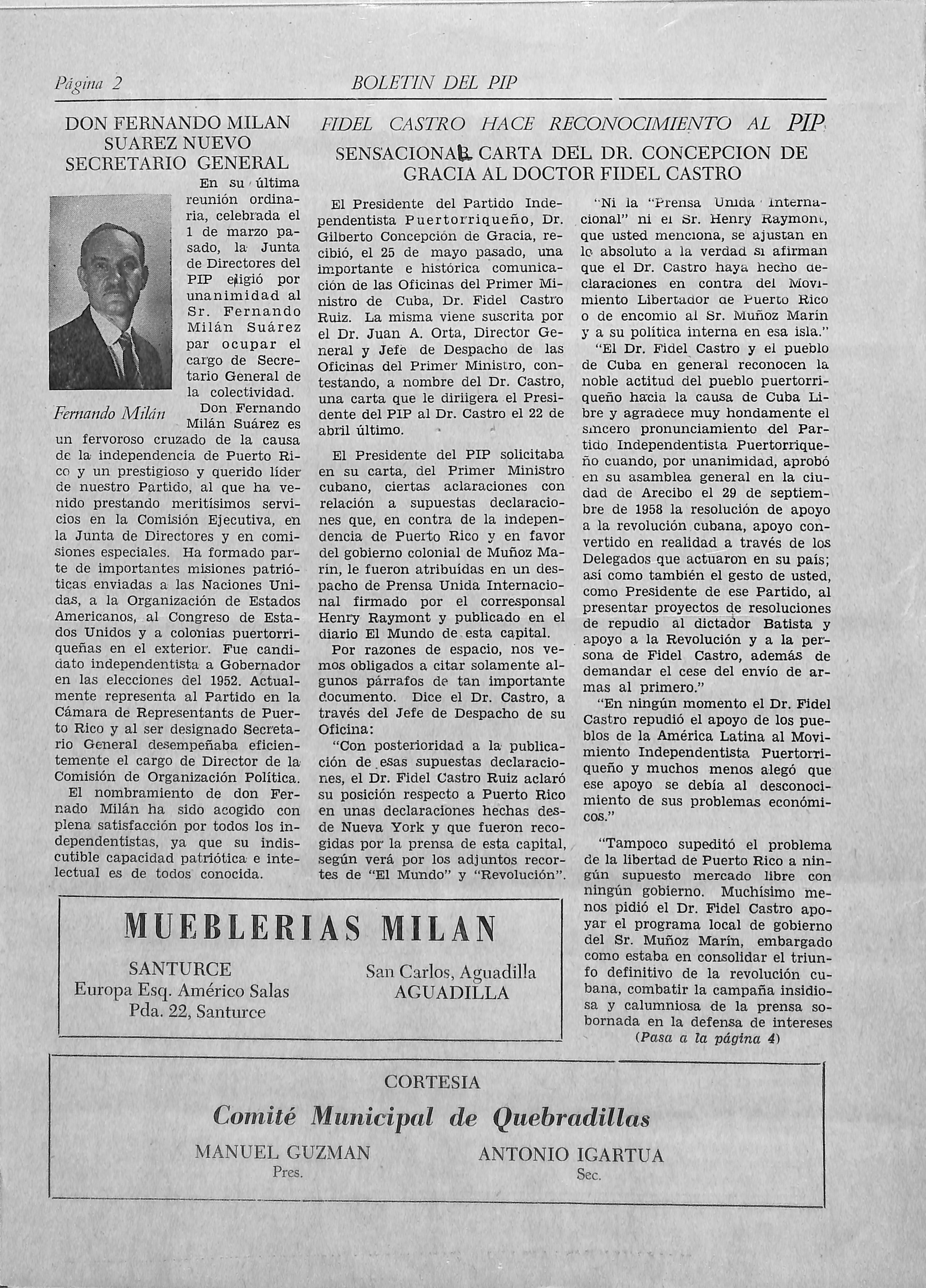 Femando Milán , Fernando Milán Suarez es un fervoroso cruzado de la causa de la independencia de Puerto Ri co y un prestigioso y querido líder de nuestro Partido, al que ha ve nido prestando meritísimos servi cios en la Comisión Ejecutiva, en la Junta de Directores y en comi siones especiales. Ha formado par te de importantes misiones patrió ticas enviadas a las Naciones Uni das, a la Organización de Estados Americanos, al Congreso de Esta dos Unidos y a colonias puertorri queñas en el exterior. Fue candi dato independentista a Gobernador en las elecciones del 1952. Actual mente representa al Partido en la Cámara de Representants de Puer to Rico y al ser designado Secreta rio General desempeñaba eficien temente el cargo de Director de la Comisión de Organización Política. El nombramiento de don Pernado Milán ha sido acogido con plena satisfacción por todos los independentistas, ya que su indis cutible capacidad patriótica e inte lectual es de todos conocida.