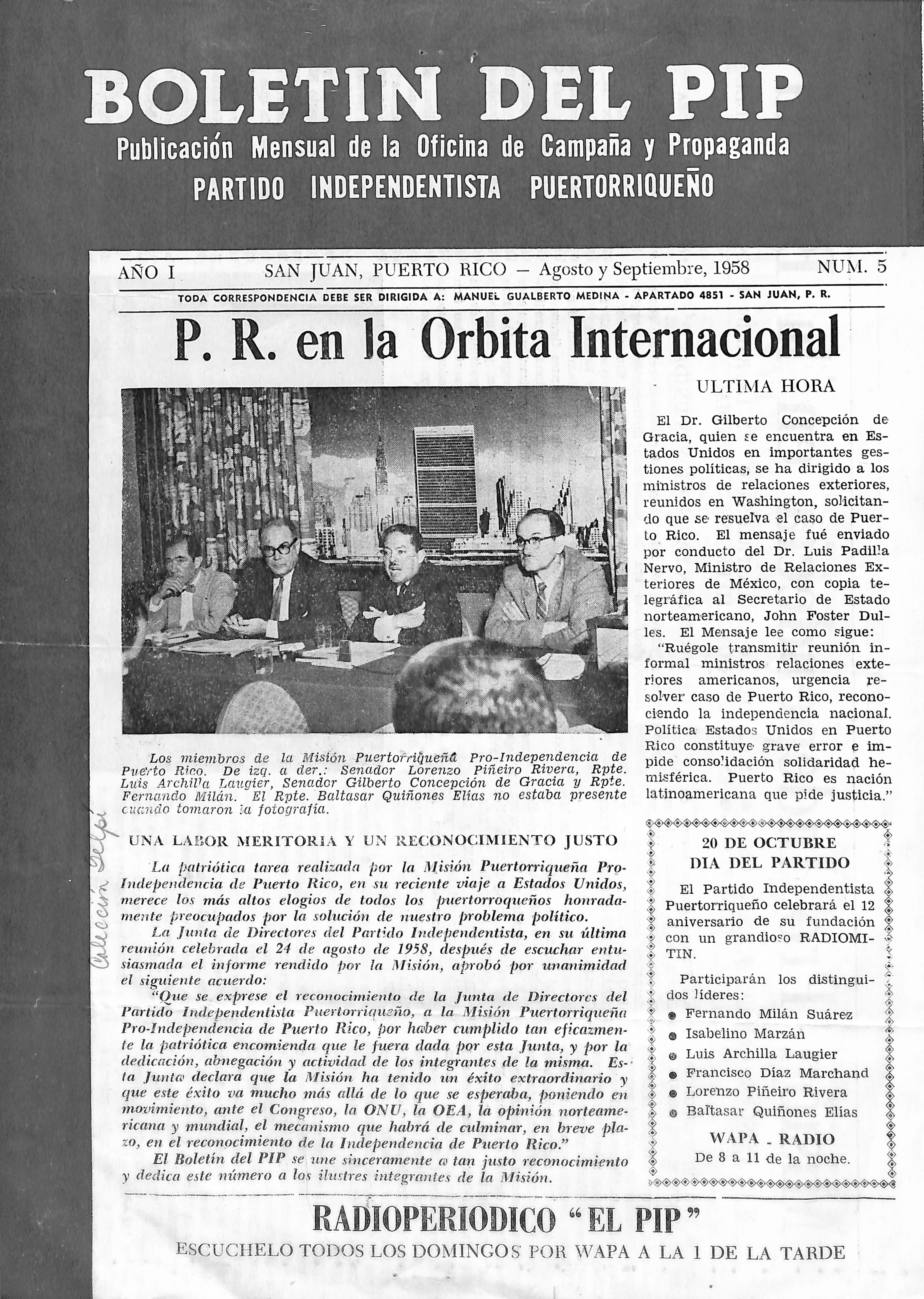 Con este primer número del Boletín del PIP, iniciamos la publi cación mensual de una hoja informativa que circulará entre el liderato del Partido Independentista Puertorriqueño. Llenamos así una necesidad larga y hondamente sentida por nuestra colectividad; y lo hacemos en el preciso momento en que la Comisión de Organización Política ha declarado abierta la campaña de 1960.