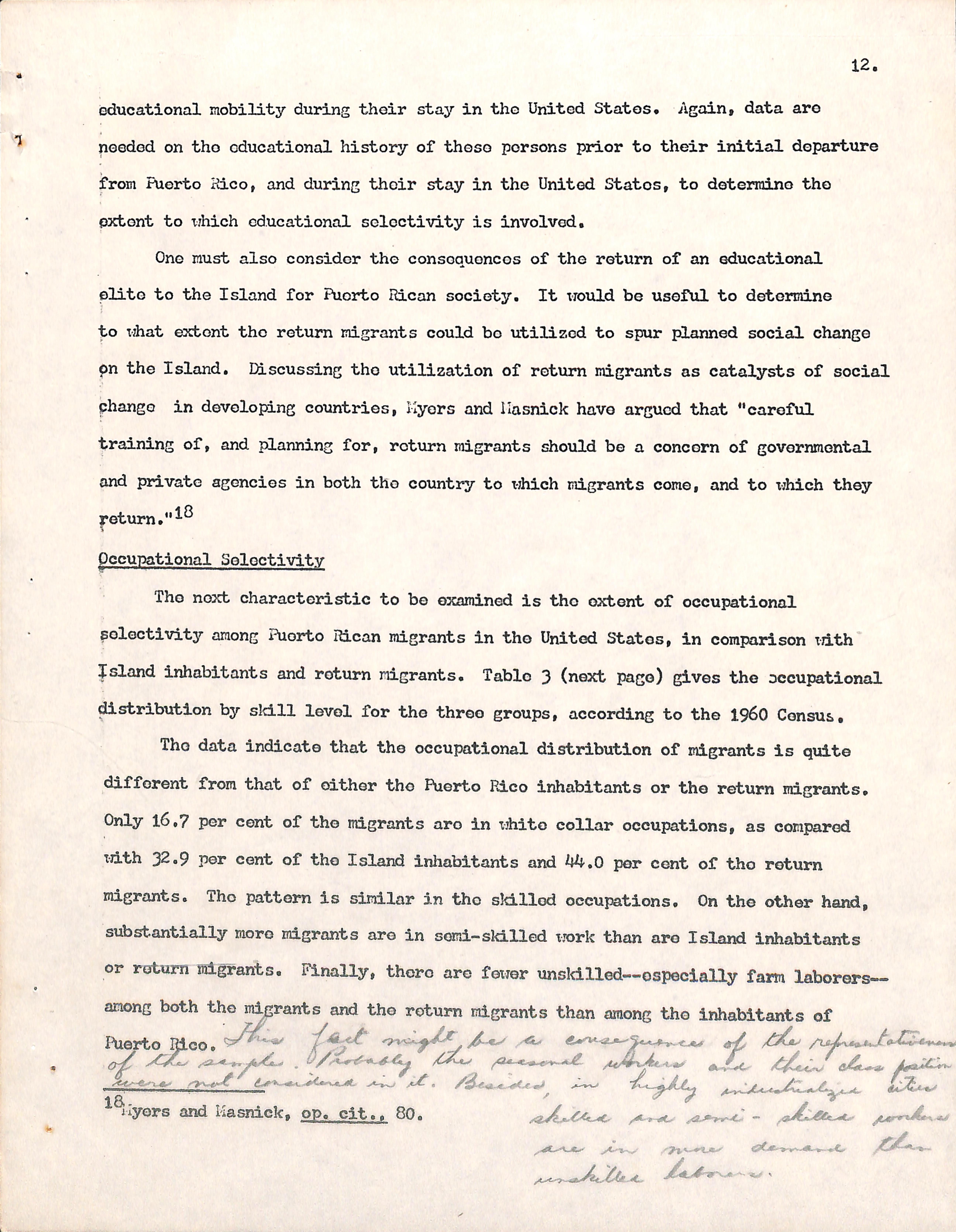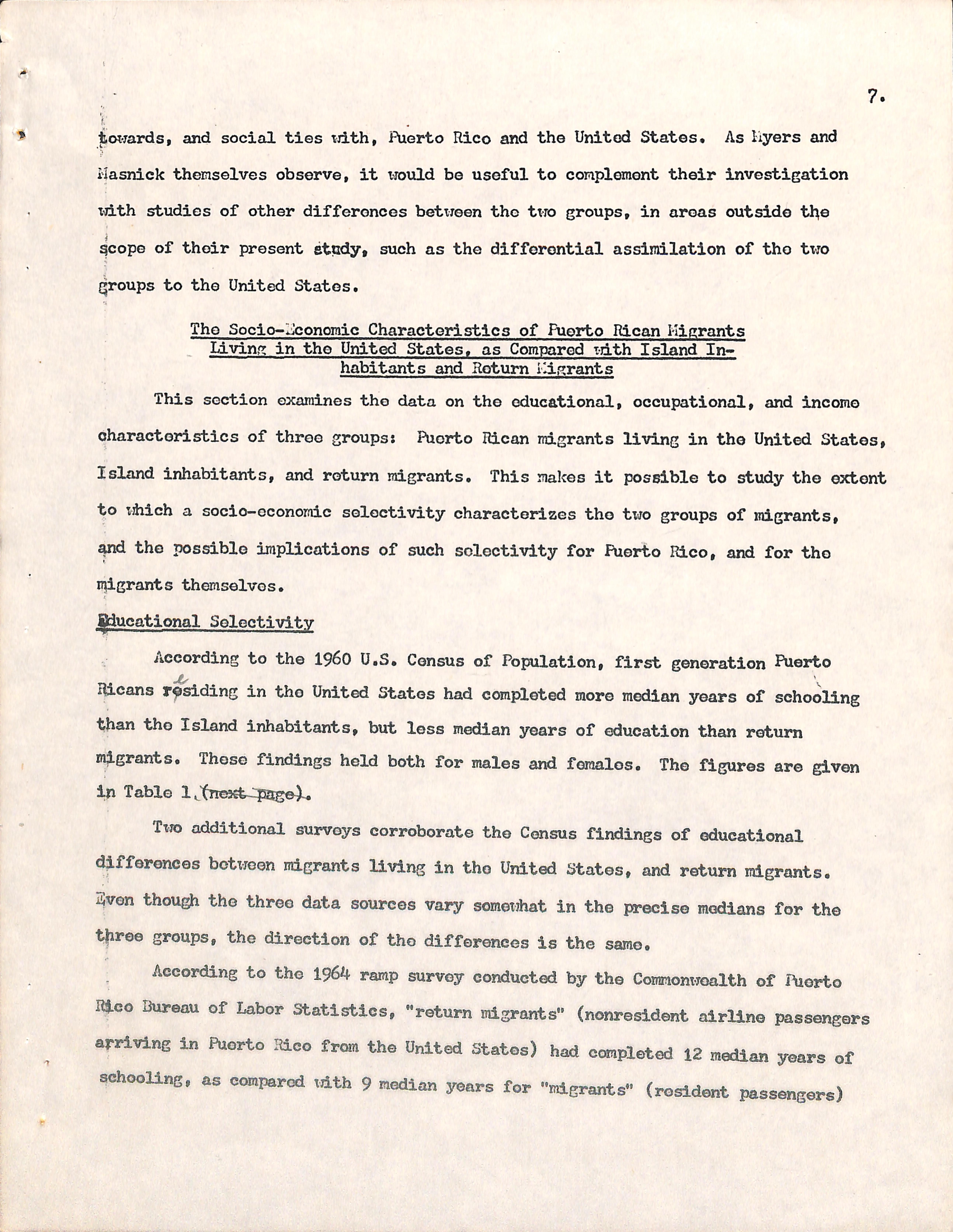 Return migrants living in Riorto Rico havo more yoars of schooling completed, a larger proportion of persons in xdiito collar occupations, but lower incomes, than Riorto Ricon migrants \ho sottlo dotm in the Unitsd Statos. Kowovor, data are noodod about tho educational, occupational, and income history of those rotxim migrants, to dotemino xiiethor they are different in this respect from migrants xiio stay in the U. S, alroadj*- prior to departure from Puerto ?dcc, or xiiothor those differences aro the result of thoir varying caroors in tho United States.