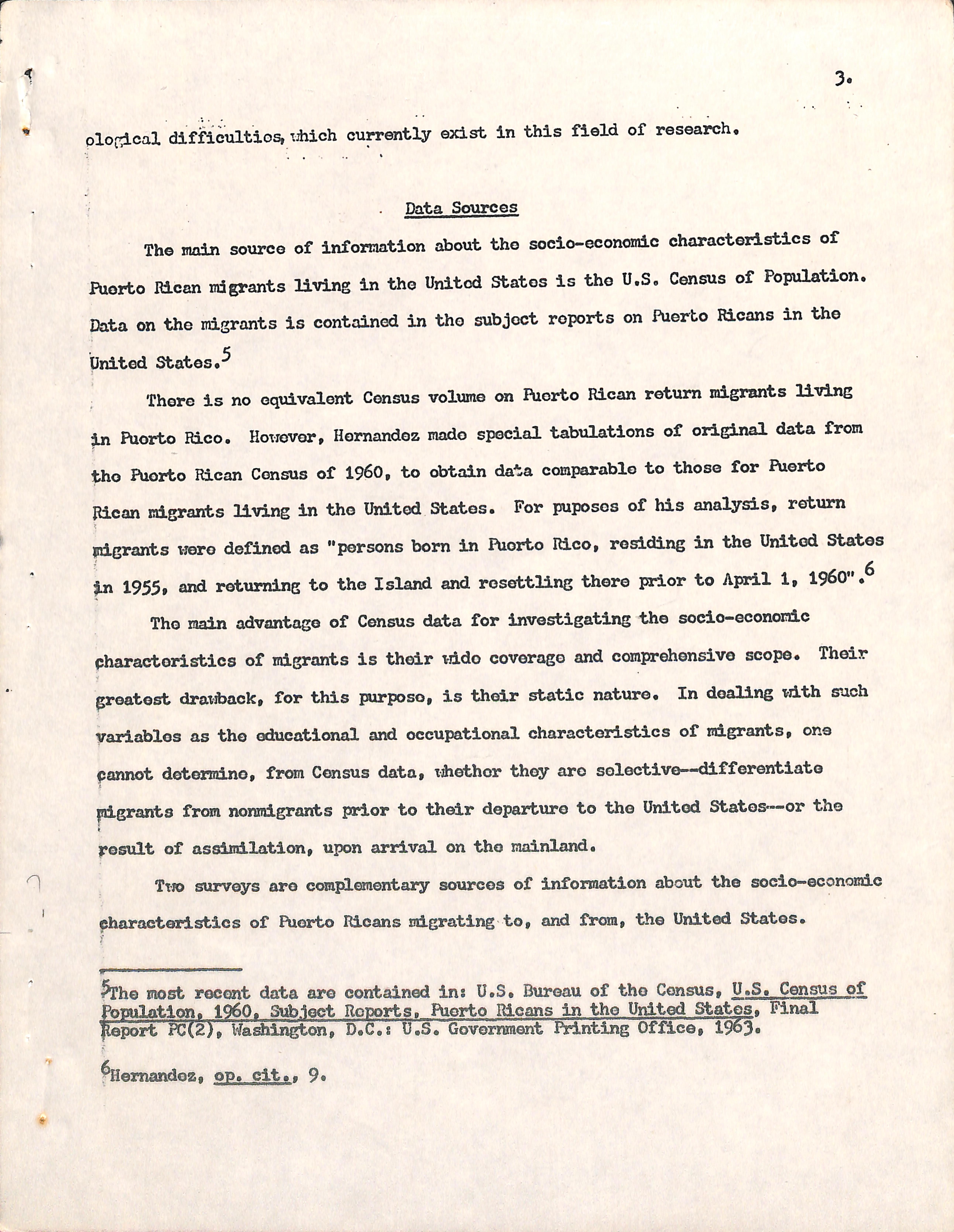 The Census, the ramp sur\'oy, and the household survey are the three major sources of infonnation about tho socio-economic characteristics of Puerto Kican n^lgrants to, and from, the United States. Although each source provides valuable information bearing on migration, each has methodological limitations which hamper an evaluation of tho cocio-econoraic selectivity of migrants. The ramp survey does not distinguish clearly between migrants and cthor air passengers. The household survey does not include information on migrating households. Aiid the Census provides ttiT.y static data on the characteristics of migrants.