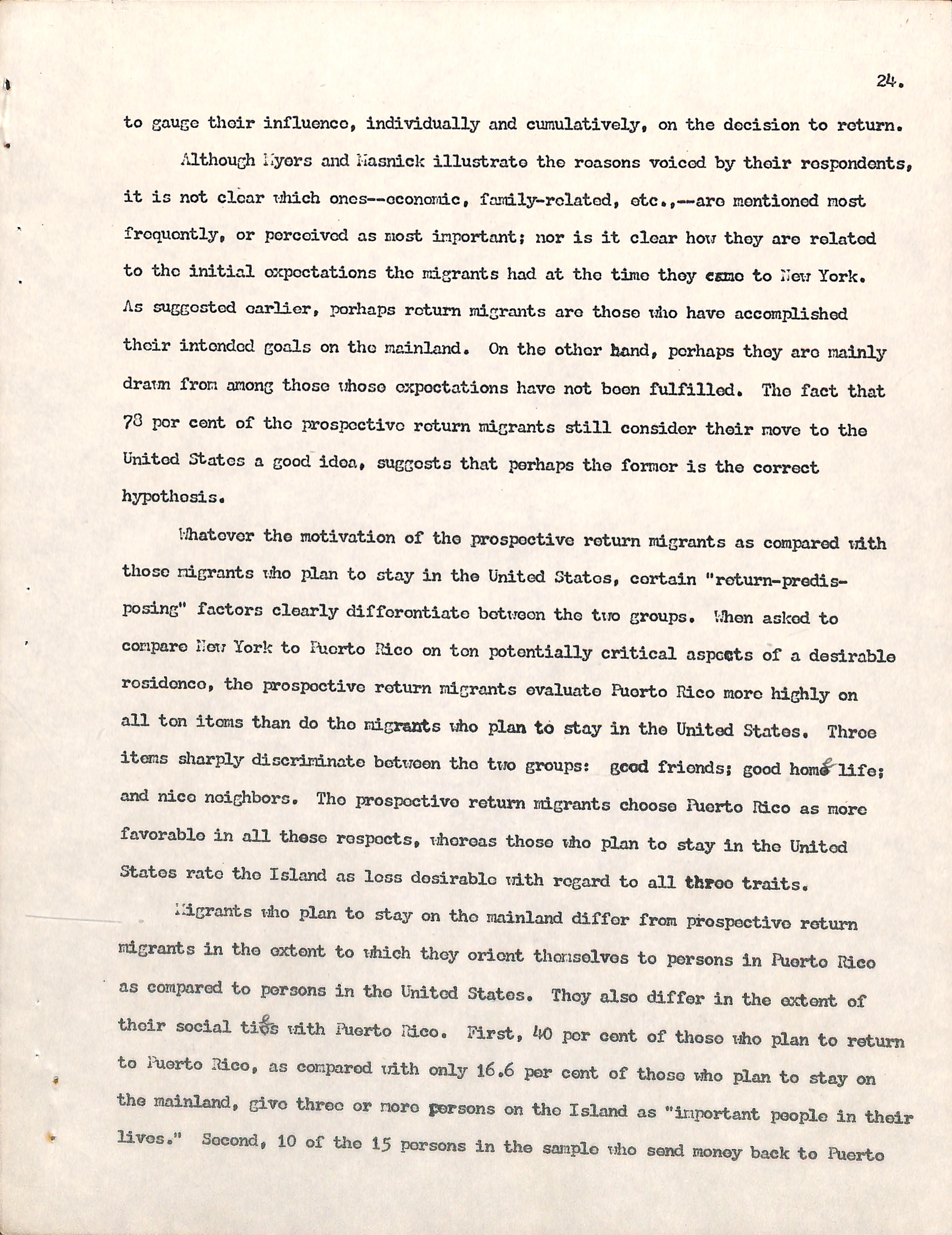 To summarize, liyors and Ilasnick's findings shovr that tho stronger the migrants* social and psychological ties to Puerto Rico, tho more predisposed they are to return to Puerto Rico. Future studios need to escamino upon ^hich contingencios, such as job opportunities in rboito Hico, tho activation of these pre dispositions to return depends.