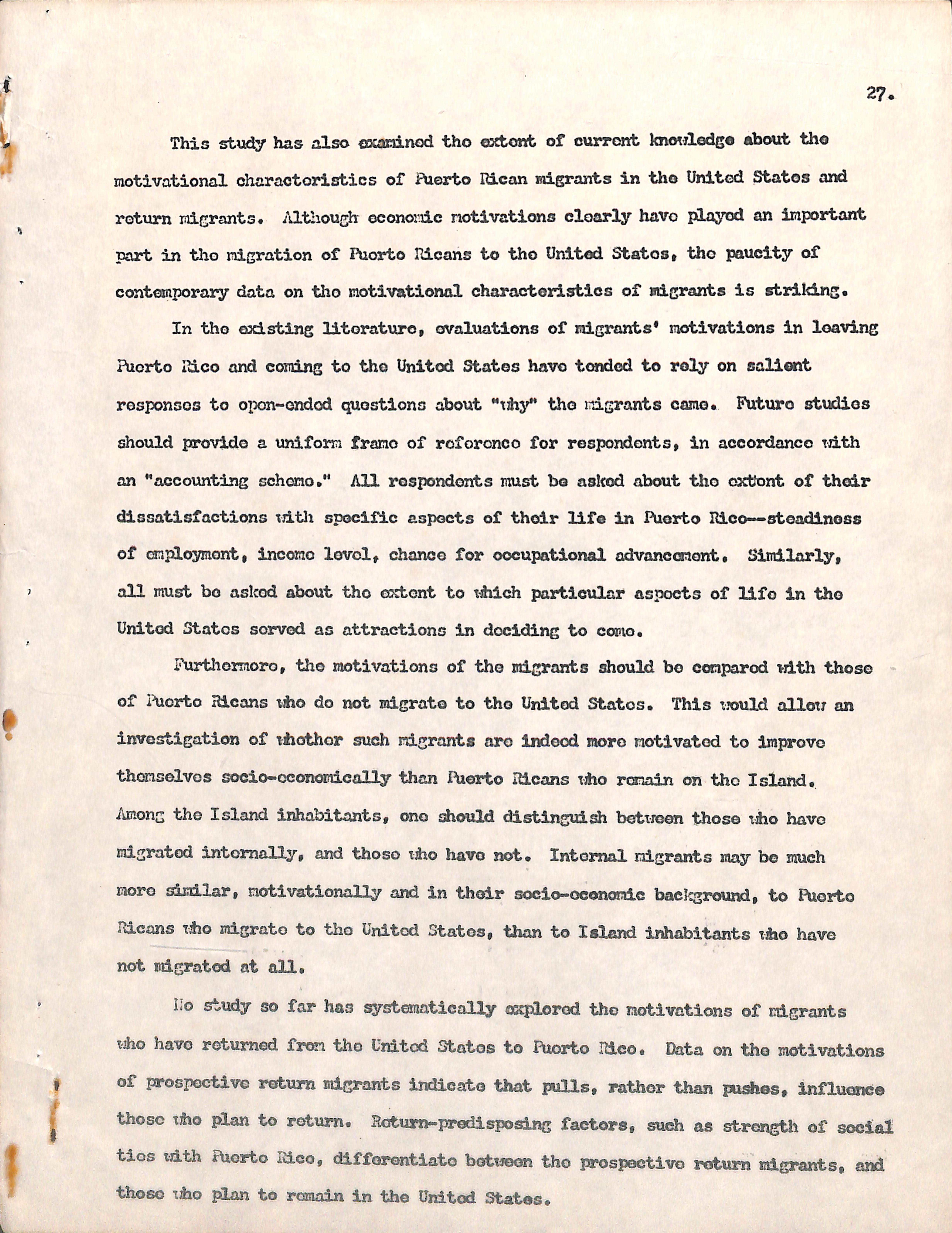 This study has also eocardnod the osctonb of current knmrledge about tho motivational characteristics of fberto Rican migrants in tho United States and rotiurn migrants# /J-though economic motivations clearly have played an important part in tho migration of Puerto Fdcanc to tho United Statest the paucity of contemporary data on tho motivational characteristics of migrants is striking.